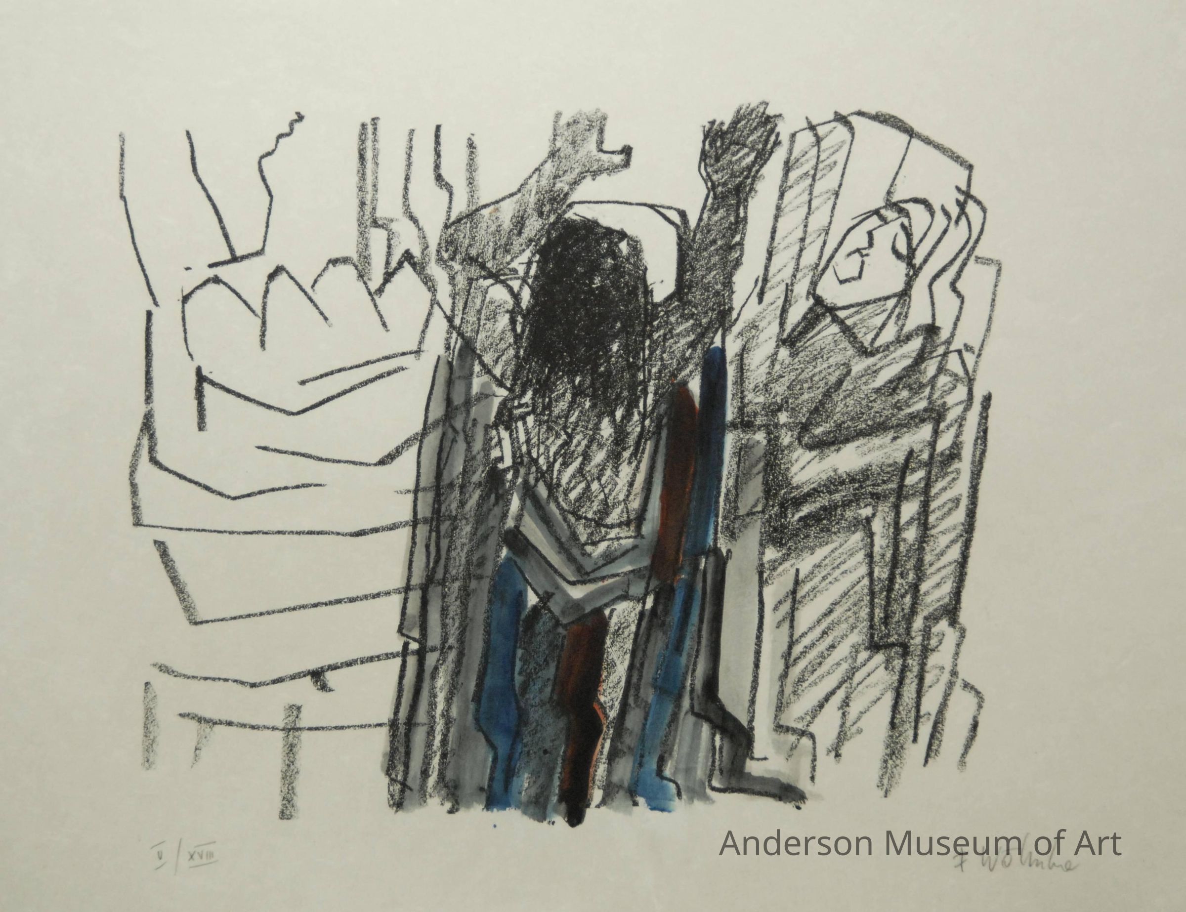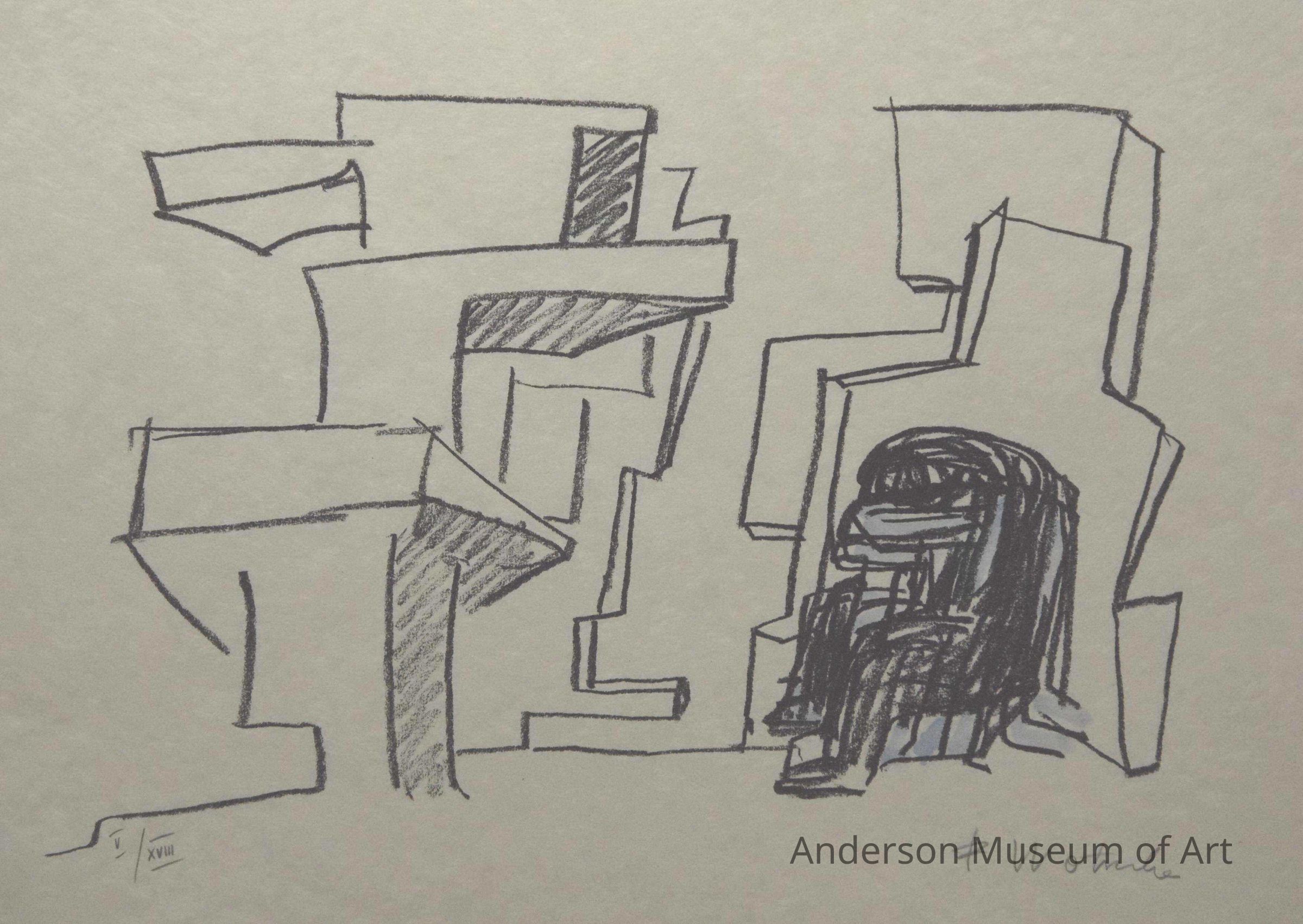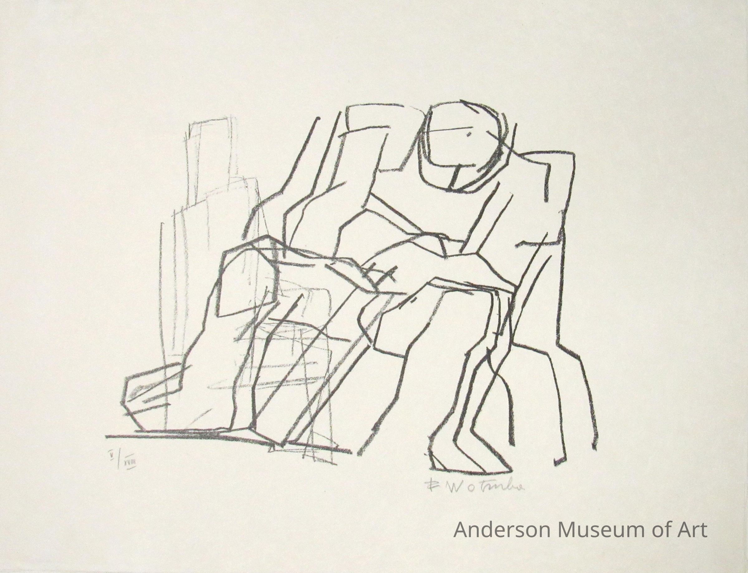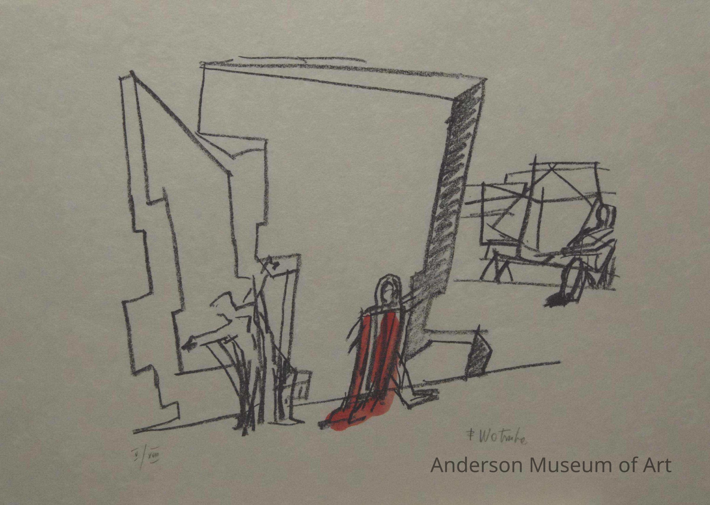 1979.16.1.1 - Image that of a minimalist urban setting. Left-hand pictorial plane formed by an apartment-like structure consisting of an assortment of geometric shapes aligned vertically on the horizontally aligned paper plane. The right side portion of the picture plane consists of two distinct apartment house-like structures in the distance; the like left hand apartment house-like structures, the right-hand structures are vertically aligned. In the foreground on the right side appears a human-like image suggestive of a man or woman sitting down--there may be more than one figure here. The head (or heads) is drooping perhaps to suggest sorrow or remorse. The image appears to have been drawn in with thick, black crayon lines. The figure is hand-colored in a pale blue wash. Below the seated figure appears the artist's signature "F. Wotruba." In the lower left corner written in pencil is the inscription "V/XVIII." Paper appears to be Japanese rice paper but bears no manufacturer's watermarks.