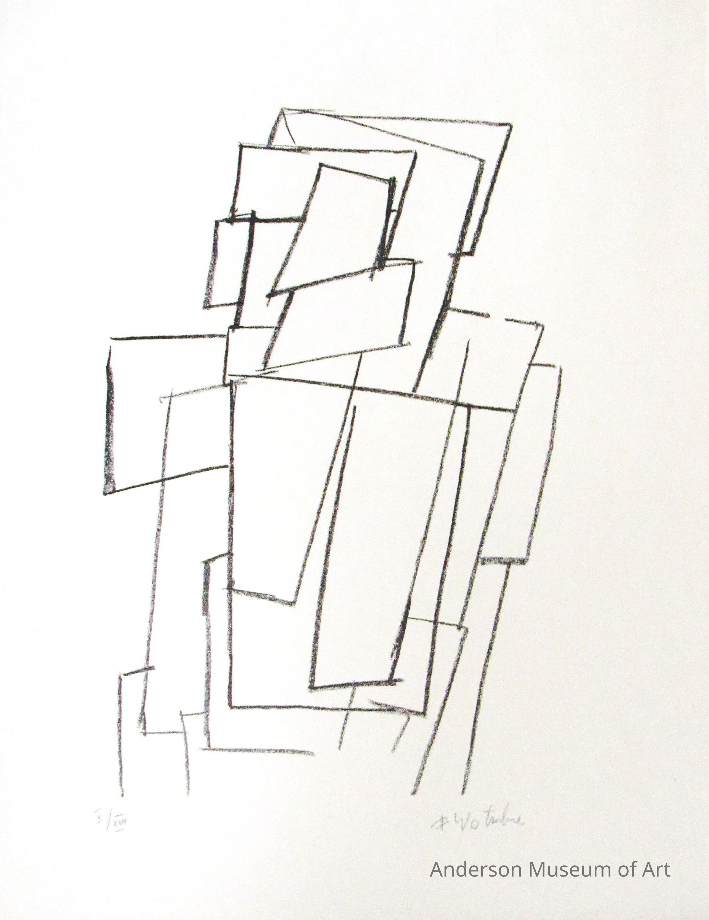 1979.16.1.14 - Building like structure made up of rectangles, some slightly warped. The rectangles are layered upon one another, most with the long edges running vertical. The rectangles that make up the bottom have no bottom line. Drawn in only black lines. Print 5/18.