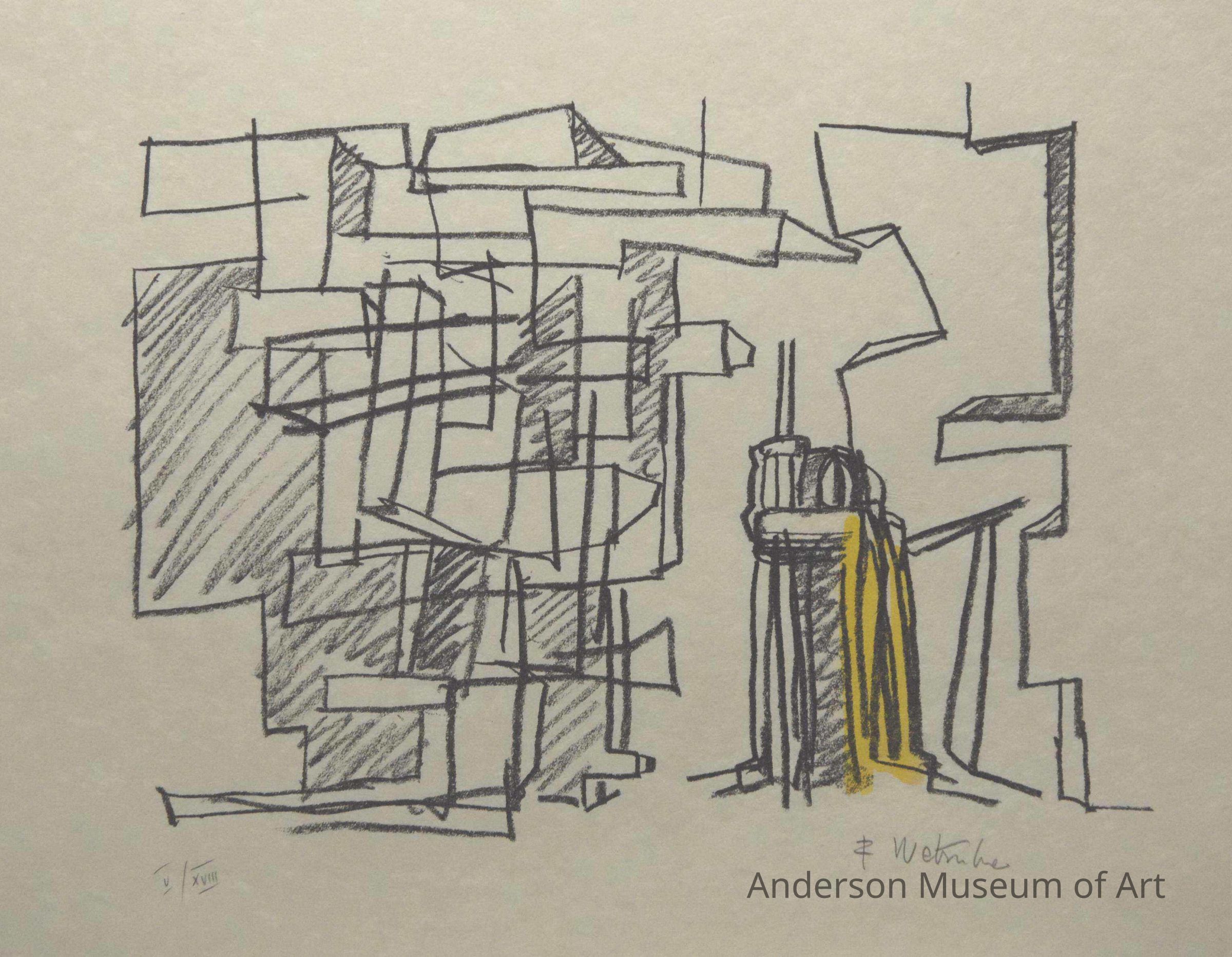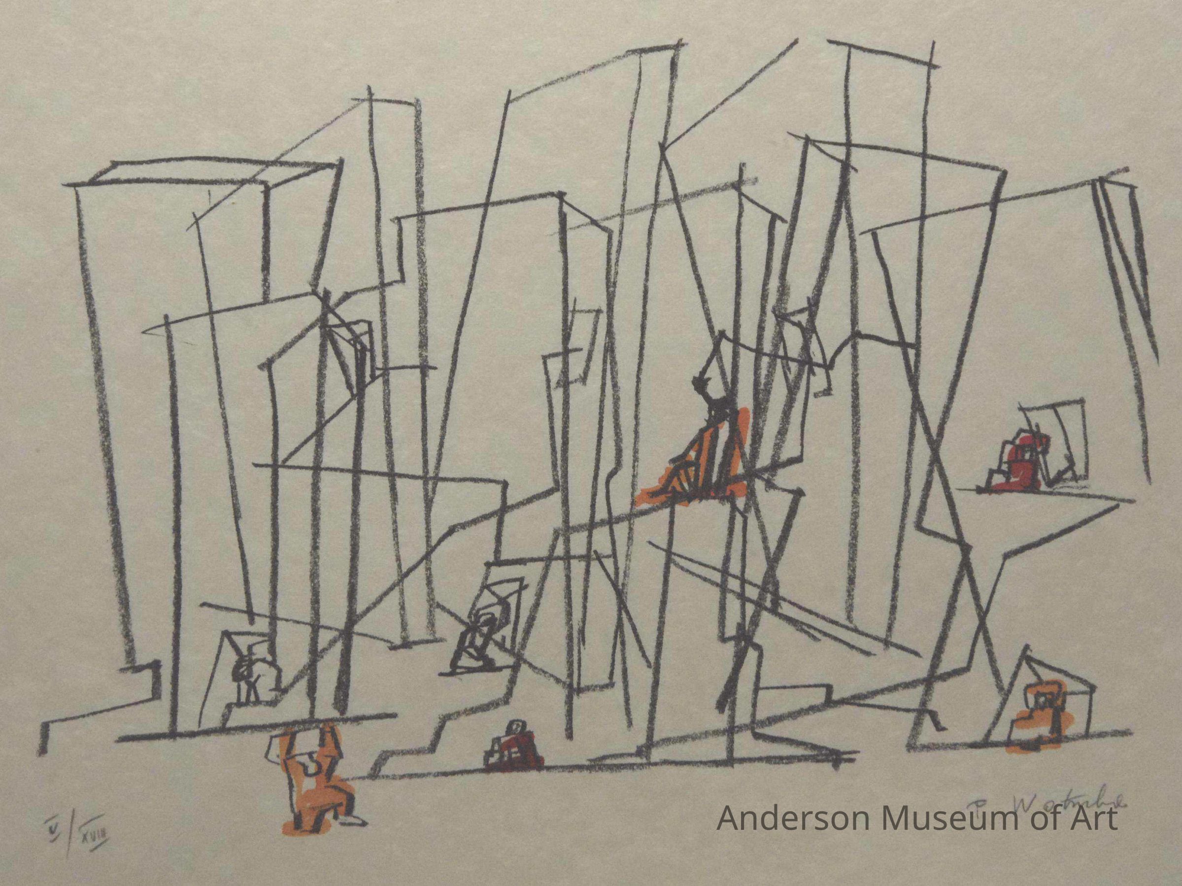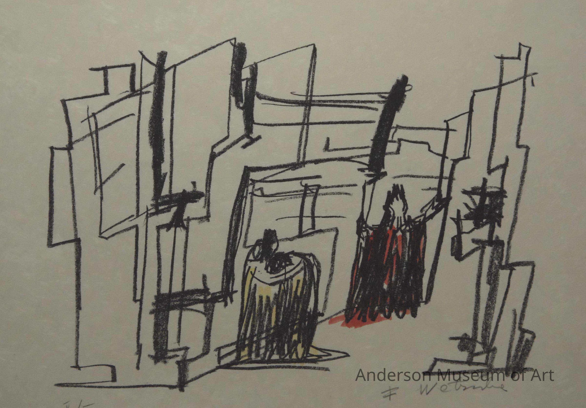 1979.16.1.3 - Image horizontally oriented on sheet. Central image consists of abstracted human figures in immediate foreground and geometrically abstracted urban setting in the background. Two human figures are present. One appears at the back central of the pictorial place and is wearing a cape in hand-painted yellow. The other figure appears at the back right part of the picture plane and also appears to be wearing a cape that is hand-painted in red paint. The background consists of vertical, horizontal and diagonal likes that are suggestive of an urban environment. Lines are drawn in what appears to be black crayon and have a sketchy nature to them rather than being exact. The artist's signature "F. Wortruba" appears in the lower right corner and "V/XVIII" is printed in the lower left corner in pencil. The paper bears no watermark and appears to be Japanese rice paper.