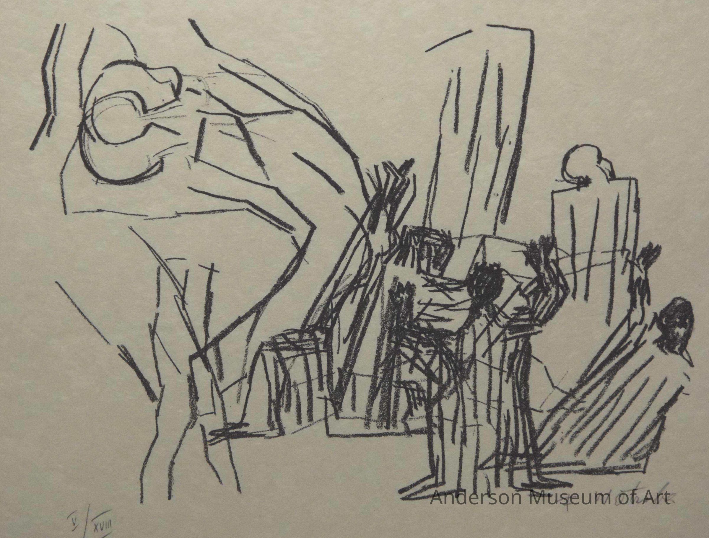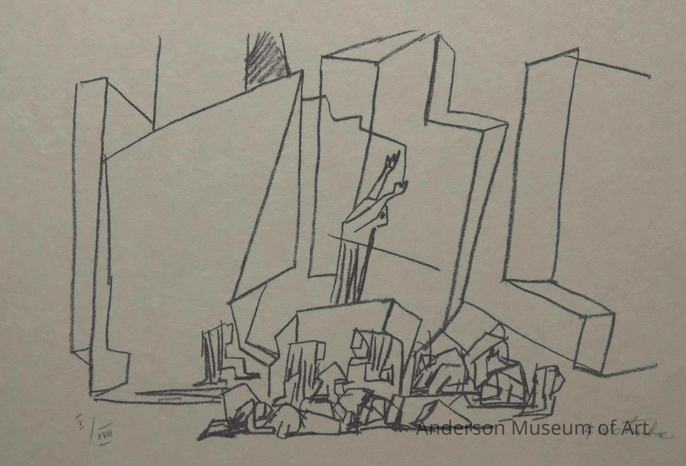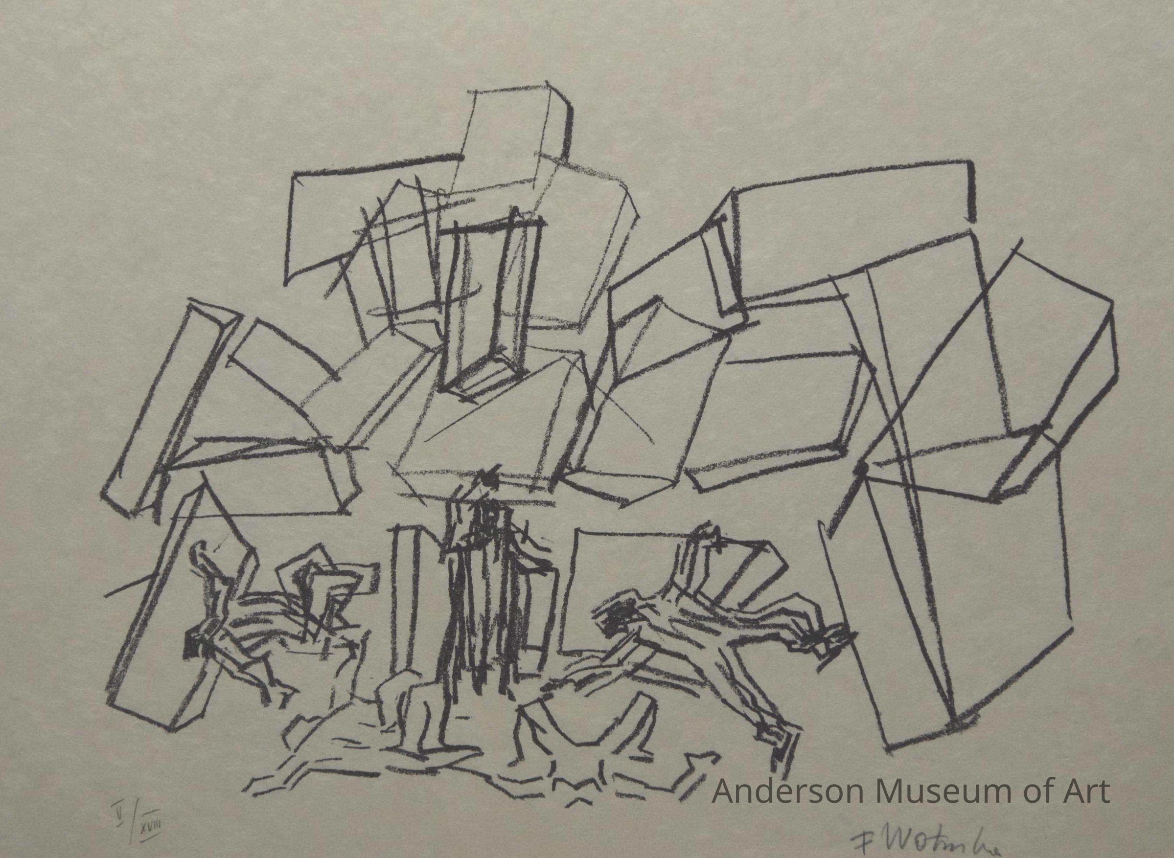1979.16.1.4 - Image is a contour drawing executed in black. The image consists of background geometric forms that are suggestive of an urban setting or urban ruins. Geometric forms, mostly rectangular in shape appear in drastic disorder heaped atop one another as if piled rather than intentionally constructed. The foreground consists of five human forms. Two appear to be lying in prone position with legs bent at the knees; the left figure is facing the viewer while the right had his head toward the viewer. In back of these forms are three more human forms located in the lower left, lower center, and lower right corners. The lower left figure is prone, arms extended and knees bent. The lower center figure is standing upright and appears to be wearing a cape. The lower right form appears to be reclining on a rectangular geometric form with arms and legs extended. The paper bears no watermark. "F Wortruba: is written in pencil in the lower right corner and "V/XVIII" is written in pencil in the lower left corner.