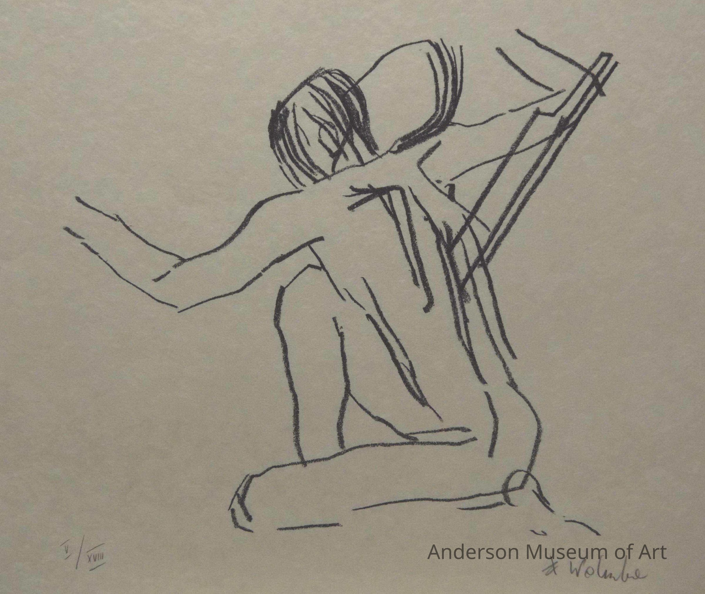 1979.16.1.6 - Naked female figure with her back to the viewer and her right leg up to her chest. Her left arm is reaching left and her right arm is behind her. There is a round shape on her right shoulder and what looks like a piece of wood going in her back. Print 5/18.