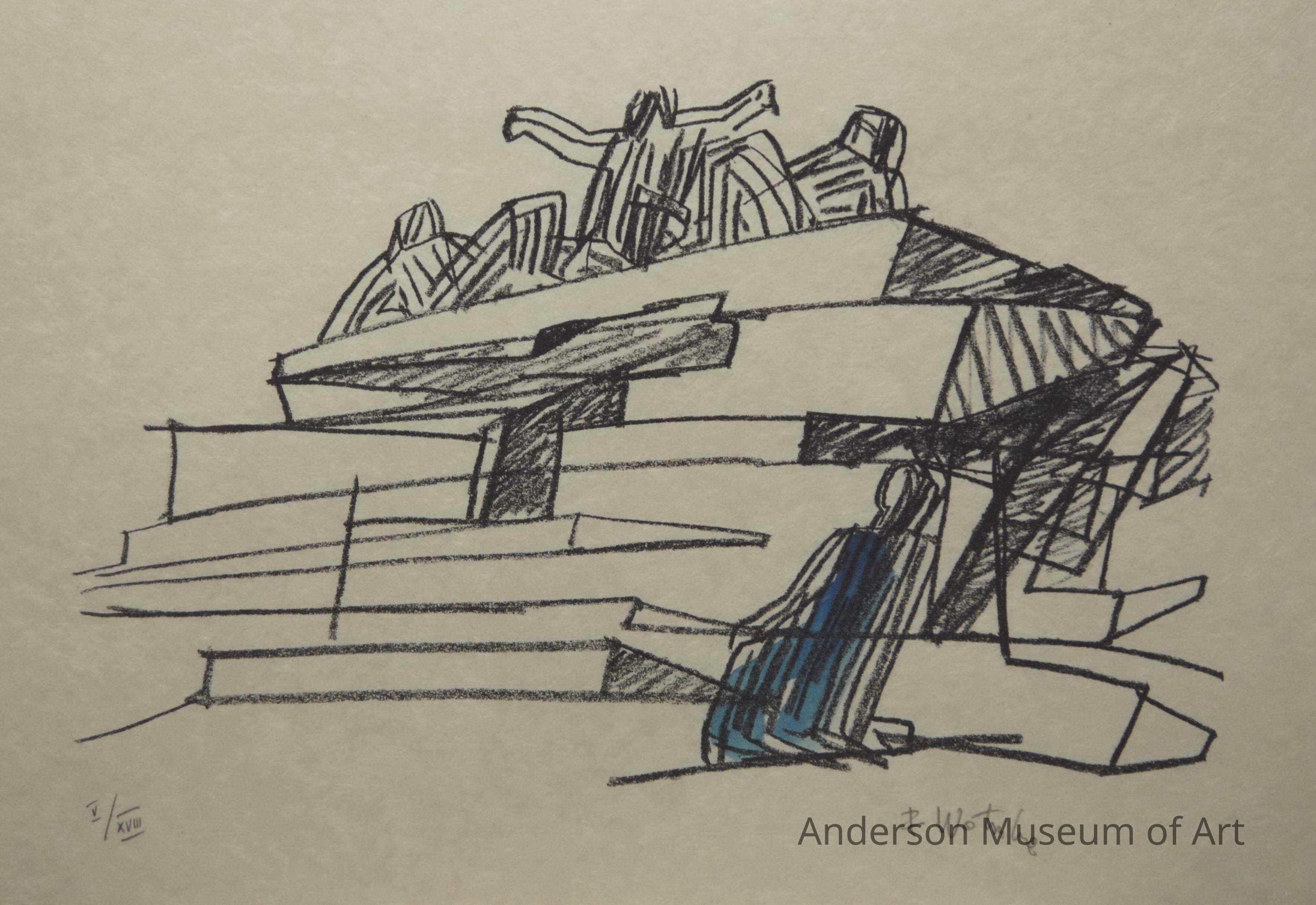 1979.16.1.10 - Pile of rectangular shapes with figures sitting on the top, one with his arms outstretched. There is also a figure at the bottom right who has some blue coloring. Print 5/18.