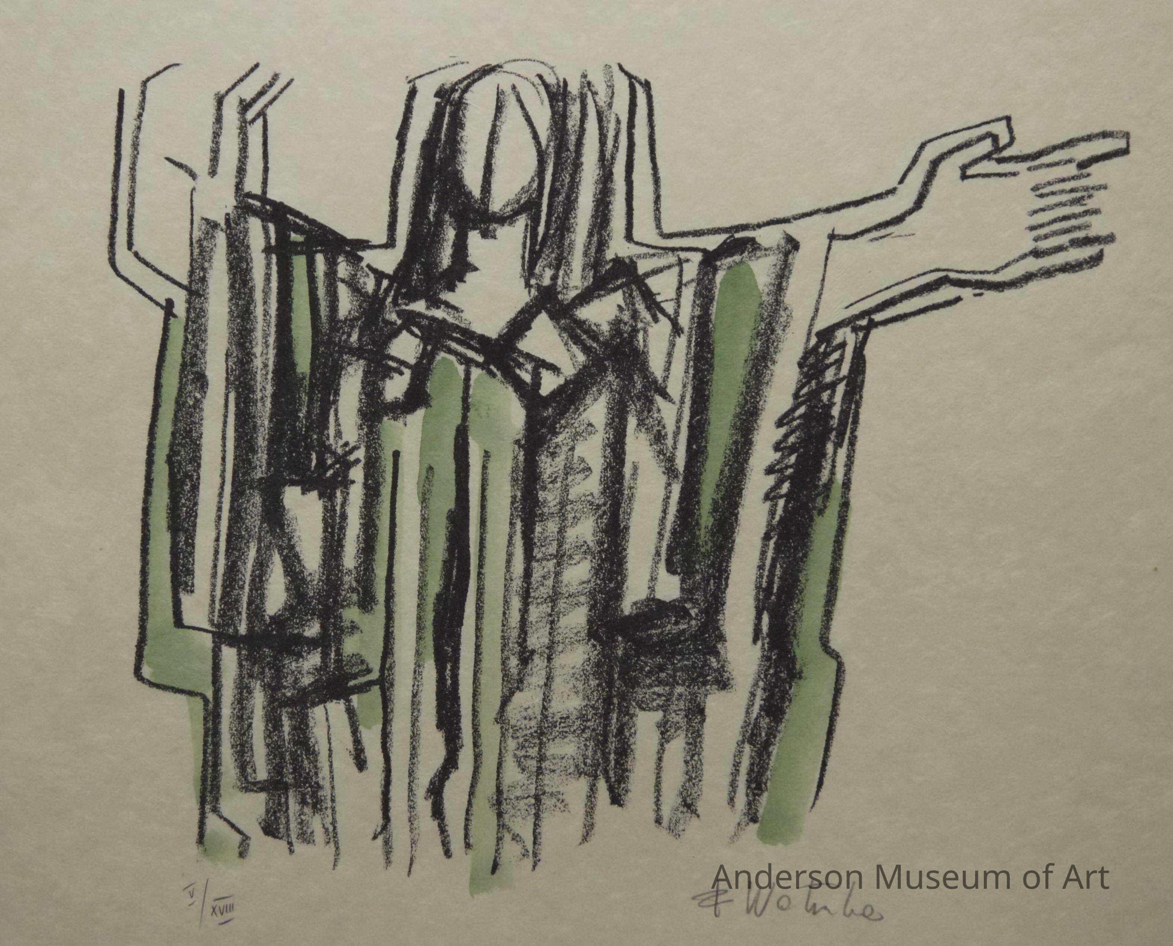 1979.16.1.5 - Image appears to be drawn in black crayon using a contour drawing technique. Background image appears to be urban setting much like five distinctively geometric buildings, primarily rectangular forms. These extend from the top of the picture plane to approximately 1 3/8" above the bottom of the picture plane. A crowd of human forms are grouped near the lower center of the picture plane. Forms consist of one standing form that is on a pedestal above the others and which is standing with arms raised above head as if preaching to a crowd. Figures in crowd are or appear to be for the most part on hands and knees as if bowing before preaching form. Paper bears no watermark; it appears to be on Japanese rice paper. It is signed "F Wortruba" in the lower right corner in pencil and "V/XVIII" is written in pencil in the lower left corner.