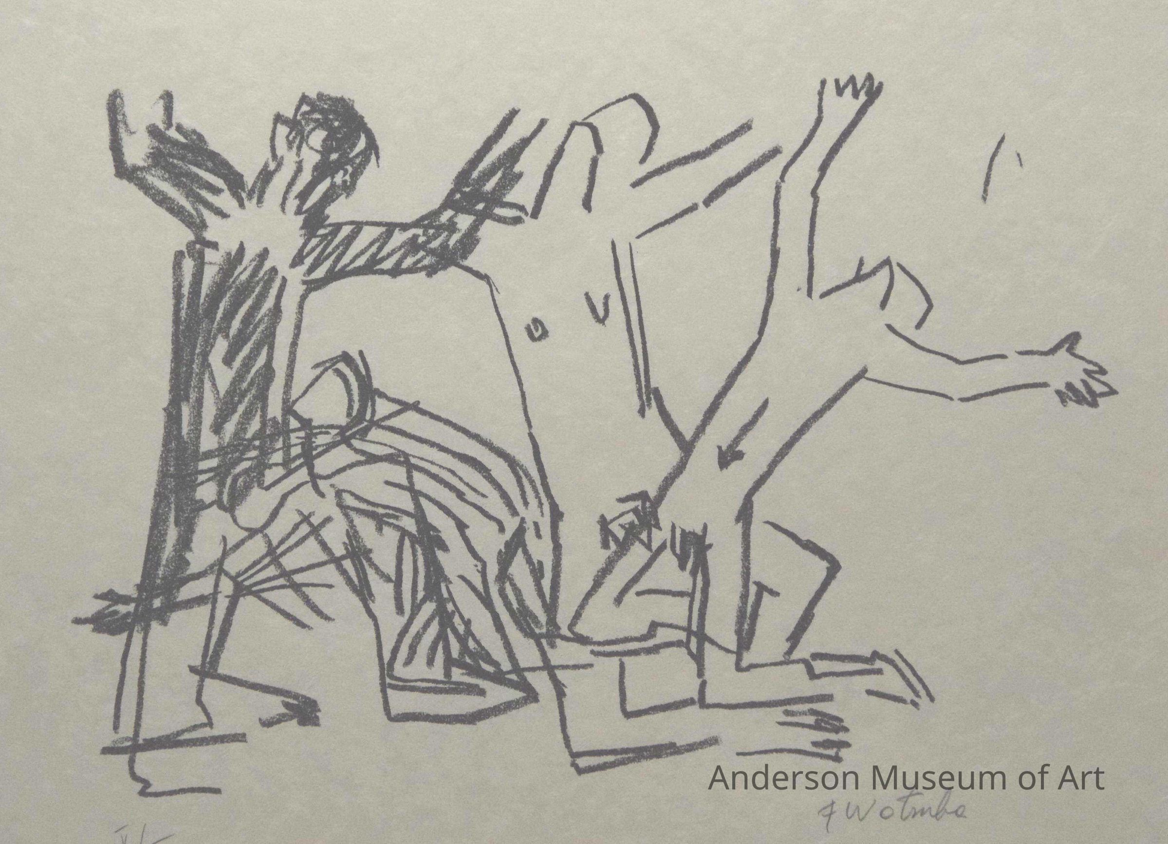 1979.16.1.15 - There are four figures in this image. The one on the left is sitting down with his arms in the air. He is shaded the darkest. The next man is on his knees with his head in the lap of the first man. The two to their right are both naked, on their knees, and have their arms in the air. Print 5/18.