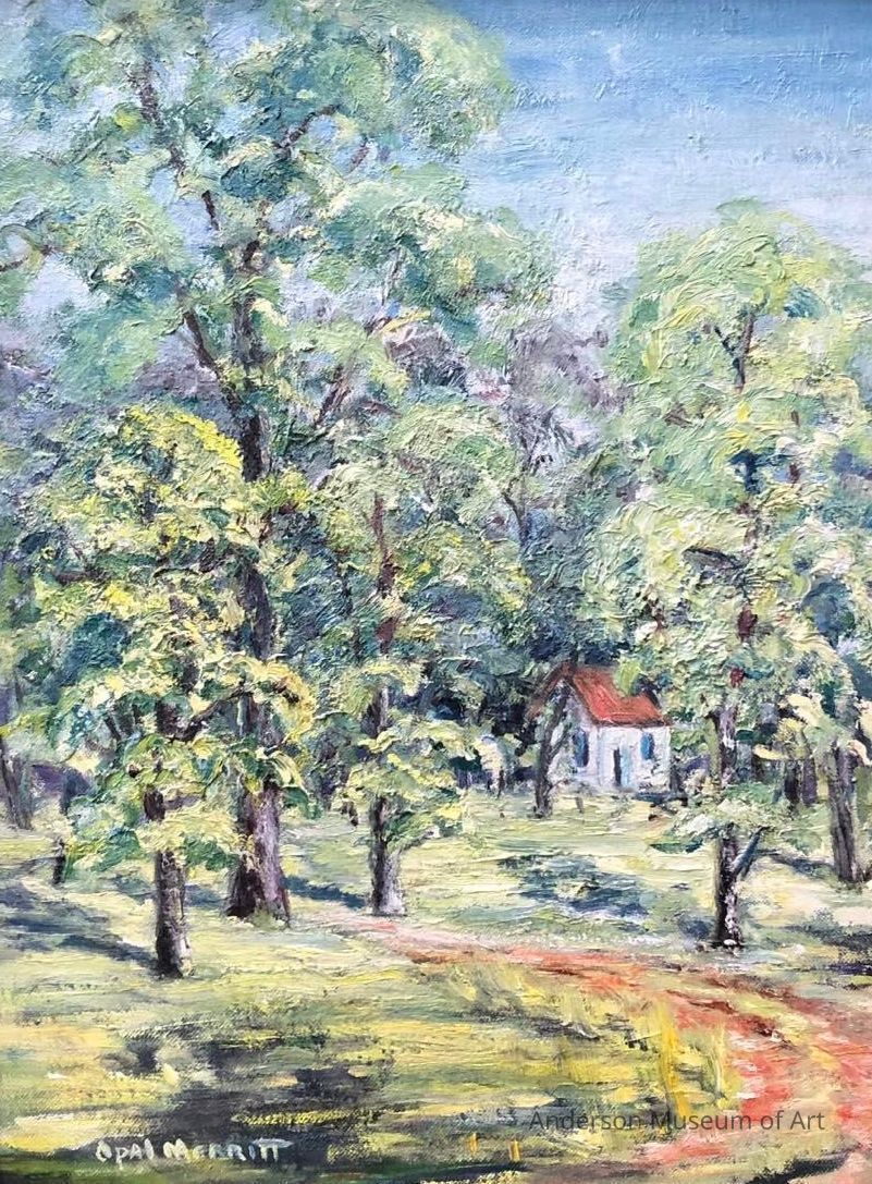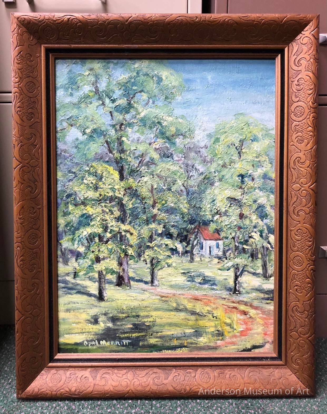 Landscape with building. Short and tall trees in the foreground are made with thick, brush strokes. There is a brown pathway leading from the LRC in the foreground to the left within the trees. There is a small white building in the middleground with two blue windows and an orange roof. Image is mostly trees with some grass in the foreground and the upper right corner sky. Signed "Opal Merritt" in white in the BRC.