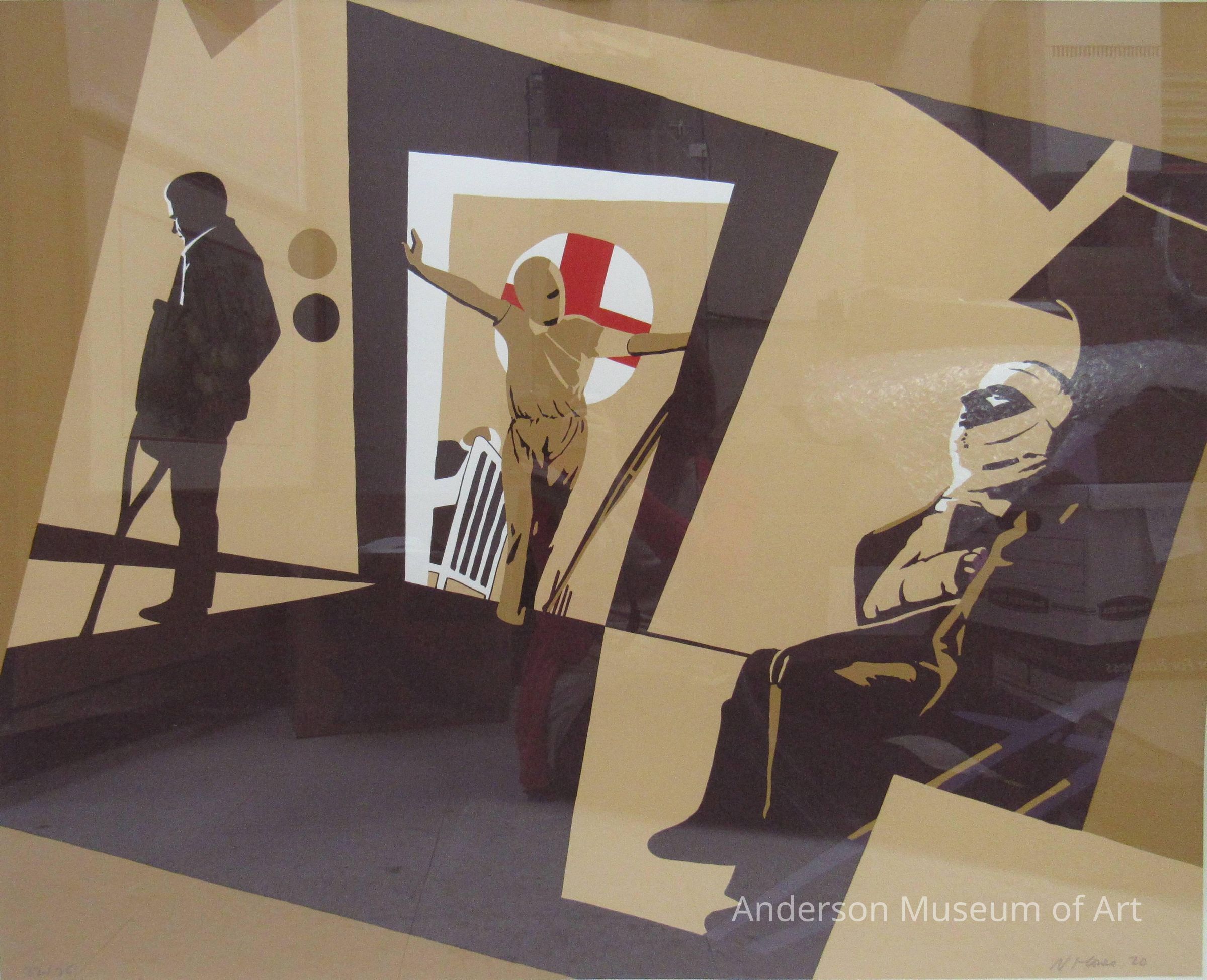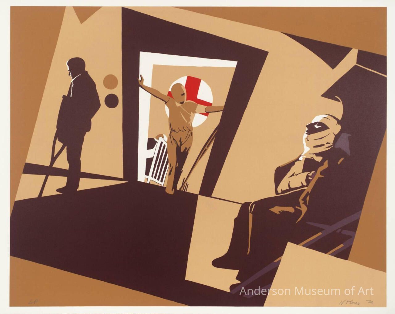Serigraph on heavy-weight white paper with no visible watermark. Image is somewhat abstract, with the background suggesting hospital hallways, etc. It is composed of hard-edge angular shapes. There are three figures. The first is on the left side, and is a man standing with one leg and a crutch. The second is leaning in the doorwary with both arms outstretched, and his head is totally bandaged, with only one eye and mouth visible. Beyond this figure is a hospital bed, and behind this figure is a red cross in a white circle. This composes the center of the composition. The third figure is to the right, and is seated. He is also bandaged on his head, right arm and upper body, and a crutch is leaning next to him. The color scheme is limited to brown, ochre, and a gold-beige color with some violet and red. The print is numbered in pencil in the lower left corner "32/75" and is signed and dated in the lower right corner "N Monro (19) 70." On the verso is the inscription "Monro Hospital" appears in pencil in the lower right quadrant, also in the lower right quad. is a collector's or publisher's mark.
