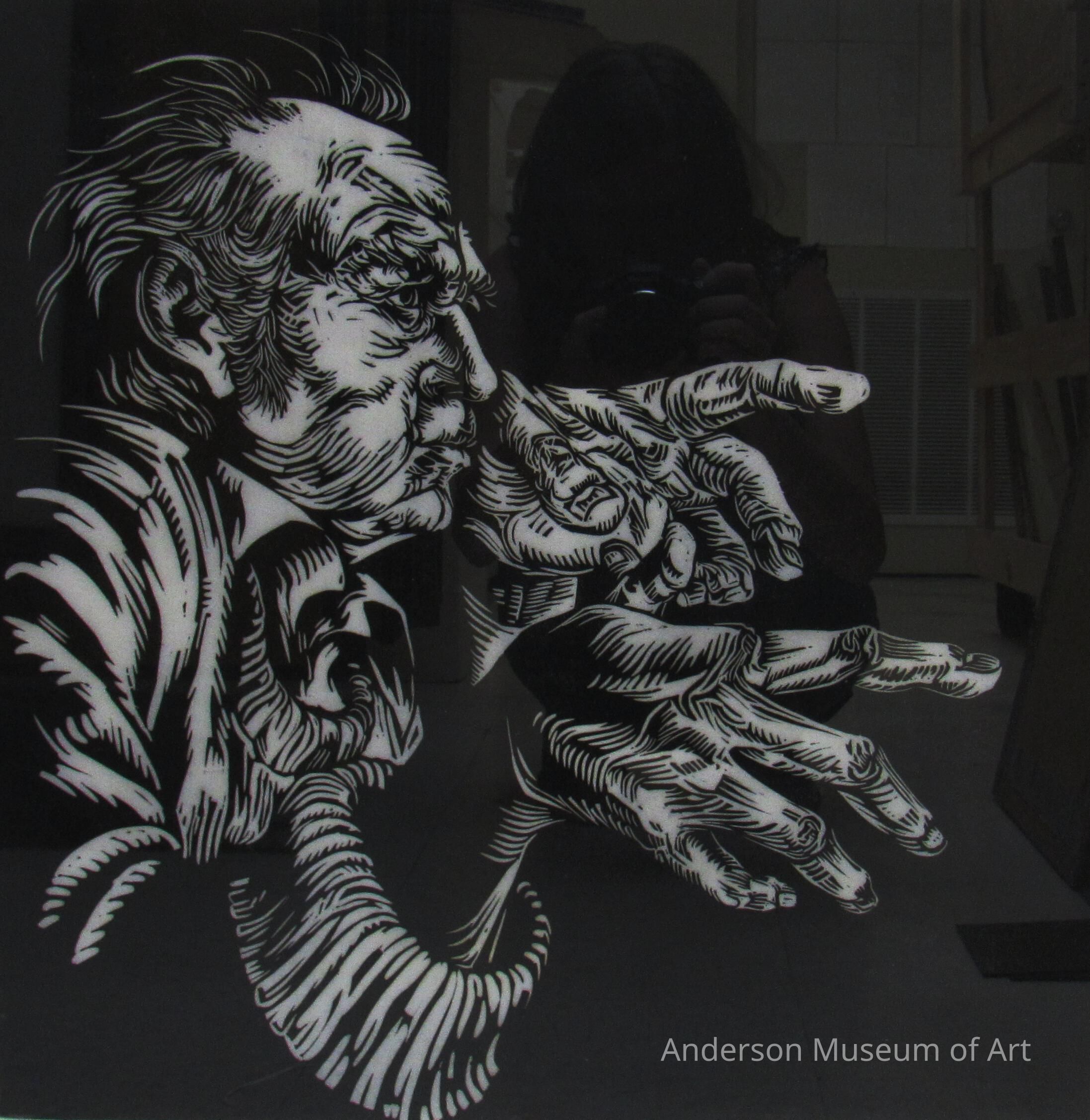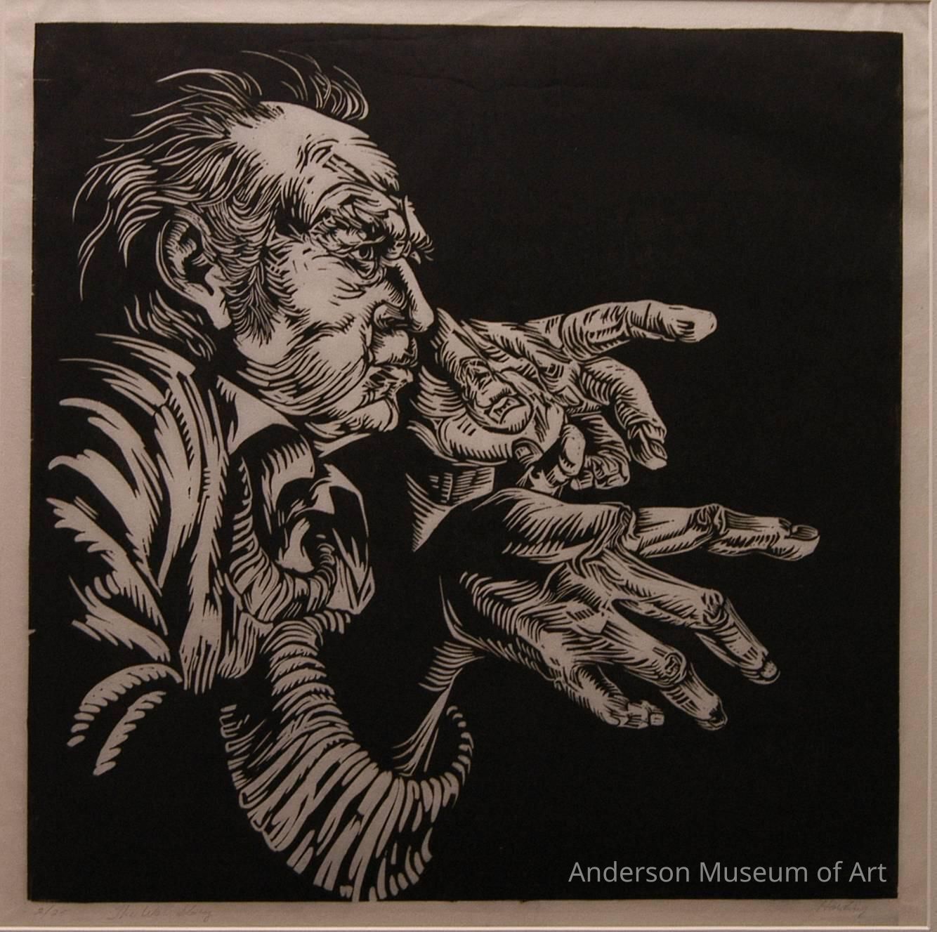 Side view of an elderly gentleman with shoulders hunched and hands drawn close to face with fingers extending outward. Man is facing the right. The background and the line detail are black while the majority of the man is white. The man takes up the majority of the left half of the image with just his hands extended into the right side.