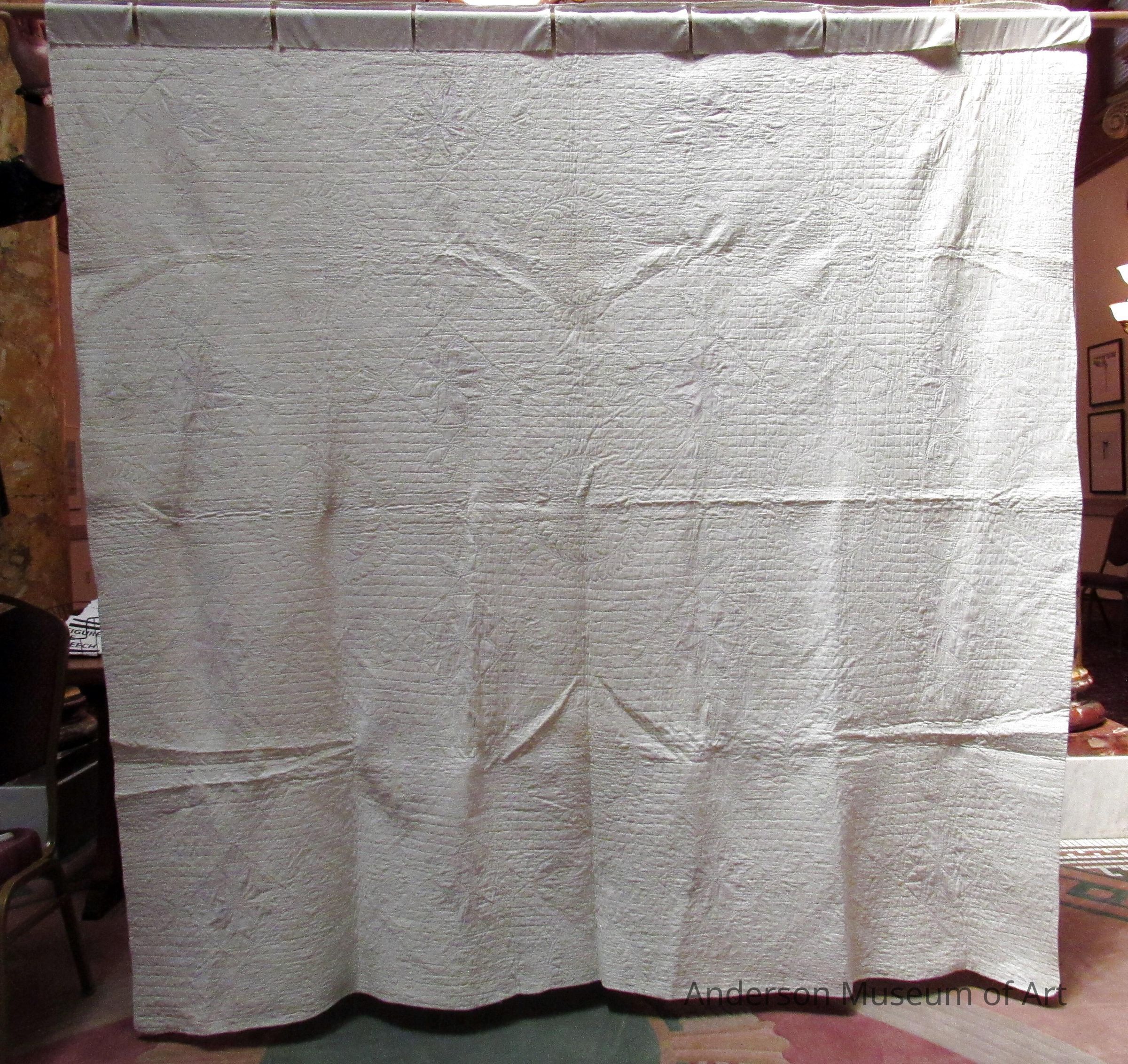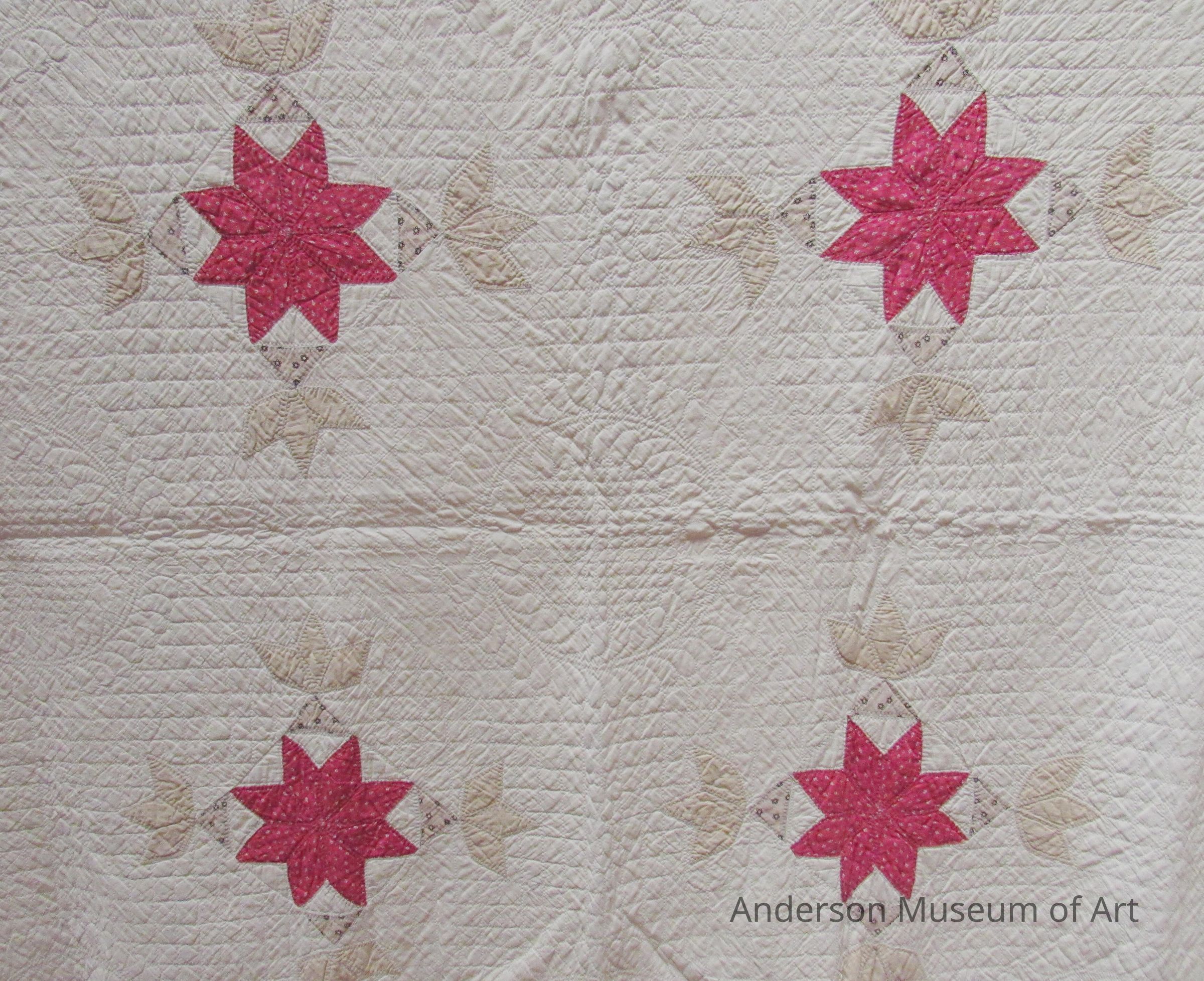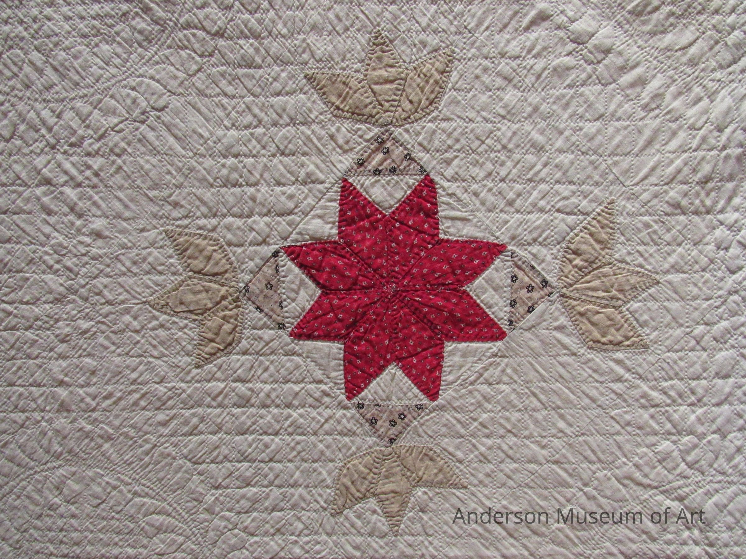 The quilt is made up of sixteen eight-pointed star designs. These designs are red with a blue and white floral pattern. Each star is then in a box with a tan triangle at each corner. The tan triangles have a blue and white floral pattern. At the point of each triangle there is a larger beige tulip shape. The background of the quilt is white. Leaf circle pattern is quilted through out the design.