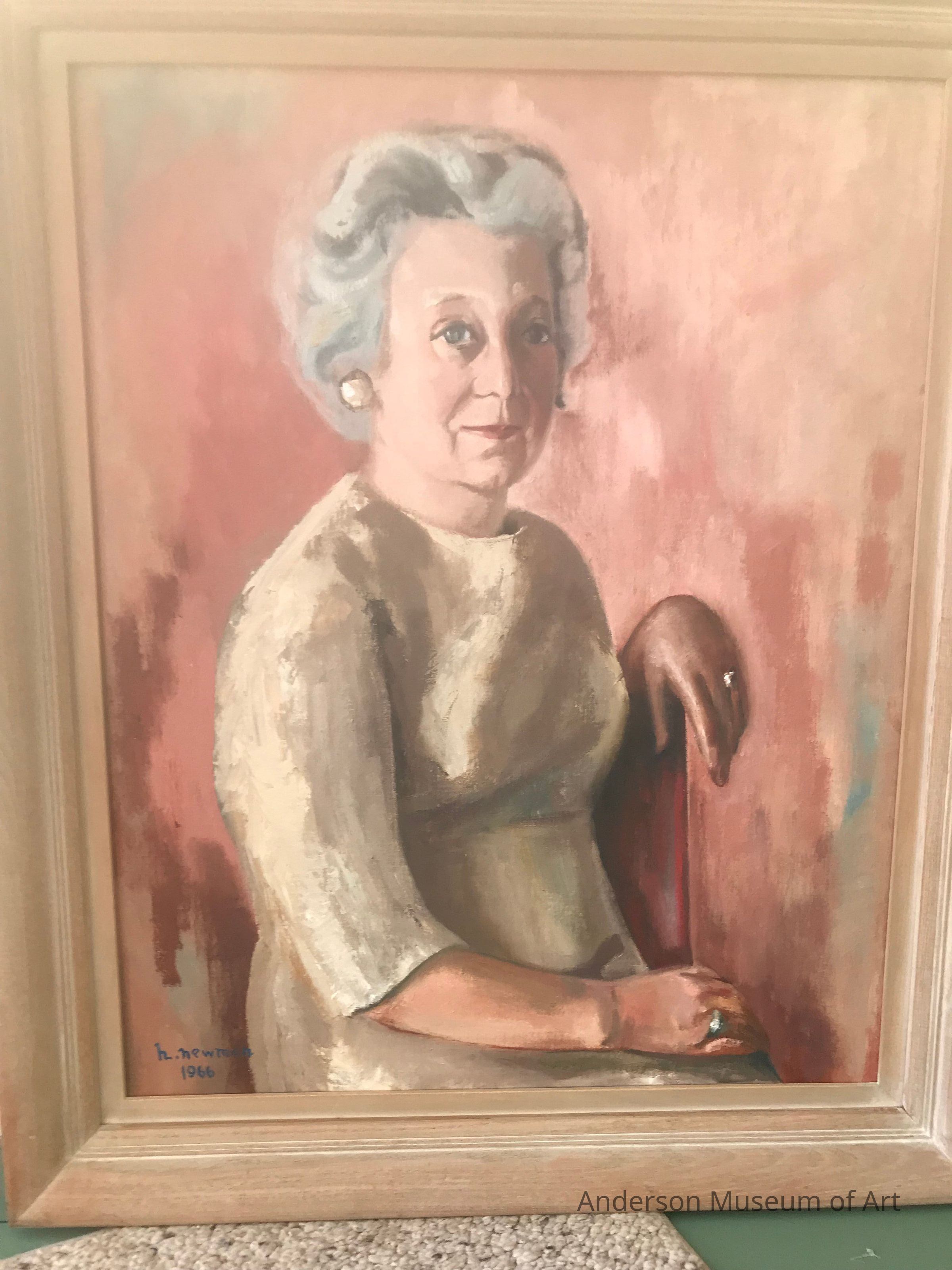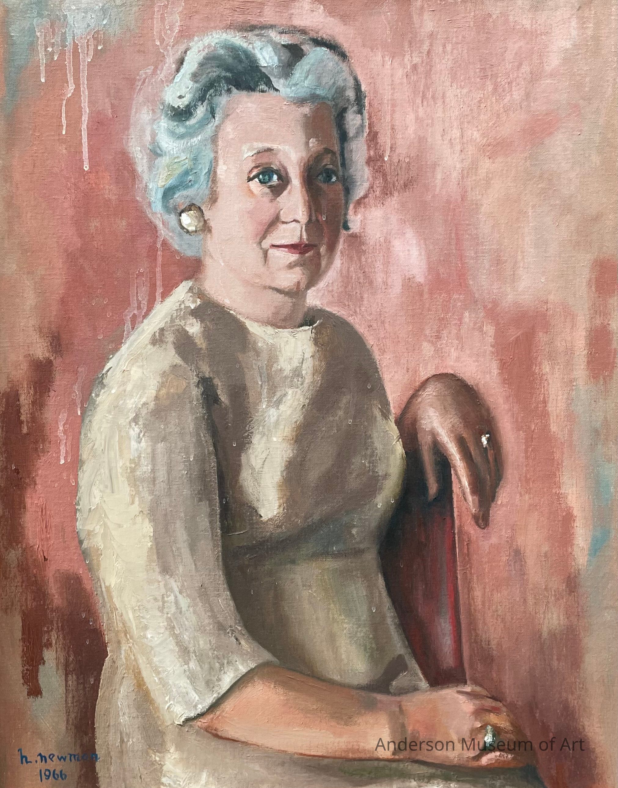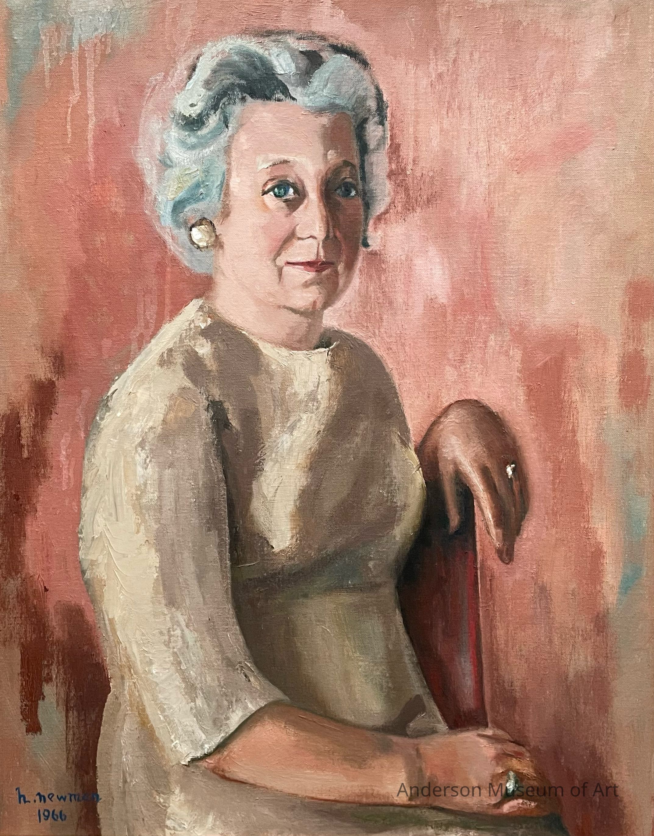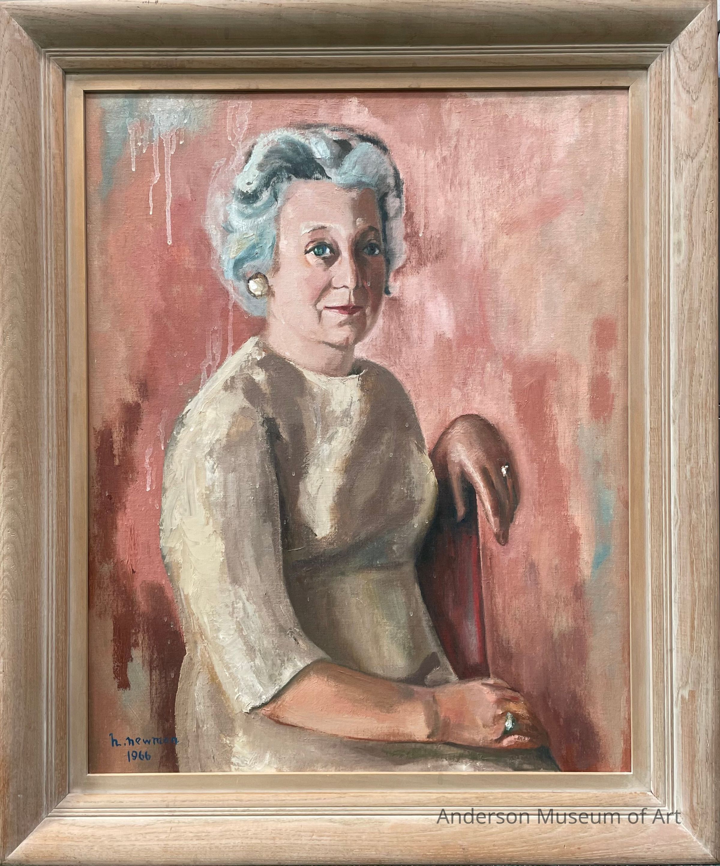 Portrait of Women's League Member and museum supporter Georgia Baker. Georgia is wearing a creme dress with straight sleeves to her elbow. She is wearing a single ring on each hand and large round earrings. Georgia is an older, white, female with grey hair painted in various shades. She is sitting in a chair angled and facing the viewer's right. Her left hand is resting over the back of the chair. The background is painted in pinks and mauves. It is signed "h. newman 1966" in a blue paint in the BLC.