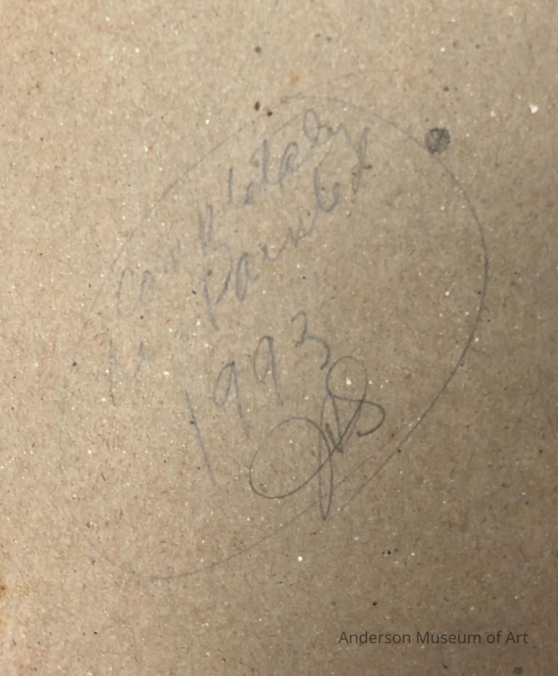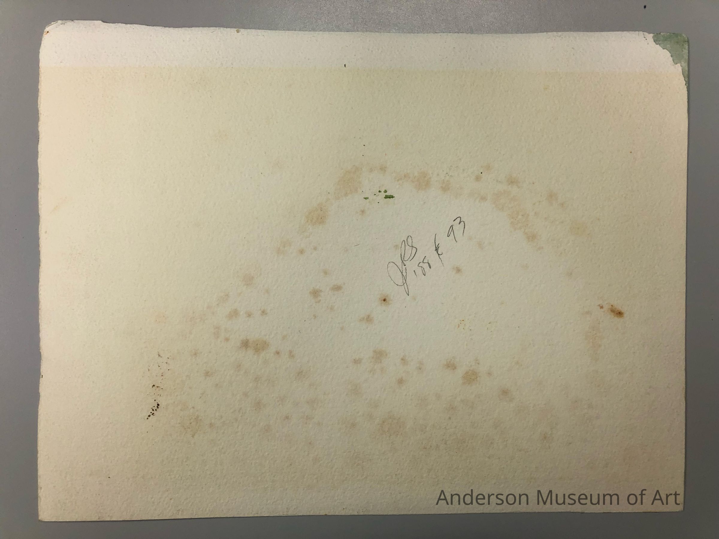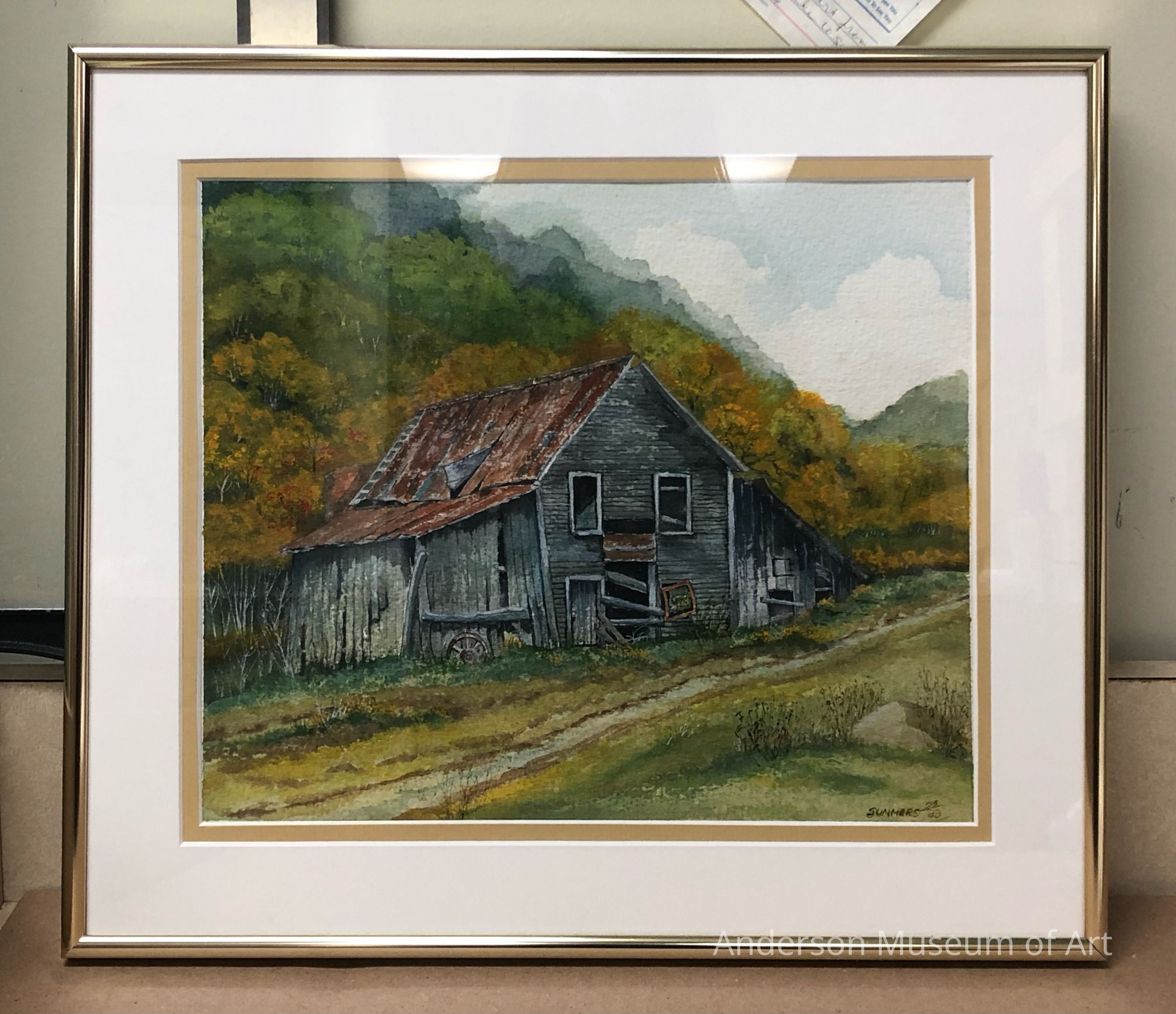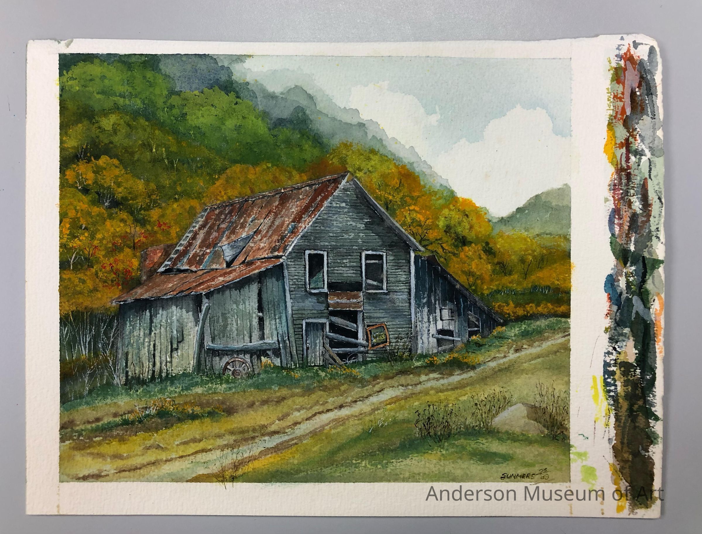 Landscape featuring a barn in front of a hill of trees. The barn is gray wood with a brown/red roof. The barn has two upper windows, a door, and a boarded over entrance in the center. The trees begin the barn change from yellows and oranges in the foreground to blues and greens as they lead away from the viewer. There is a path across the foreground as well as a rock in the BRC. Signed "Summers 93/89" in LRC. "JPS 88 & 93" written in pencil verso. "Completed / repainted 1993 JPS" written in pencil on backing board.
