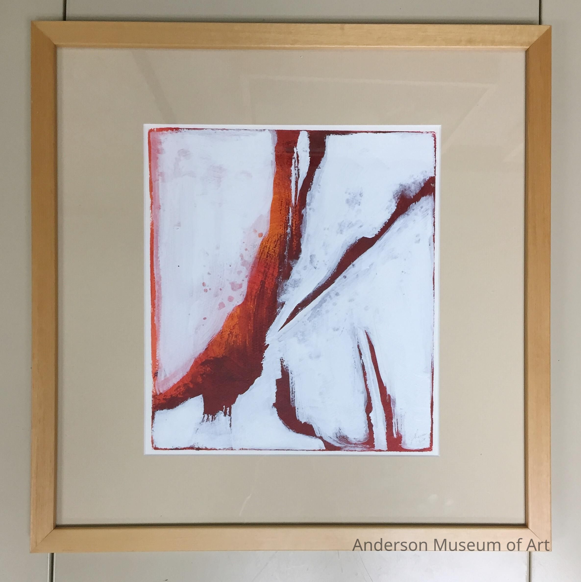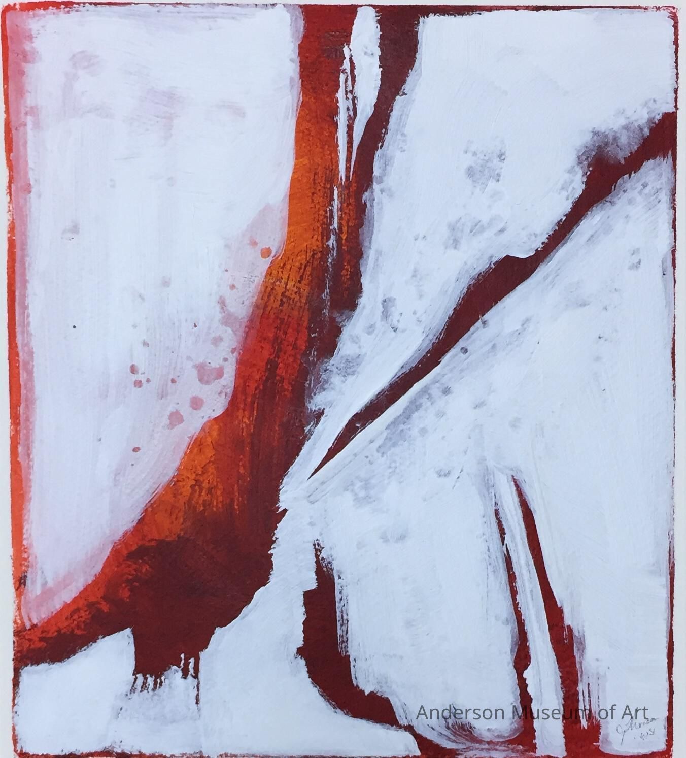 Painting of a white, red, and orange layered square. The top later is white with hints of the red and orange showing through. The largest red/orange area begins near the lower left corner and curves up to the top center. Another smaller lined area starts near the top right corner and extends roughly 45º towards the center. In the lower right corner are three red areas that extend almost halfway up. Various areas of red show through around the edges. Signed "J. Thorson / wsi".