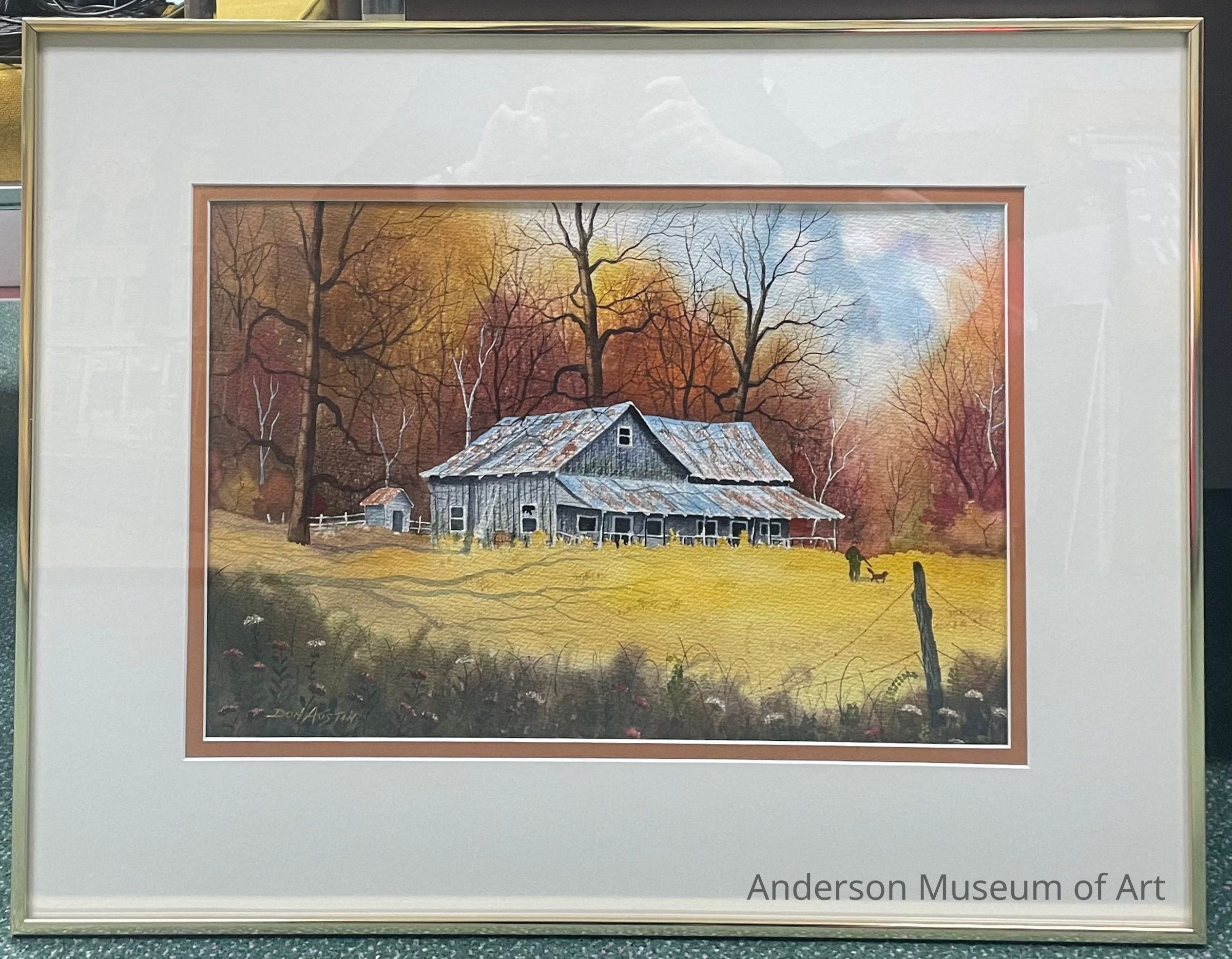 A fall watercolor landscape. There is a large house/barn in the center of the image painted in greys with hints of brown rust throughout the roof. There are multiple windows and doors across the front of the building just under an awning/porch. There is a small shed to the back left of the building. There is a man and his dog walking in a yellow field just in front of the building. Behind the building is a large, wooded area. There are three large, dark, and bare trees as well as many trees still with leaves in shades of oranges and reds. There is a fence post in the bottom right corner and the foreground is painted heavily in shadow as if the viewer is looking through a wooded area.