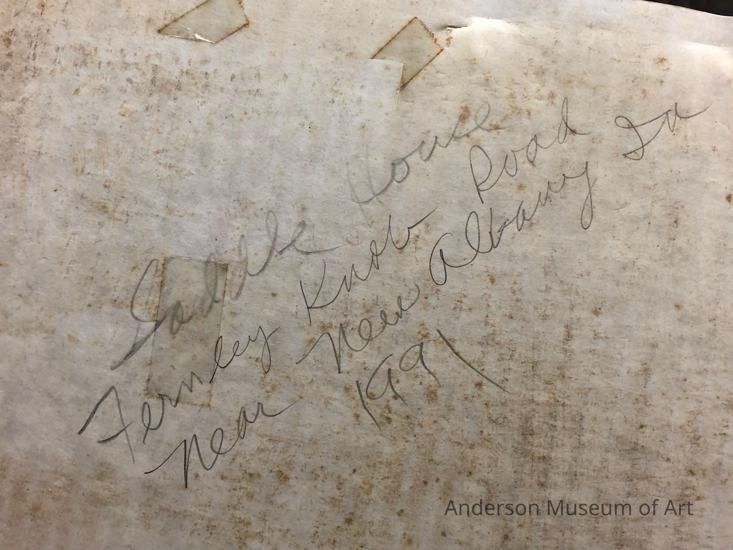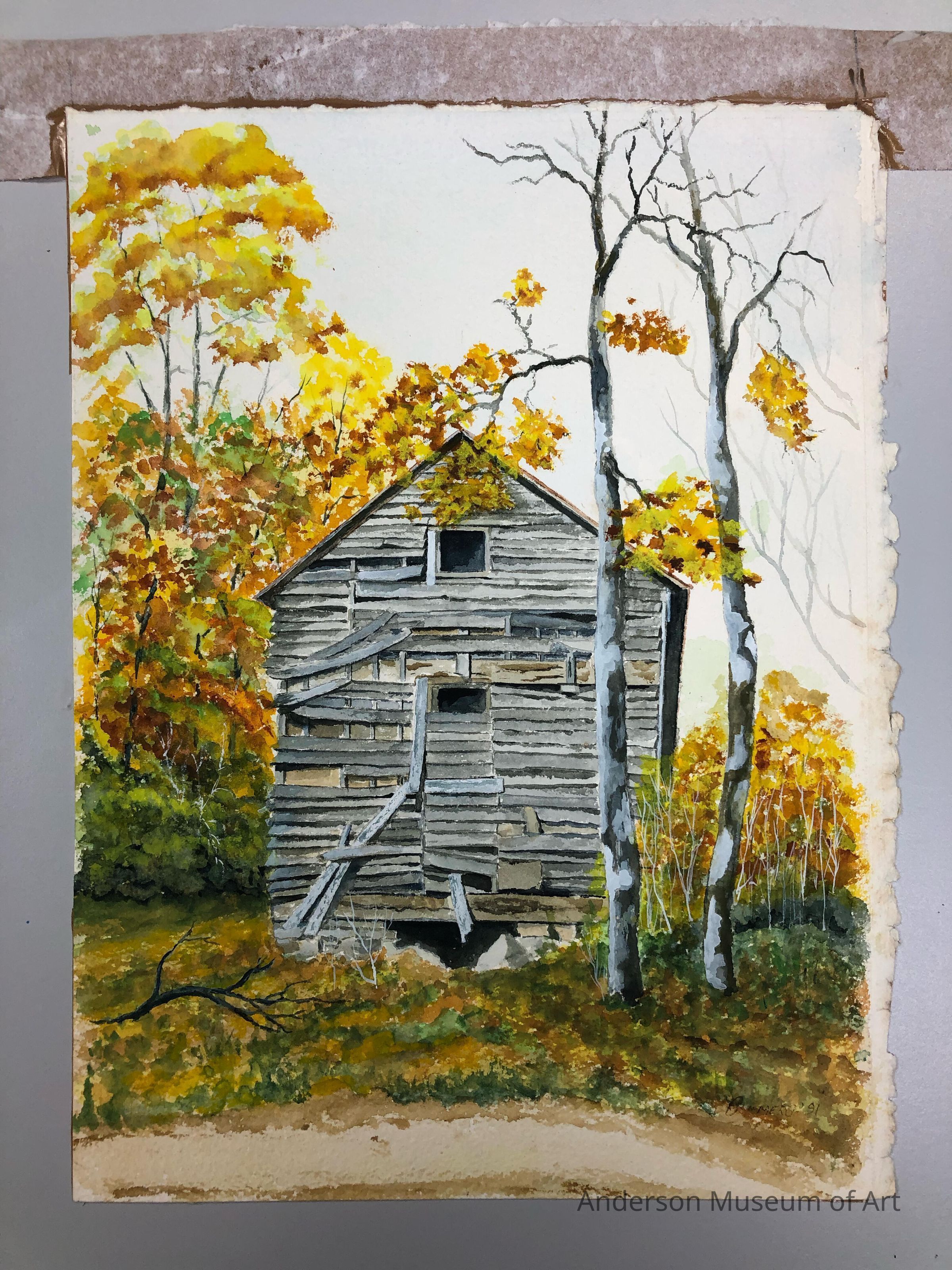 "Saddle House / Fernley Knob Road / In New Albany, IN area / 1991" is written on verso in pencil. A vertical watercolor of an old building. The building is located directly in the center of the image. It has s small window at top and a boarded up door below. The building is painted in blues, grays, and tan. It appears to be a fall day. The leaves and ground are painted in yellows and oranges with hints of green throughout. There is a lone black branch on the ground int he LLC of the foreground. Two mostly bare birch (?) trees are on the right in the foreground and extend off the page. Signed "Summers '91" in LRC in brown watercolor.