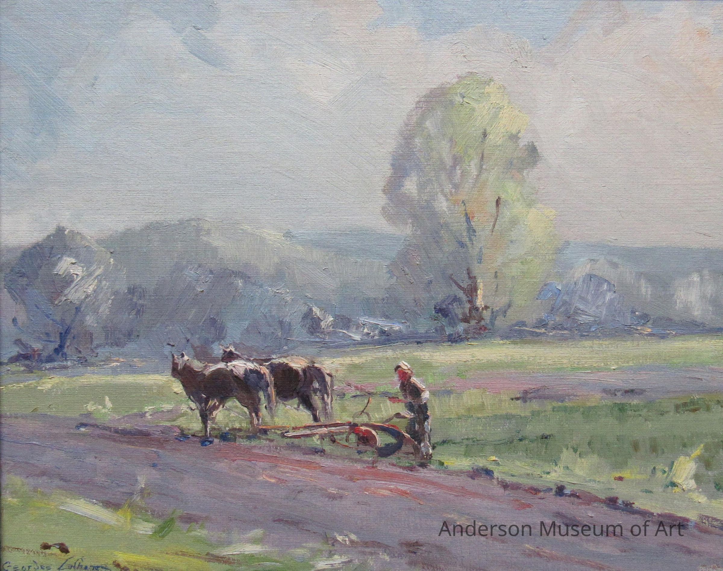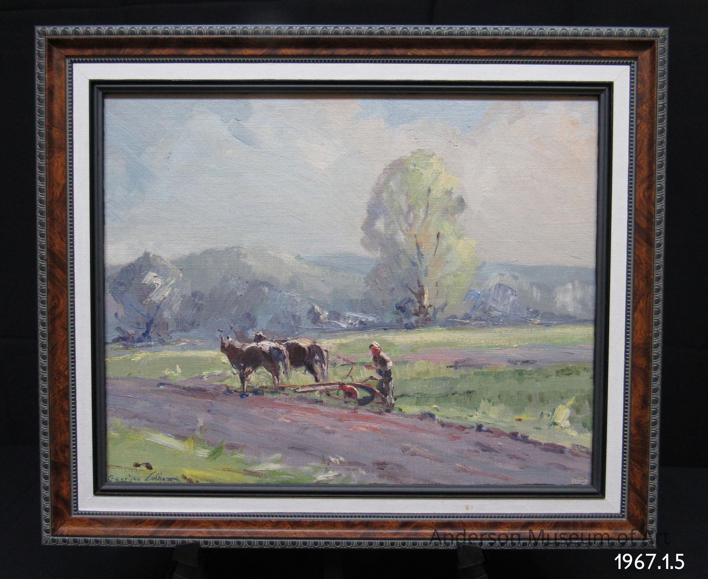 Oil on Masonite panel depicting a man driving two horses hitched to a hand plow in a field, with a large tree to the right of center in the middle ground, and a tree to the left side, with hills or mountains, and sky in the background. There is a dirt road running diagonally across the foreground. The color is very pastel, with almost all tints having been used in the execution. The painting is signed "Georges La Chance" in the lower left corner in dark blue.