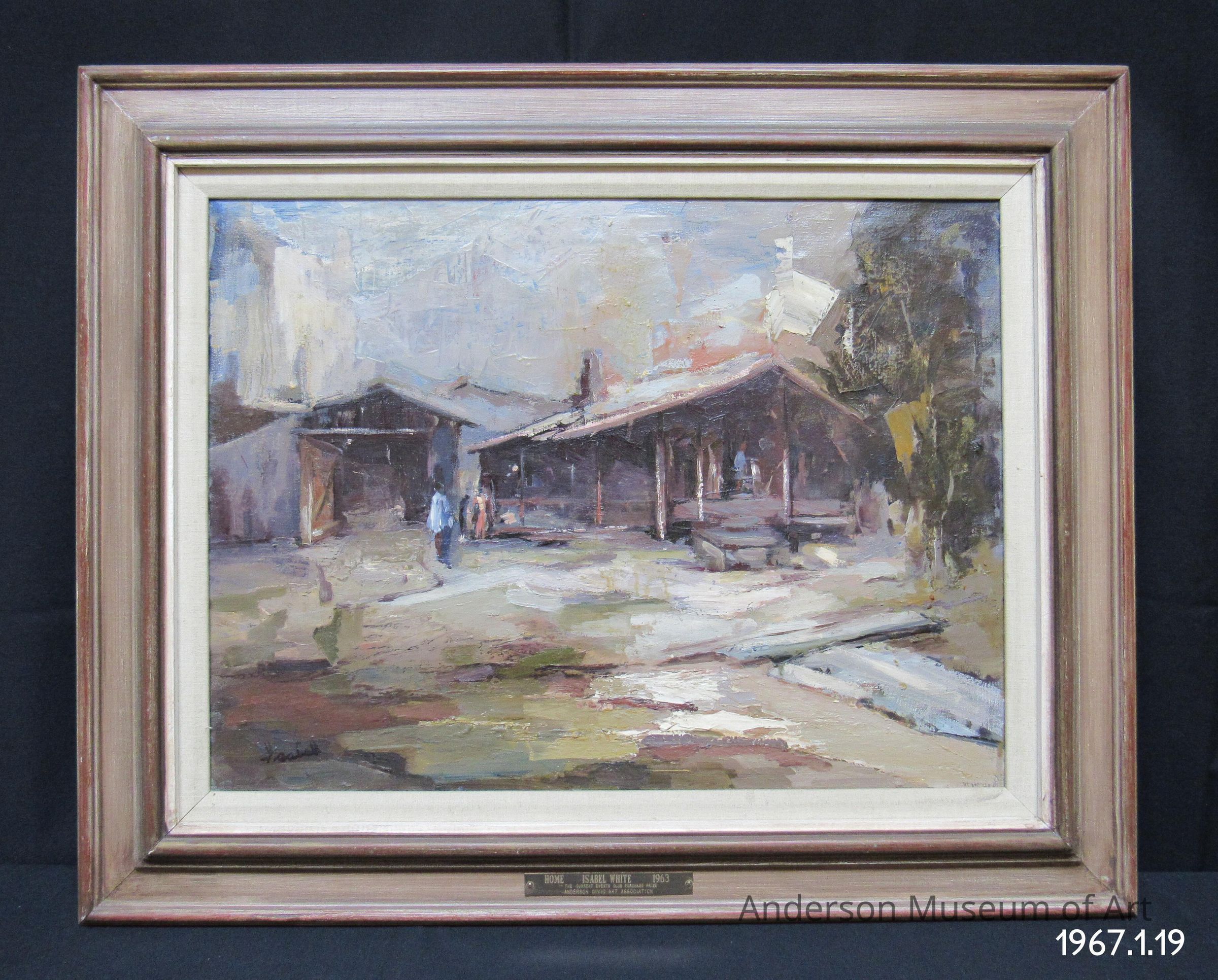 Oil painting of a cabin. The cabin is the main focus of the image and is slightly off center with a small barn to the left. There are two figures standing between the barn and house. The color palette is heavy in earth tones and whites. There is a tall tree on the right side and some rocky slate formations in the foreground. It is signed "Isabel" in the lower left corner in black.