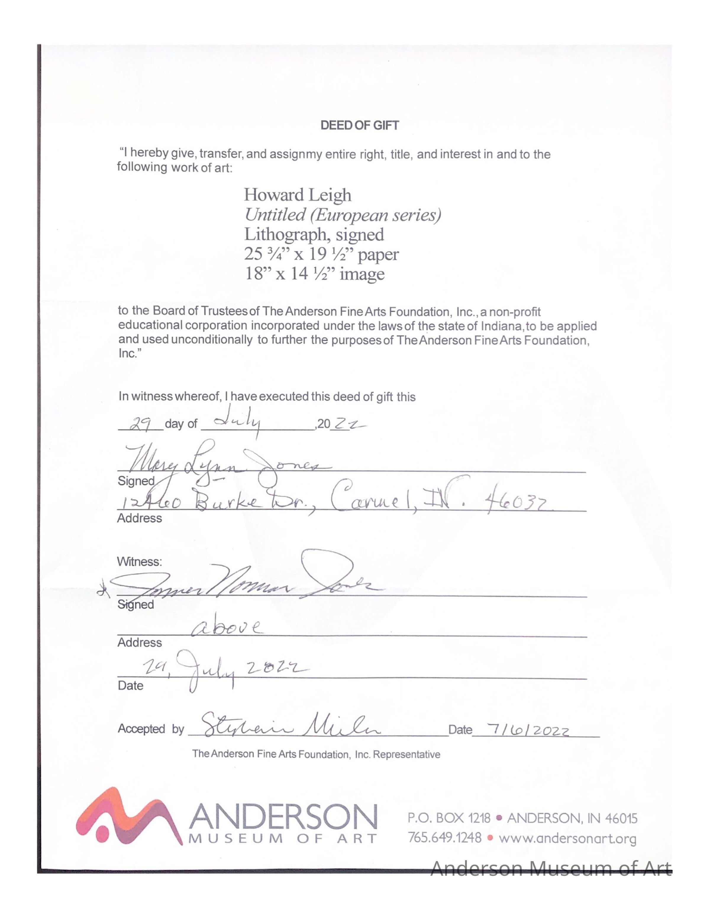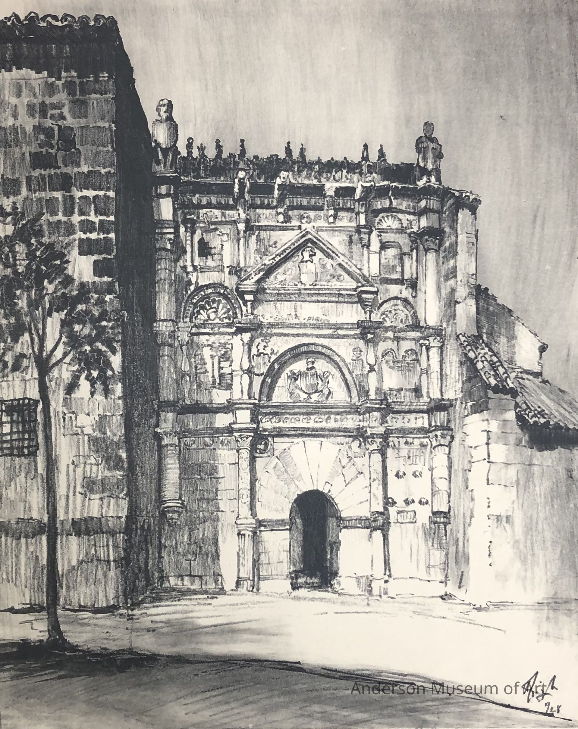 Lithograph of a European building. Building and location are unknown though possibly from the Baroque period due to the rich array of surface textures, the rounded doorways and aches, the rows of pillars, decorative corbels and statues, and so on. The main focus of the image is the façade of a small building. To the left is a more simple brick like structure in the shadows with a tree in the foreground. The shadow is cast all along the entire foreground. Signed H Leigh 1928 on the print in black ink and again H Leigh in pencil just below the image.