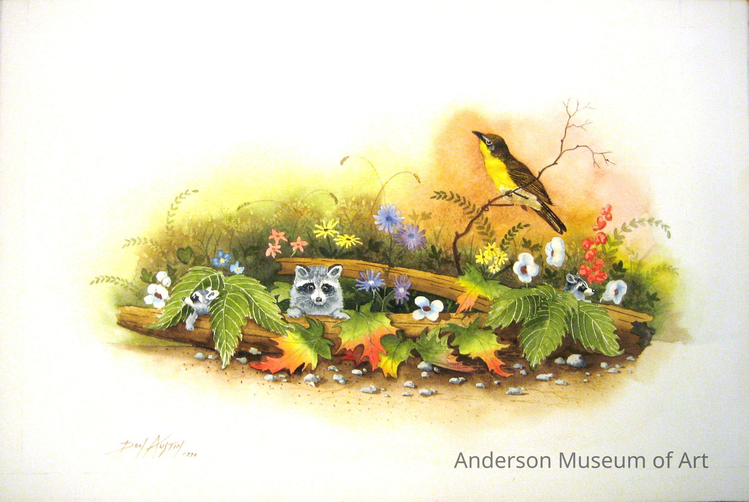 Watercolor of a nature scene. There are two logs lying vertical surrounded by wildlife, flowers, and vegetation. Behind the log in the foreground are two small raccoons. There is another small raccoon behind the second log on the right. Above this raccoon is a yellow-breasted chat resting on a thin twig. There are two clusters of three leaves on each side with six multicolored maple leaves between the two leaf clusters. The maple leaves are rainbow in color fading from red at the tip to orange, yellow, and then green. Surrounding the logs are various flowers including six white flowers, four blue and purple daisy-like flowers, three pink star-shaped flowers, two blue flowers, six yellow daisy-like flowers, and a red snapdragon-like flower. Small grey stones are scattered in the foreground.