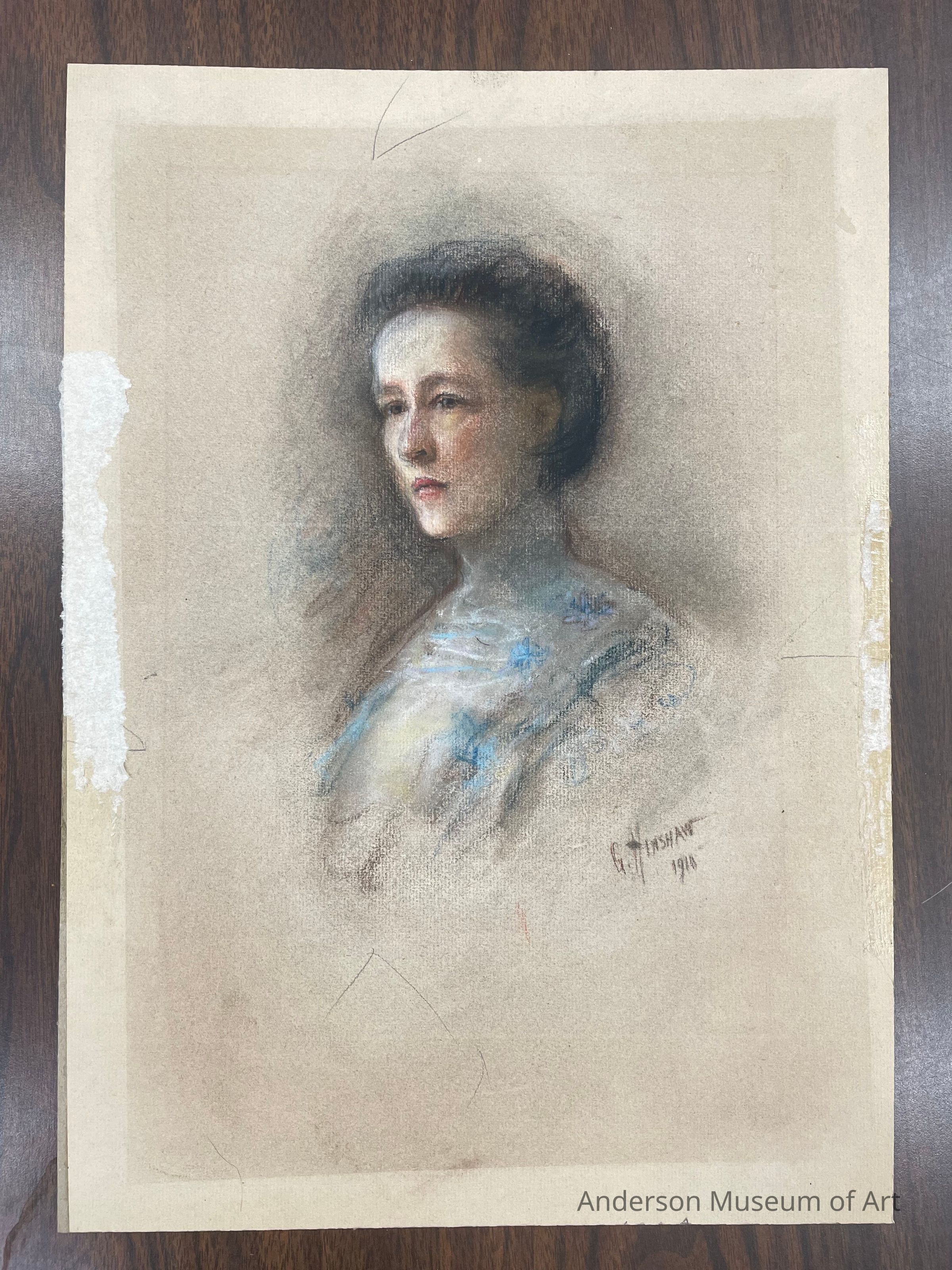 Pastel portrait of a young white female on a medium creme paper. She is angled and looking to the viewer's left. Her dark hair is up. There are hints of blues and white in her dress. The background lines around her form are a little more subtle and calming than in other portraits. Signed G. Hinshaw 1910 in brown in BRC.