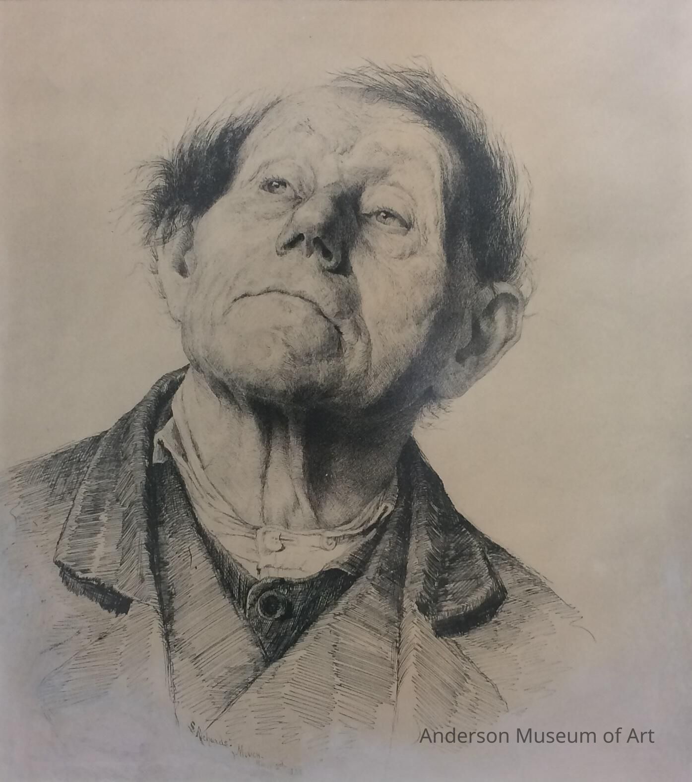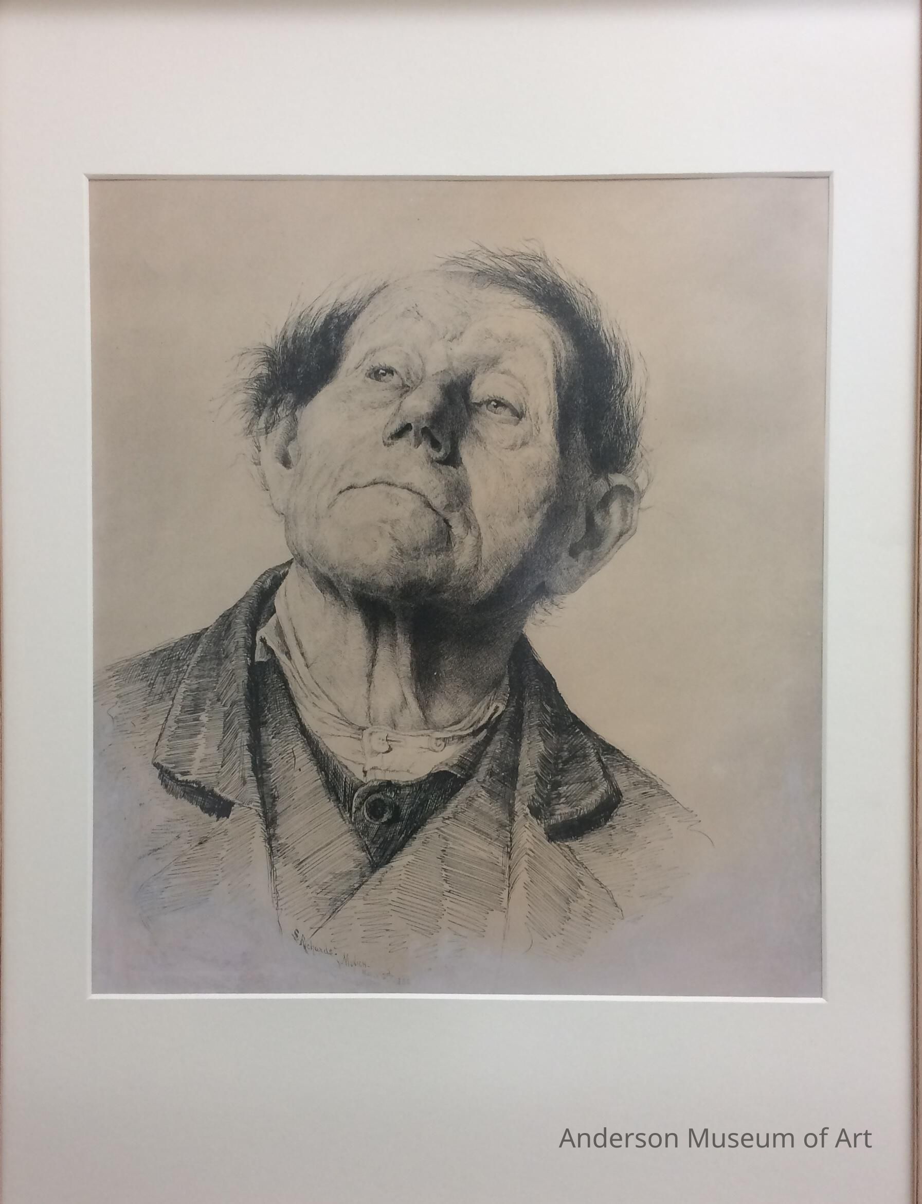 Portrait image of an old man facing the viewer with his eyes directed toward the upper right. His hair is combed up and towards the left. He is wearing four layer of clothing with an overcoat on top with lapels, a piece below that, a dark piece below that with a button, and finally a white layer that is buttoned tight to the neck. Slightly left of center at the bottom of the paper is written the follow "S. Richards. Munich--March 2nd 1883". Written in ink below the picture is "To the Anderson Club with Respectful Compliments Samuel Richards Dec. 17th, 1891. Pen Study-Bavarian Peasant". It is possible that the IMA has the original. www.collection.imamuseum.org/artwork/56019/