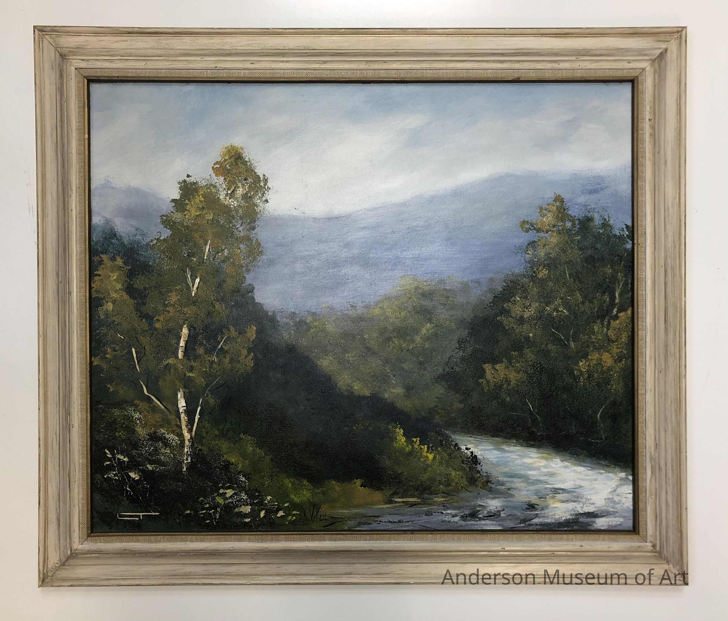 Landscape painting. There is a birch tree along the left side that reaches almost to the top of the painting. To the right of the tree is a river bend. The river flows behind a large, sloped hill that is cast in a heavy shadow. There are tree all along the river and mountains in the background. The sky is filled with smooth clouds. Painting is made up of mostly blues, greens, and whites. Signed LT in the lower left corner in a creme paint.
