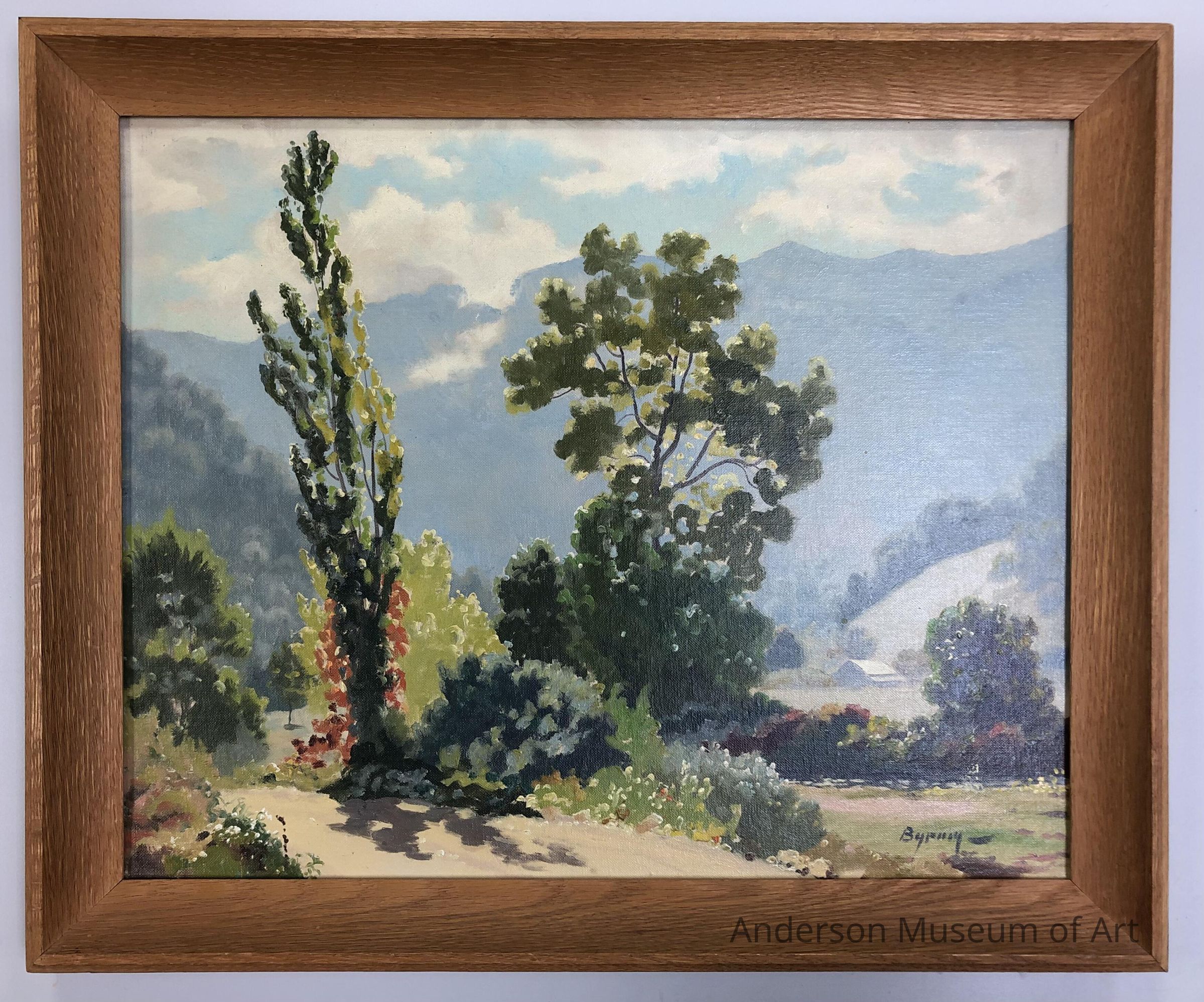 Landscape. "Soco Valley" appears to have been written on the back of the board in pencil. There is a dirt path in the foreground leading to the left and two very tall trees in the center foreground reaching almost to the top of the image To the right in the middle ground is a structure, probably a barn, with a white roof. The background consists of large mountains and clouds in the sky. The color palette is heavy on the cool colors, blues and greens, with hints of reds and yellows in the foreground. Signed Byrum in the lower right corner in blue paint.