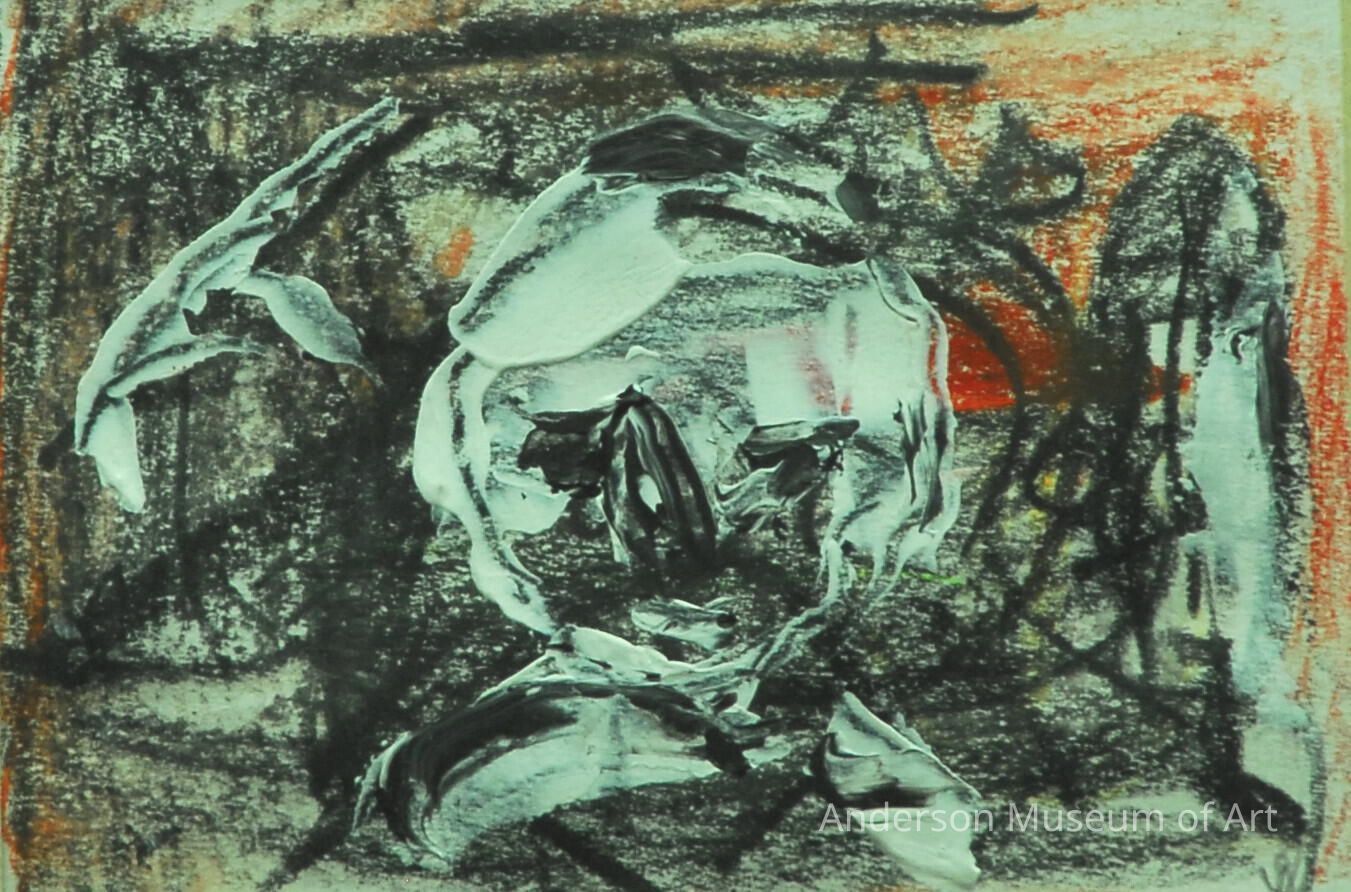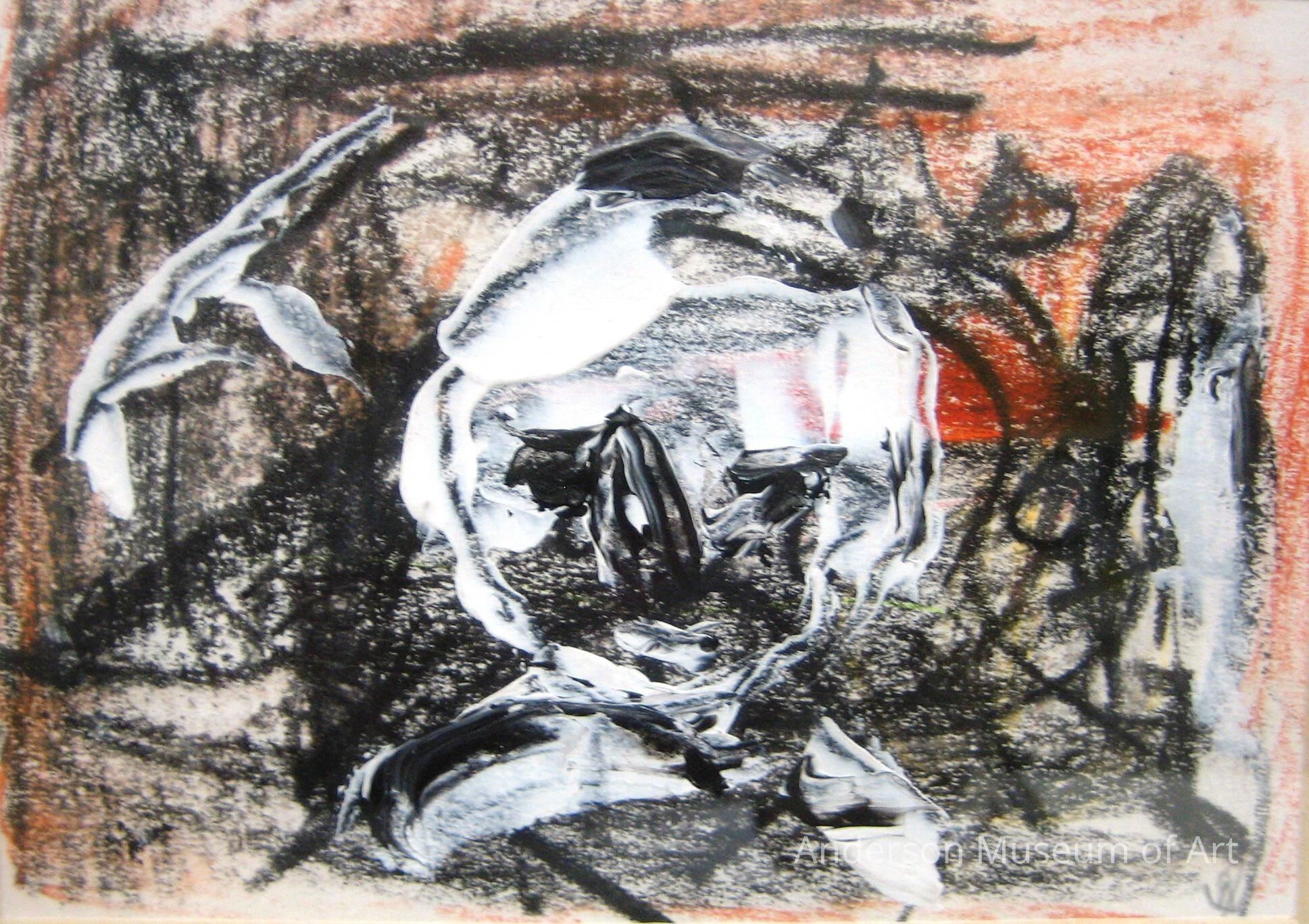 In this abstracted work, linear and calligraphic lines in orange and black oil pastel make up the elusive background. The head of a figure is painted in the center of the work. The figure is composed of black and white paint that is applied in a thick manner in certain areas. For example, the figure's eyes and nose have a thicker application of paint. Above and to the left of the figure is a diagonal line in white paint. The second line of white paint stretches along the right side of the picture plane. Kingerlee's signature of a man in a boat is drawn in pencil in the lower right corner.