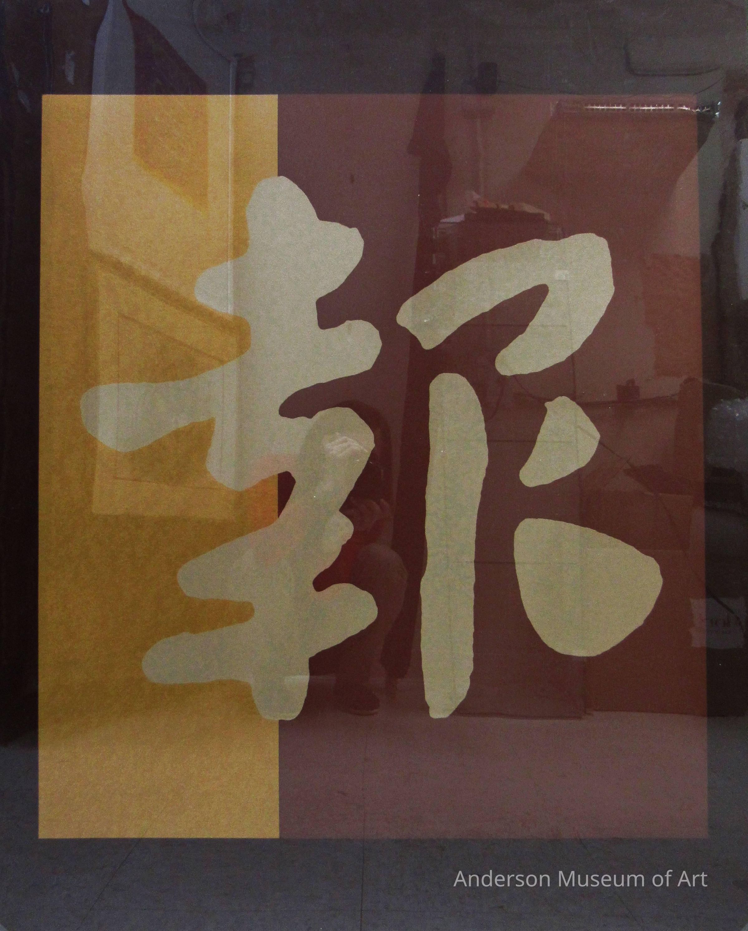Serigraph on heavy white paper with watermark in the lower-left corner running vertically upward, illegible through ink. The image depicts two large Asian characters which are both tan. They are on two rectangles, the left yellow and the right red. It is all bordered in brown. The print is numbered in pencil in the lower-left corner, "153/250" and is signed in pencil in the lower right corner, "Chryssa." An embossed printer's or publisher's mark appears in the lower-left corner which reads, "Domberger Screenprint" incorporated into a circular design. The paper sheet is deckled on all 4 sides.