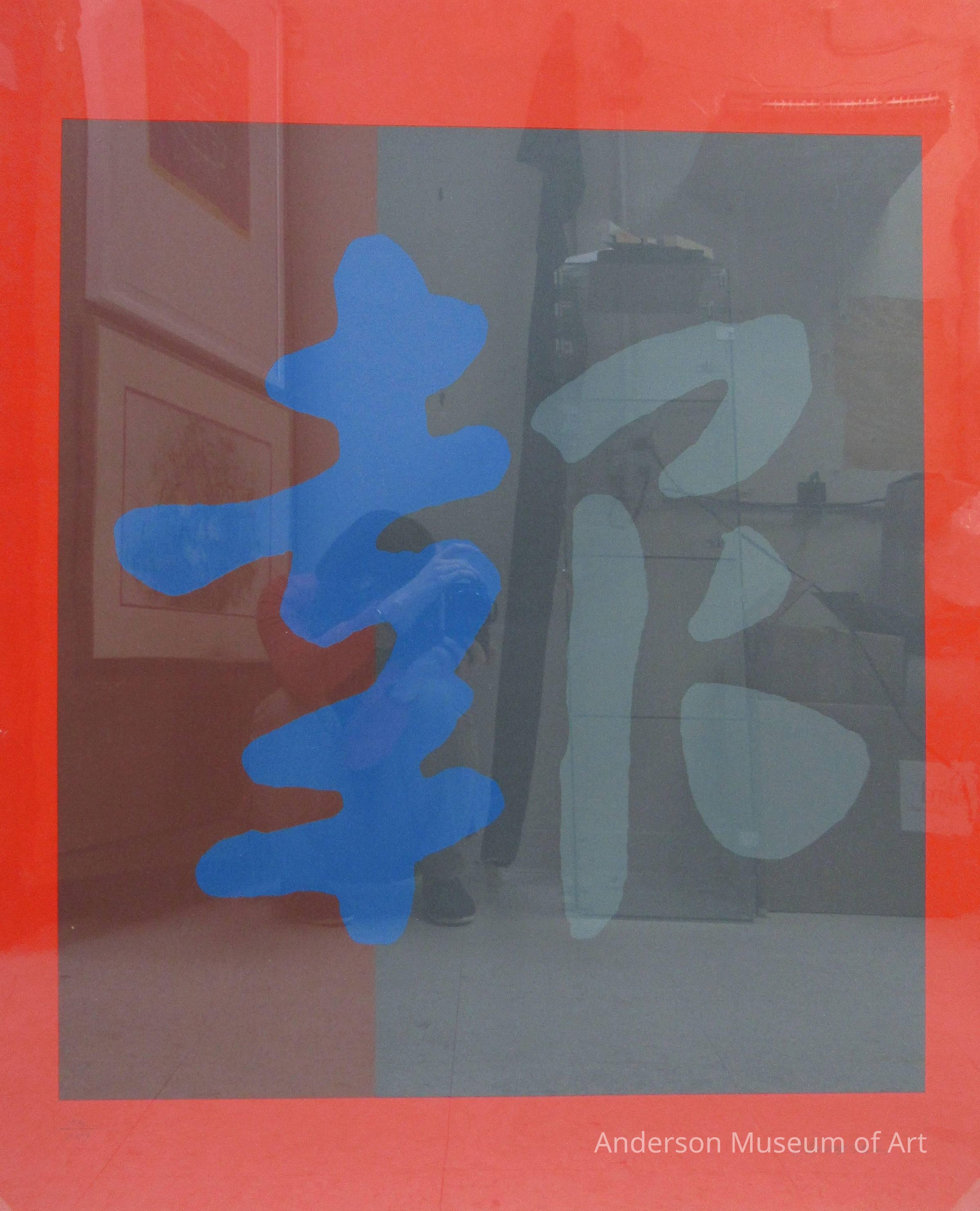 Serigraph on heavy white paper with watermark in the lower-left corner running vertically upward, illegible through ink. The image depicts two large Asian characters, the left is blue and the right is grey. They are on two colored rectangles. The left is orange and the right is a dark grey. Everything is bordered in red. The print is numbered in pencil in the lower-left corner, "153/250" and is signed in pencil in the lower right corner, "Chryssa." An embossed printer's or publisher's mark appears in the lower-left corner which reads, "Domberger Screenprint" incorporated into a circular design. The paper sheet is deckled on all 4 sides.