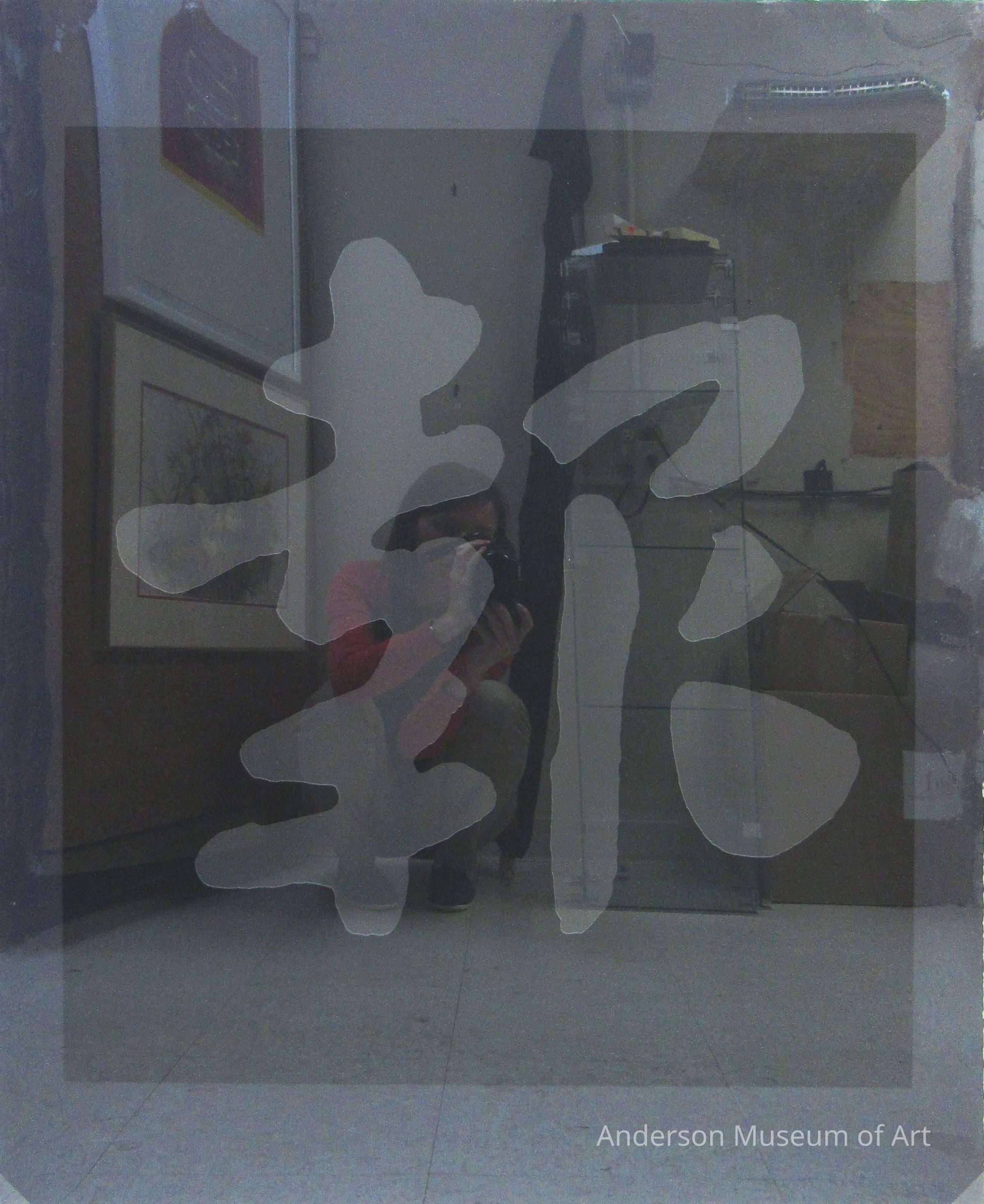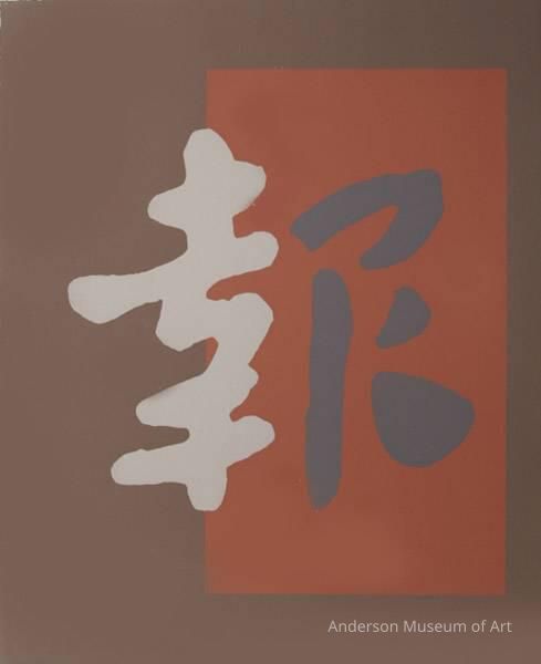 Serigraph on heavy white paper with watermark in lower-left corner running vertically upward, illegible through ink. The image depicts two large Asian characters, the first is dark brown and located within a sienna-colored rectangle which comprises the right half of the image. The second overlaps the rectangle and is gray. These are on a dark brown color field. The print is numbered in pencil in the lower-left corner, "153/250" and is signed in pencil in the lower right corner, "Chryssa." An embossed printer's or publisher's mark appears in the lower-left corner which reads, "Domberger Screenprint" incorporated into a circular design. The paper sheet is deckled on all 4 sides.