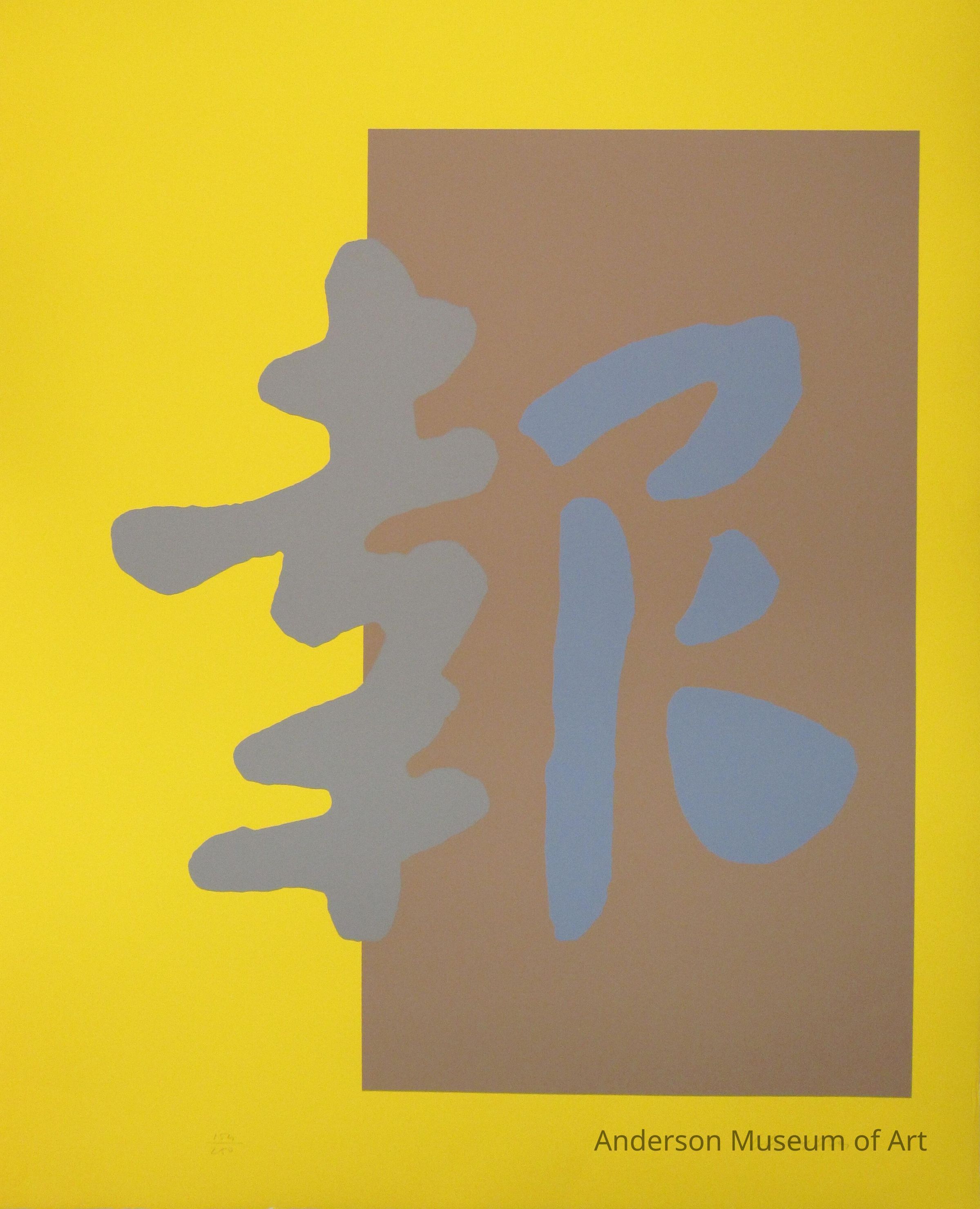 Serigraph on heavy white paper with watermark in the lower-left corner. Yellow background. The image depicts two large Asian characters, the left one is grey and the other is blue. The blue character is on top of a brown rectangle and the grey one overlaps it.
