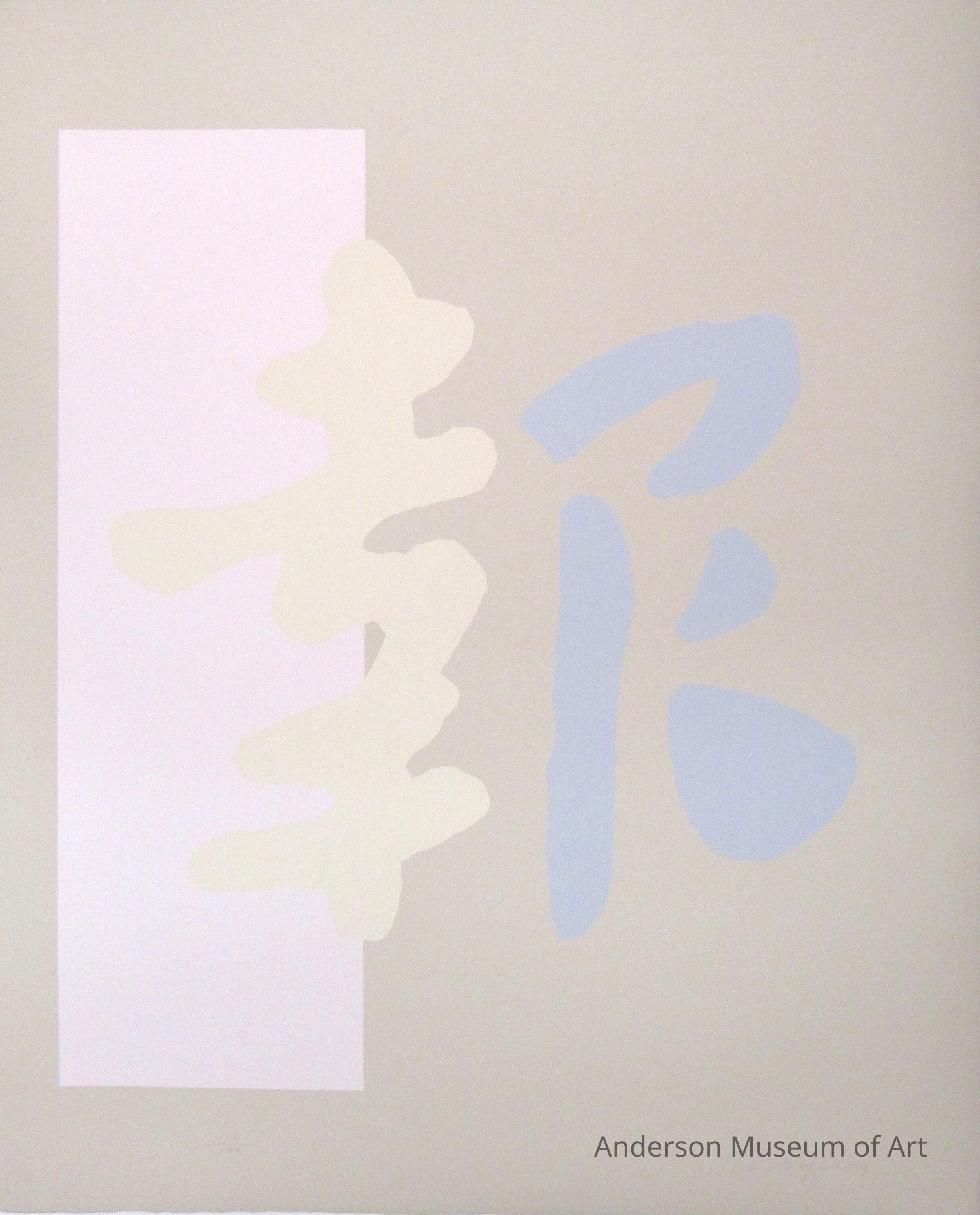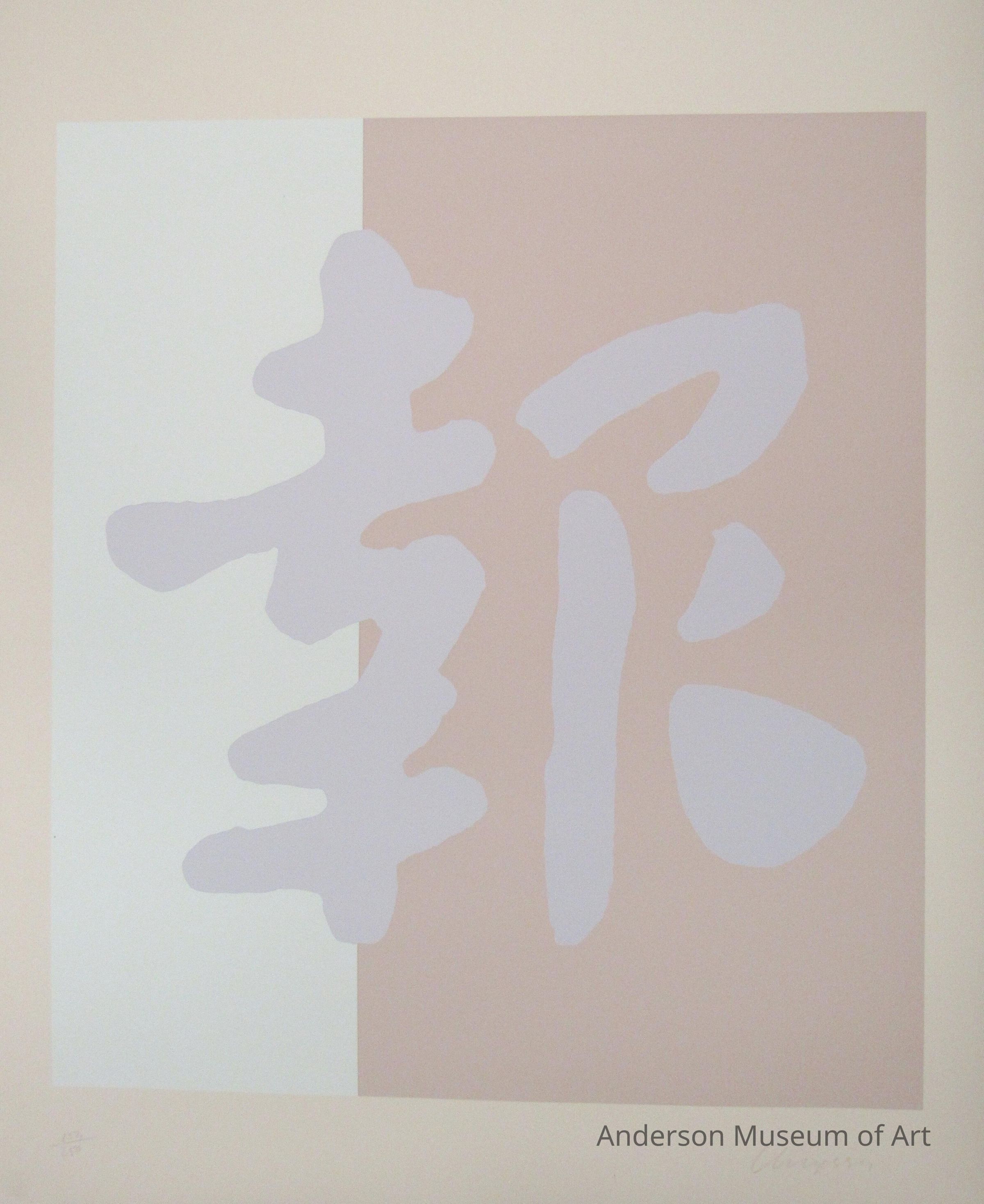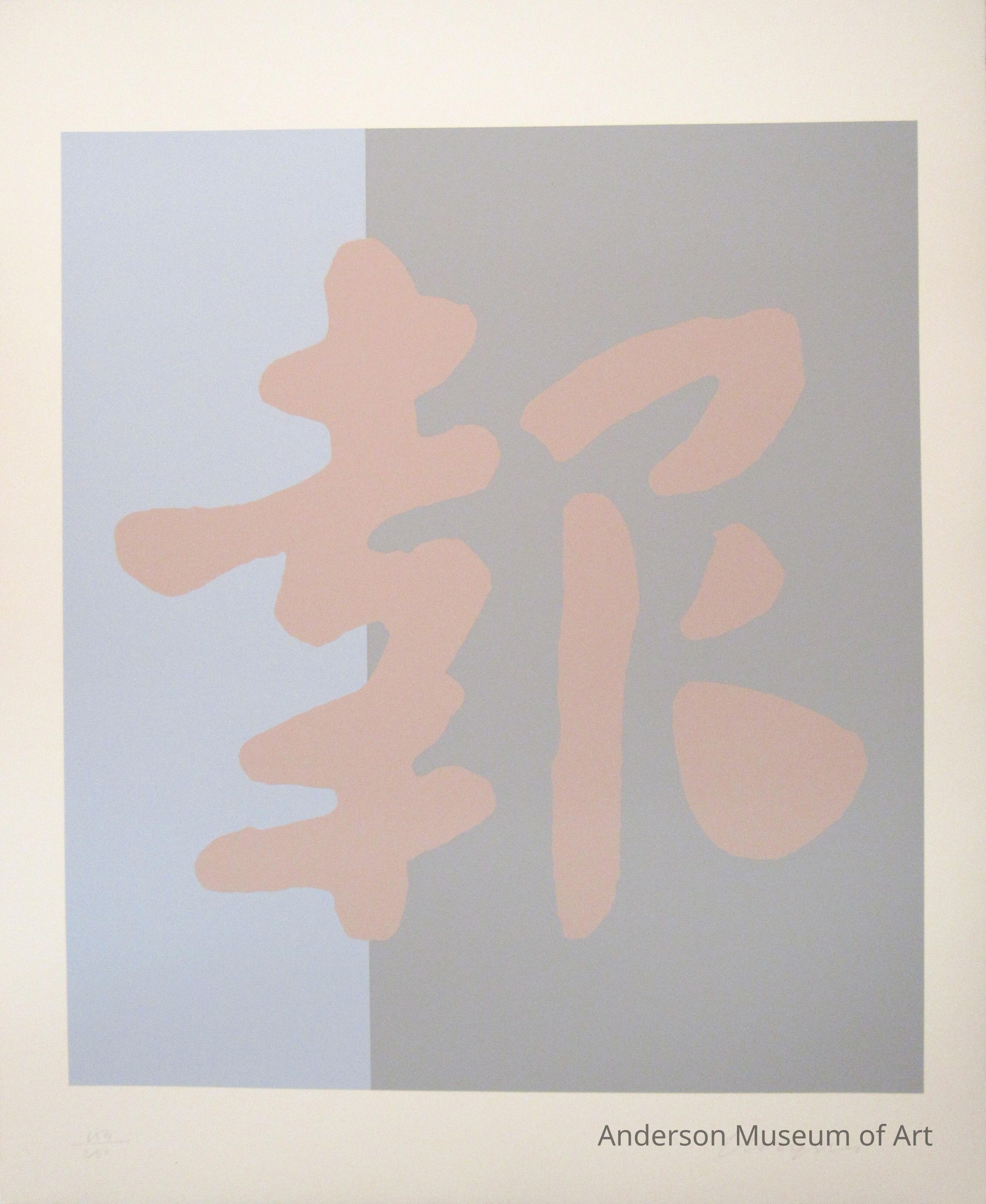 Serigraph on heavy white paper with watermark in the lower-left corner running vertically upward, illegible through ink. The image depicts two large Asian characters which are both grey on a black rectangle, which is bordered in grey. The print is numbered in pencil in the lower-left corner, "153/250" and is signed in pencil in the lower right corner,