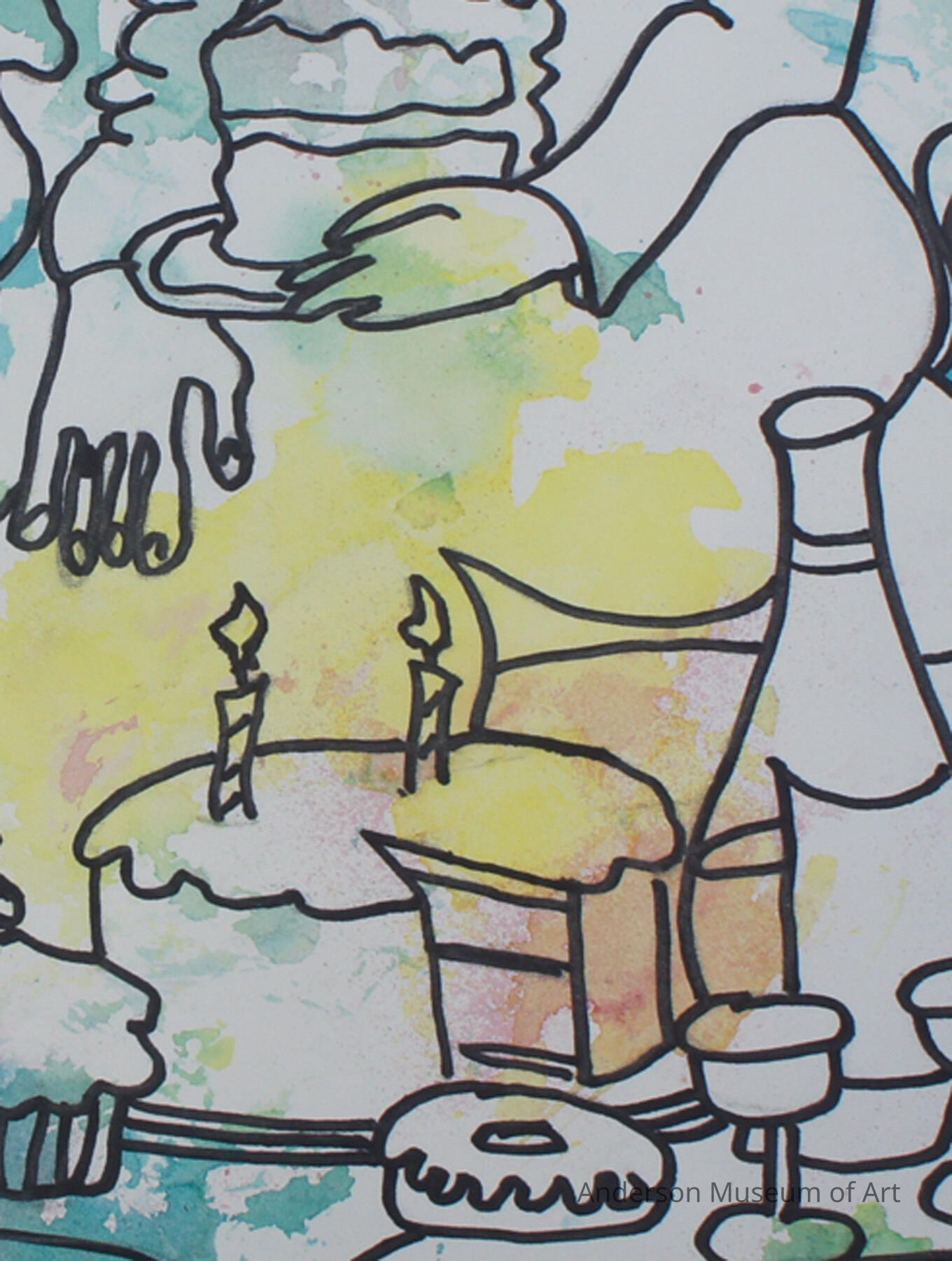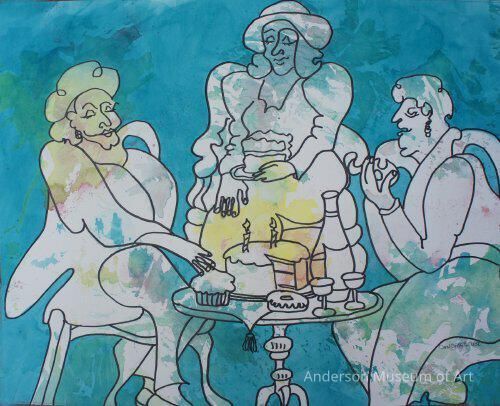 Drawing of three women, all very curvy, sitting around a small table which has a cake with two candles, a cupcake, a donut, and wine bottle, and two glasses. The woman on the left is reaching for the cupcake, the woman in the middle, who has a hat on, is holding a slice of cake, and the woman on the right is eating a donut. The women and objects are all drawn with a single black line. The background and coloring are mostly blue. There are areas of yellows and orange near the center and around the lady's face on the left. There are areas of white also showing through. Signed bottom right corner "Carol