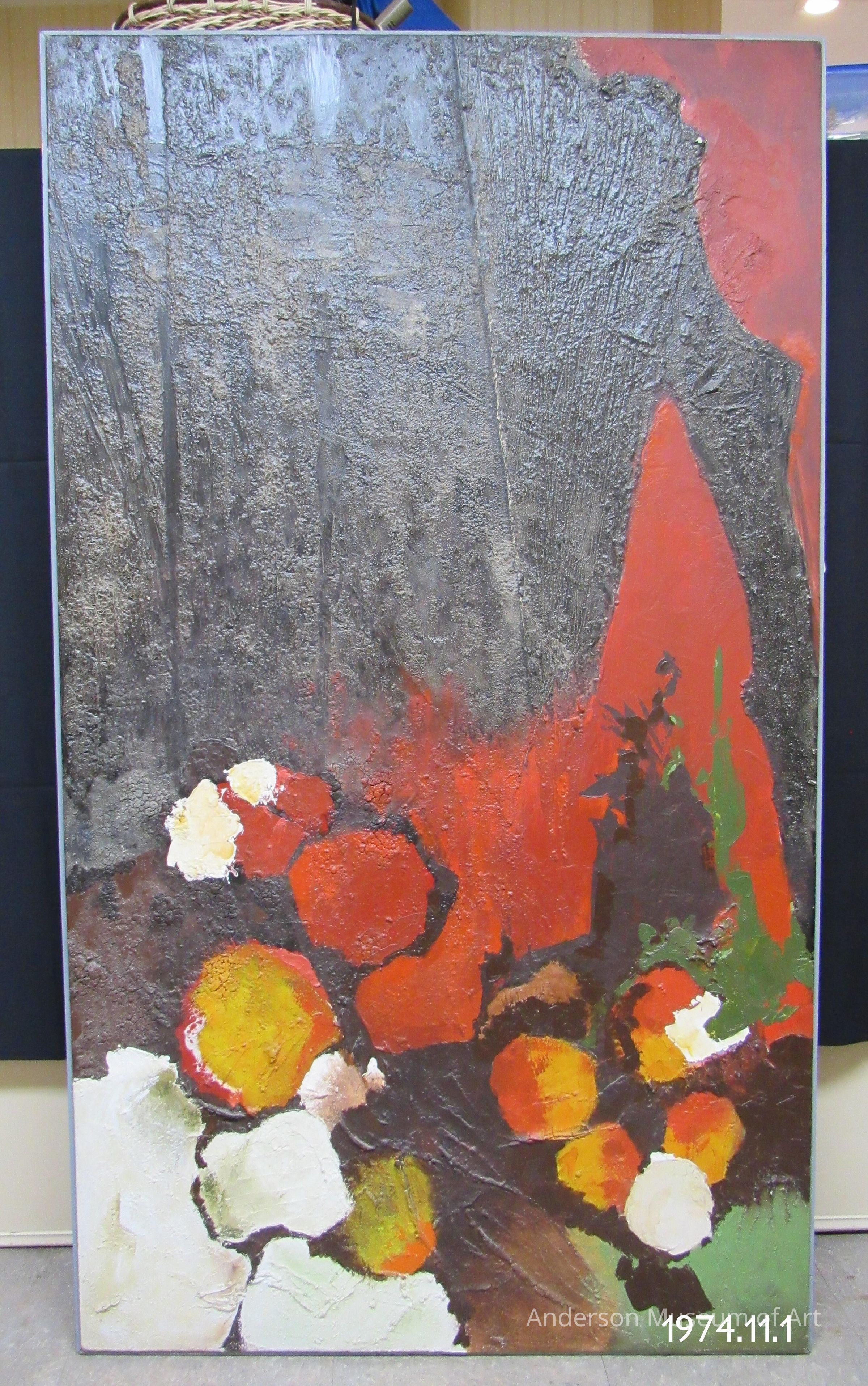 shapes.A red peak moves up the right side of the painting, with green, white, and orange paint at the base of the peak. The TR corner is painted red, and the red corner moves down the right side of the piece until about half way. The rest of the piece is a very textured, thick, brown paint that looks like it has been built up to mimic the look of a rough, natural surface.