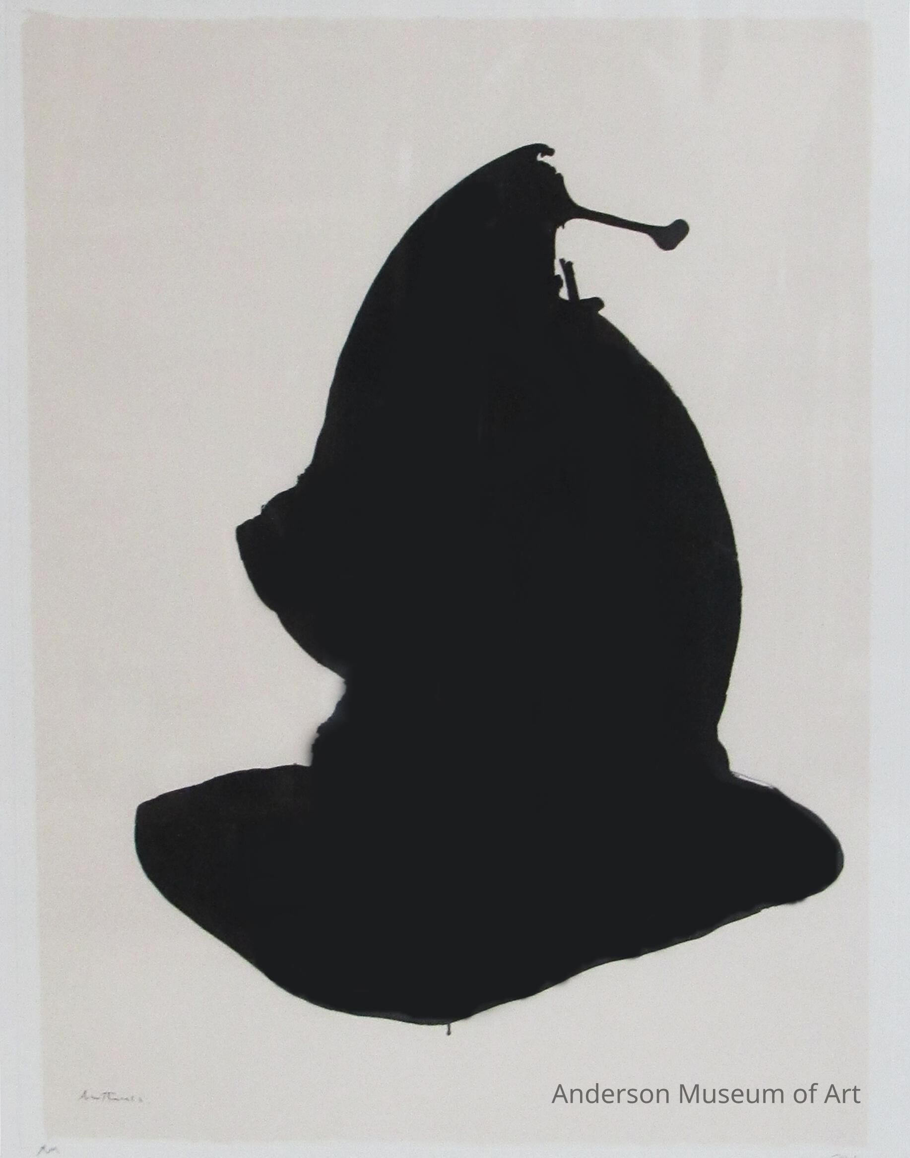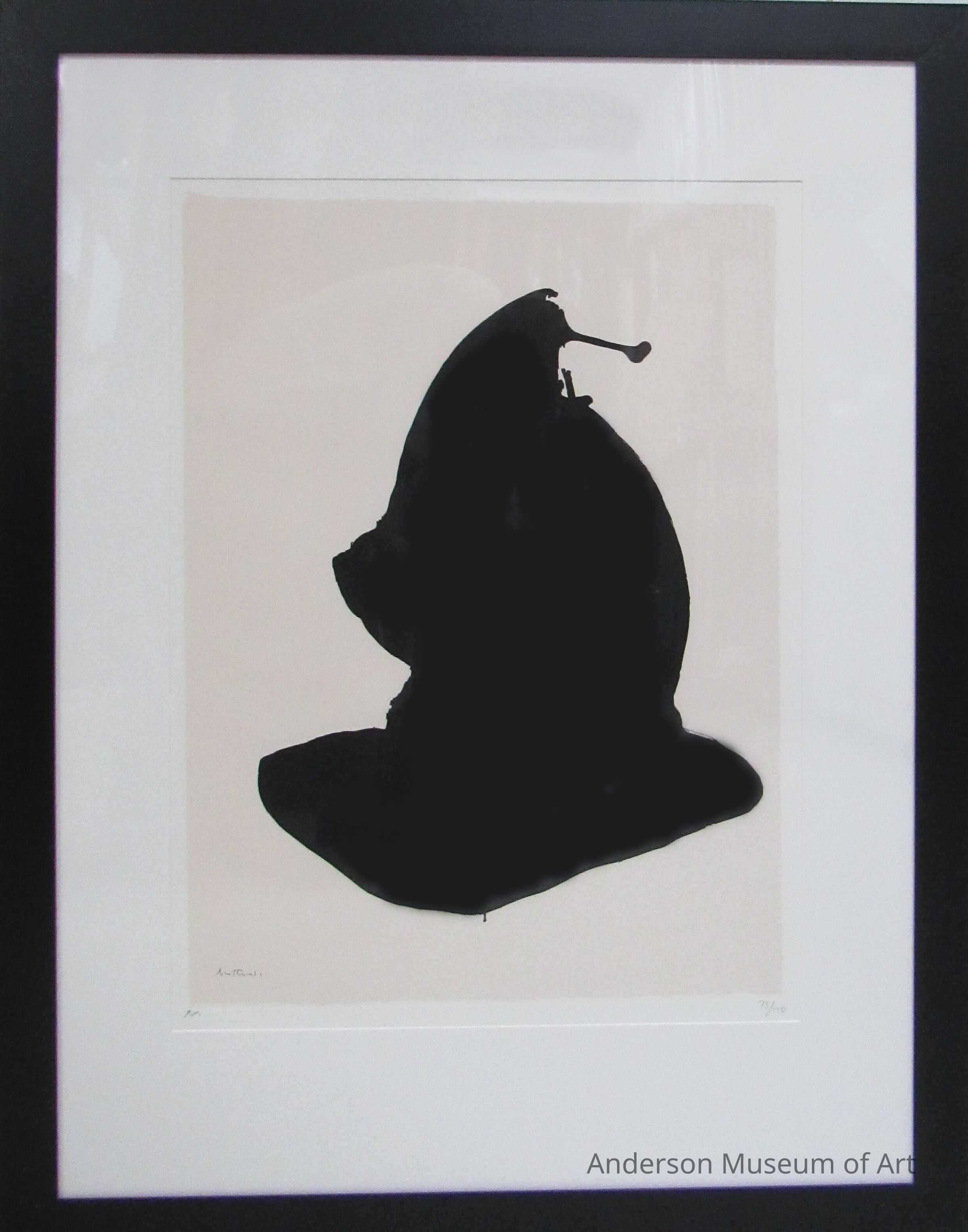 Offset lithograph on heavy white paper with watermark in the upper right corner. The image is non-representational of a large black form centered in a creamy beige field of color. The print is signed in the plate in black ink in the lower-left corner "Motherwell." The print is initialed by the artist in pencil immediately below the image to the left "RM" and is numbered in pencil immediately below the image to the right "73/150". The artist's embossed mark appears in the lower right quadrant and an embossed printer's or publisher's mark appears in the lower right corner, "J. Green."
