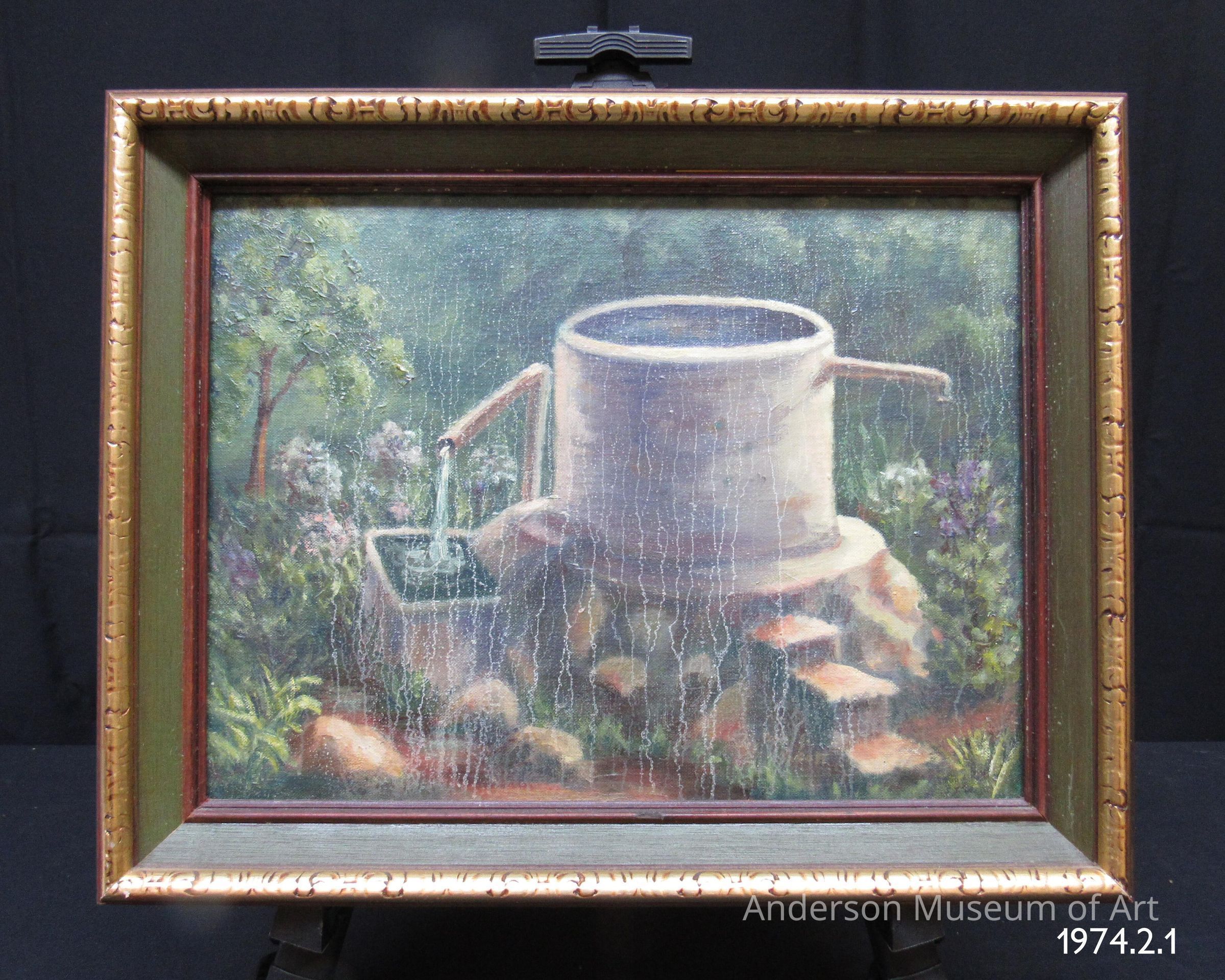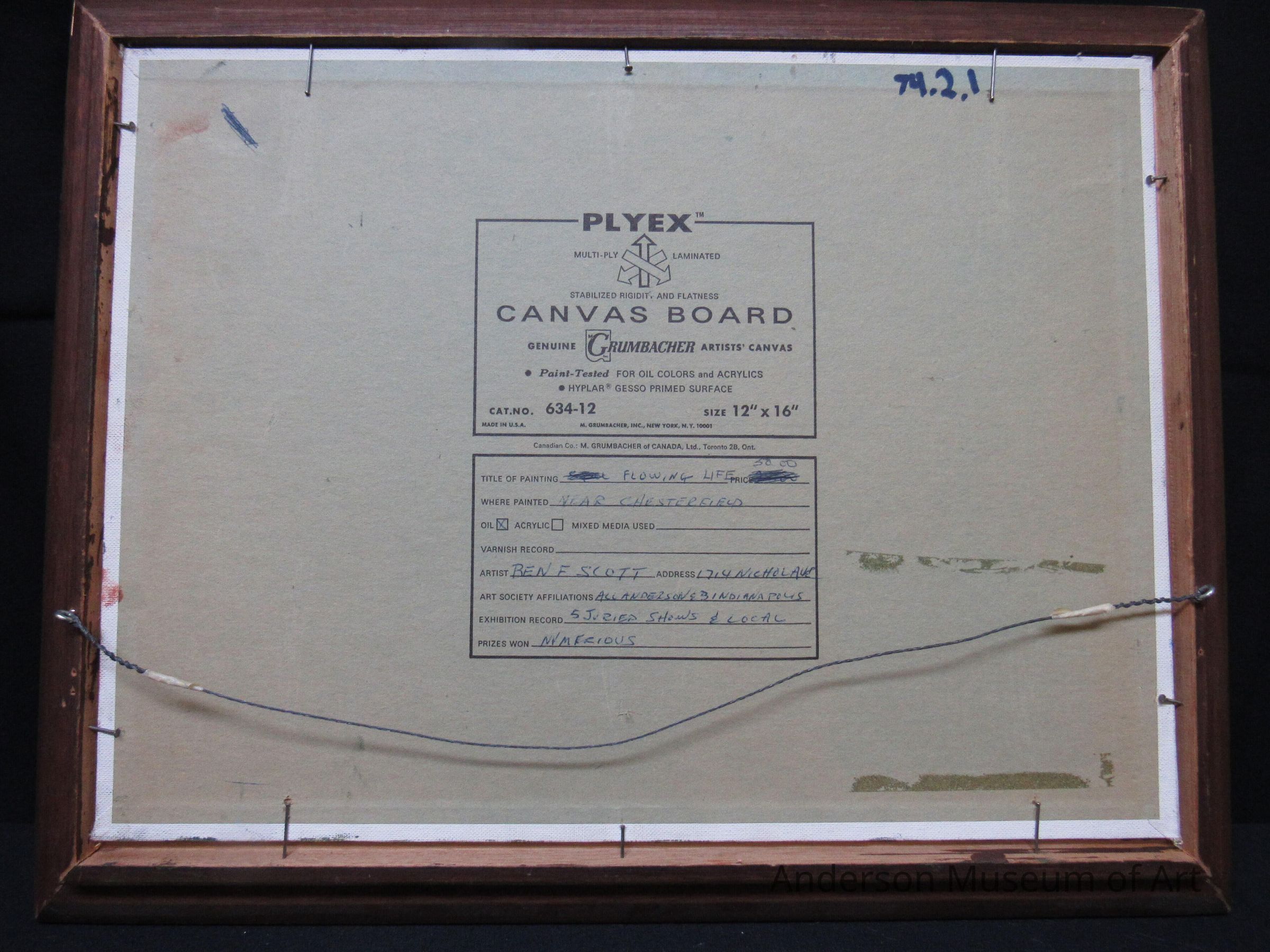 Label on back reads "Flowing Life / $50 / Near Chesterfield / Oil / Ben F. Scott / 1714 Nichol Av. / Art Society