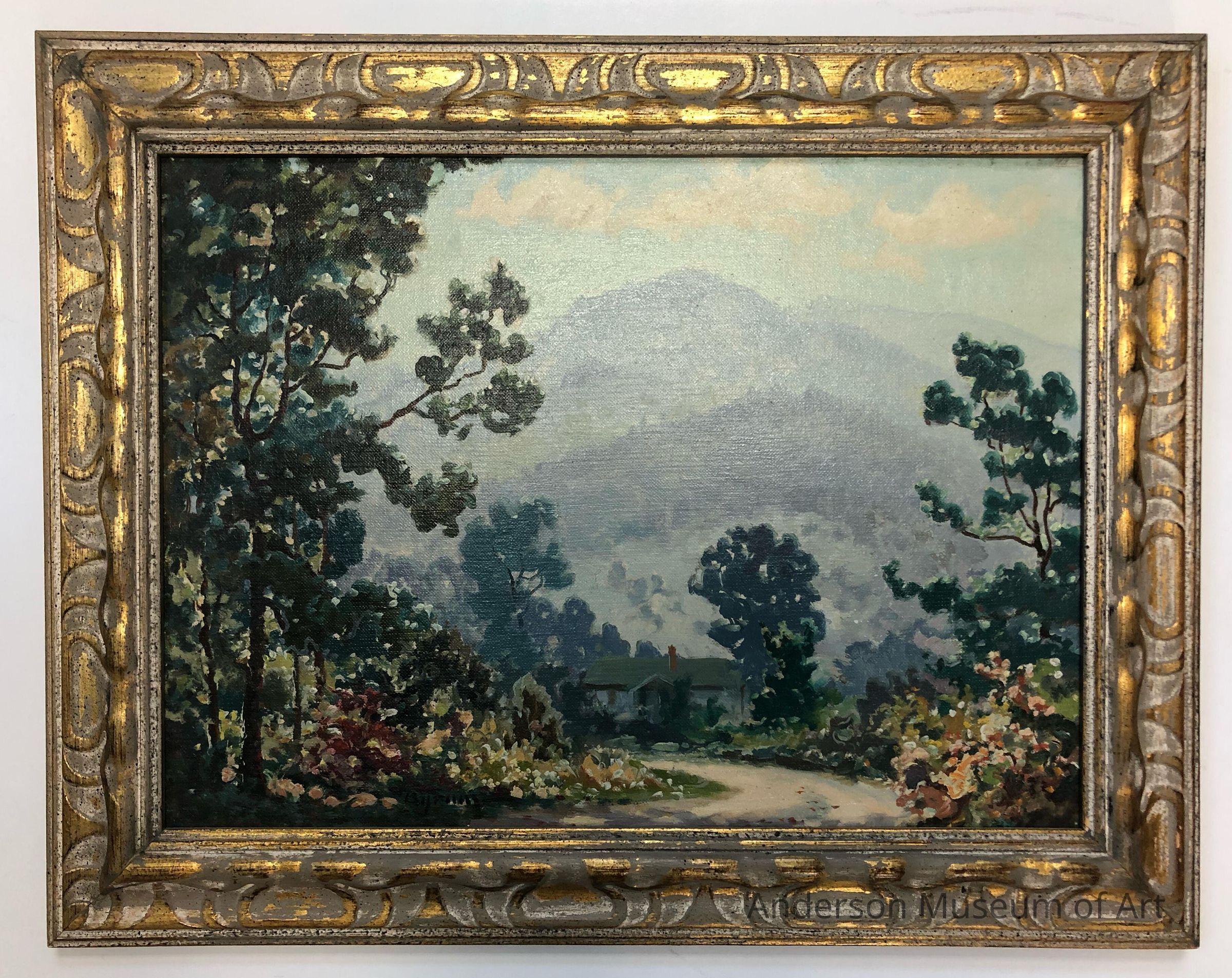 Landscape featuring a one story cottage in the center foreground. There are large trees in the foreground covering the entire left side and half way up the right side. A curved dirt path leads to the white cottage. Mountains fill the background. Fluffy clouds in the sky. Palette is very cool toned with hits of red and yellow in the foreground. Signed BYRUM at bottom just left of center.