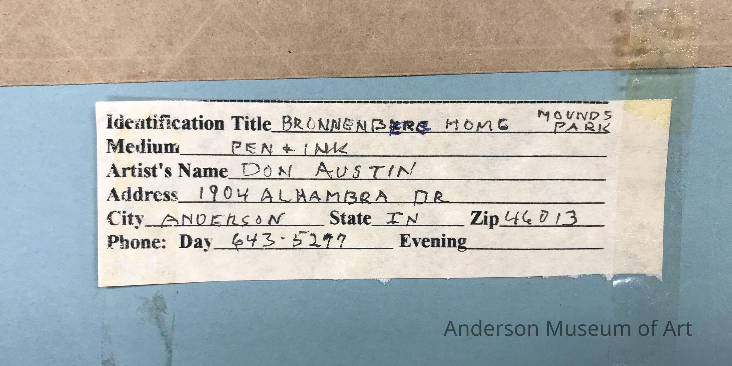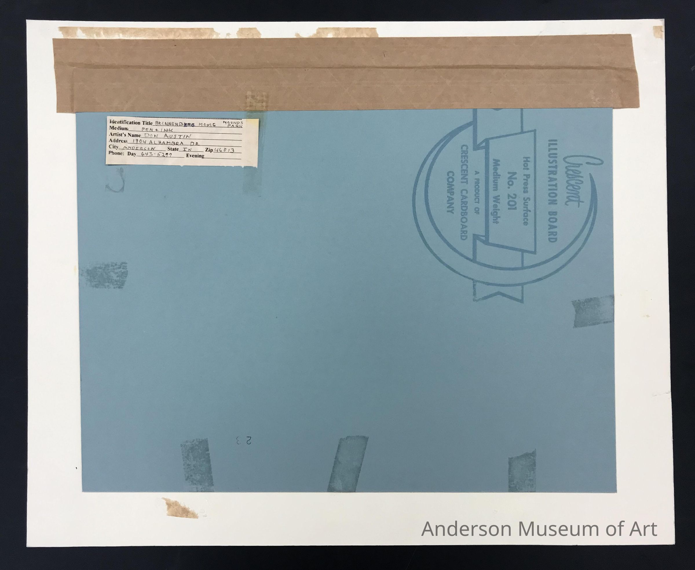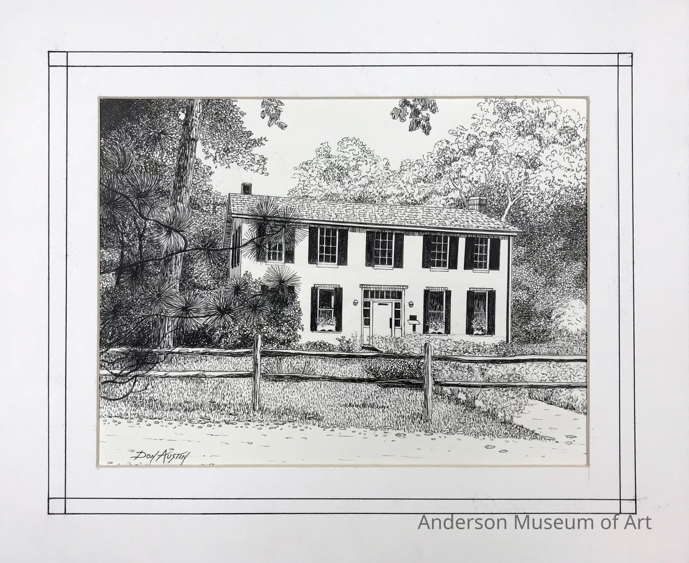 Pen and ink on crescent board. Front view drawing of the Bronnenberg Home at Mounds State Park. Depicted is a two story home with nine windows and a door in the front. The home is surrounded by large trees. There is a wooden rail fence across the entire foreground. Signed Don Austin in pen LLC.