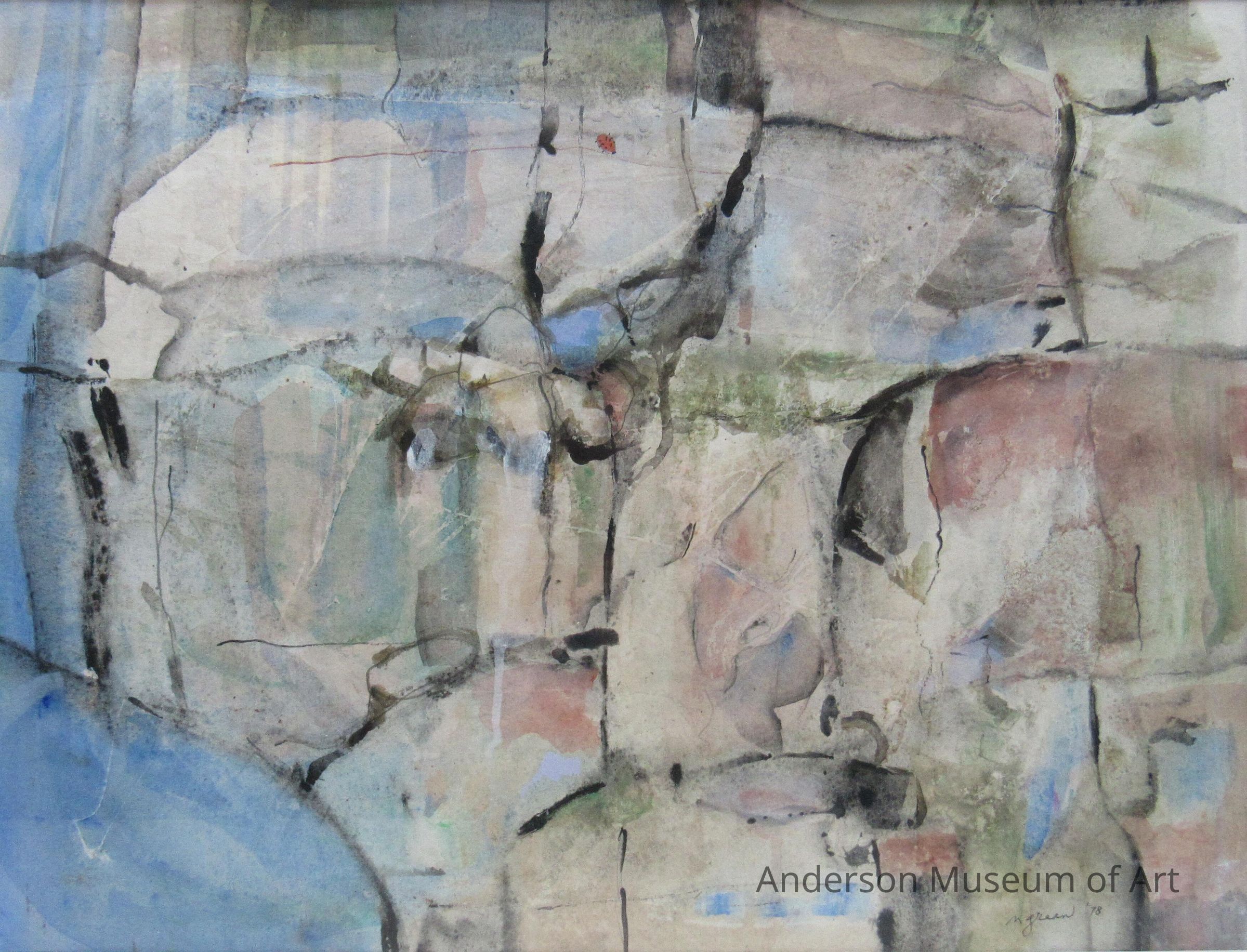 Pastel colored sections with black emphasis. Small lady bug-like object in top center. Lower left corner and left side dominated by blue. Possibly a close up of rocks. Best of Show in watercolor for the 1979 Anderson Winter Show.