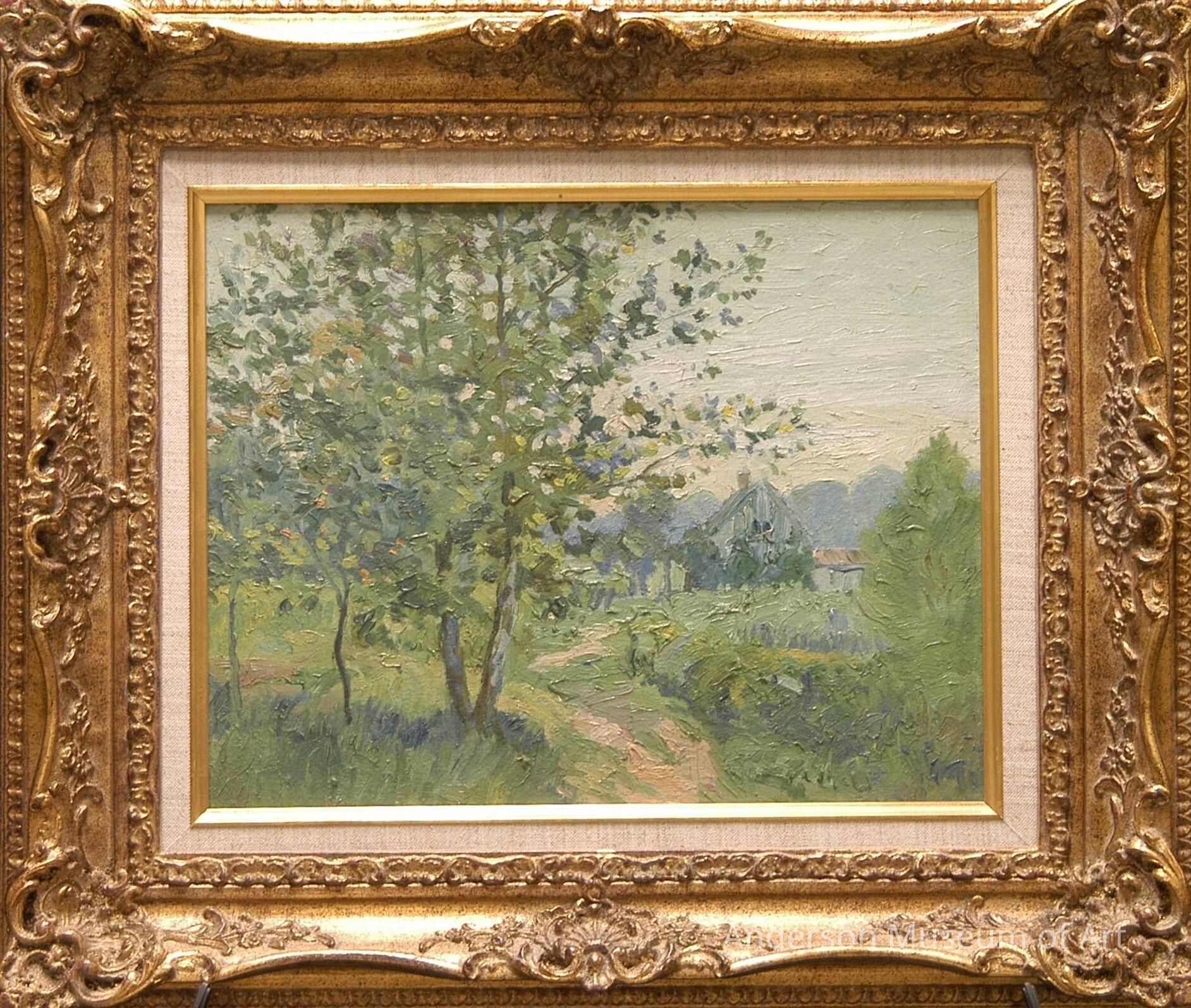 Landscape with three small trees in the foreground on the left side and one larger fir tree in the middle ground along the right side. There is a house in the right center of the picture with hills behind it. A dirt path begins in the center foreground and leads to the building. Signed "To my friend Gerhardt June 3, 1936 Carl Graf " on the verso.
