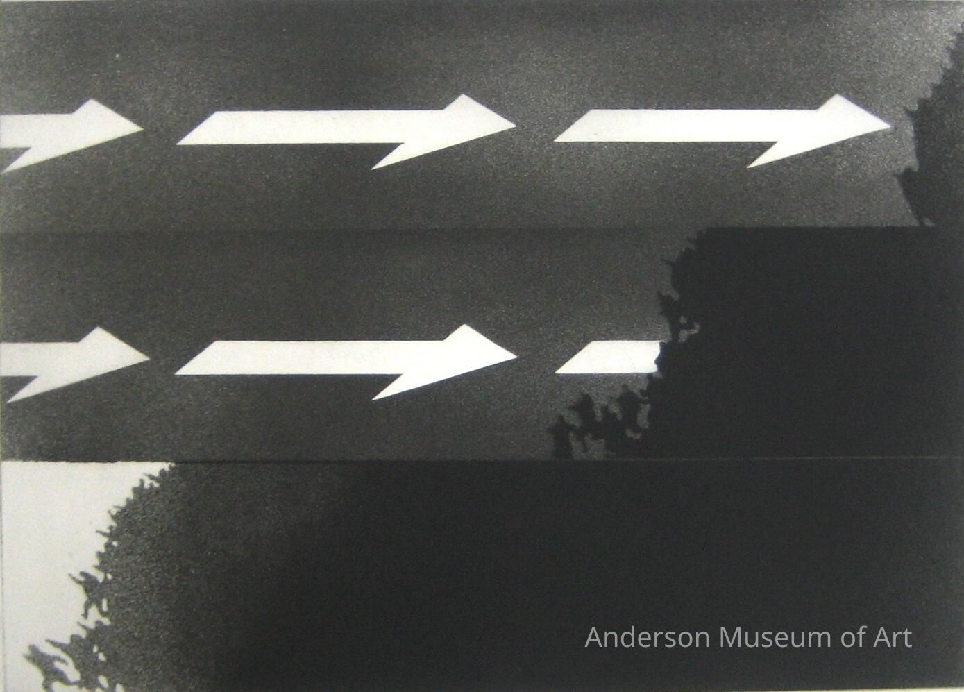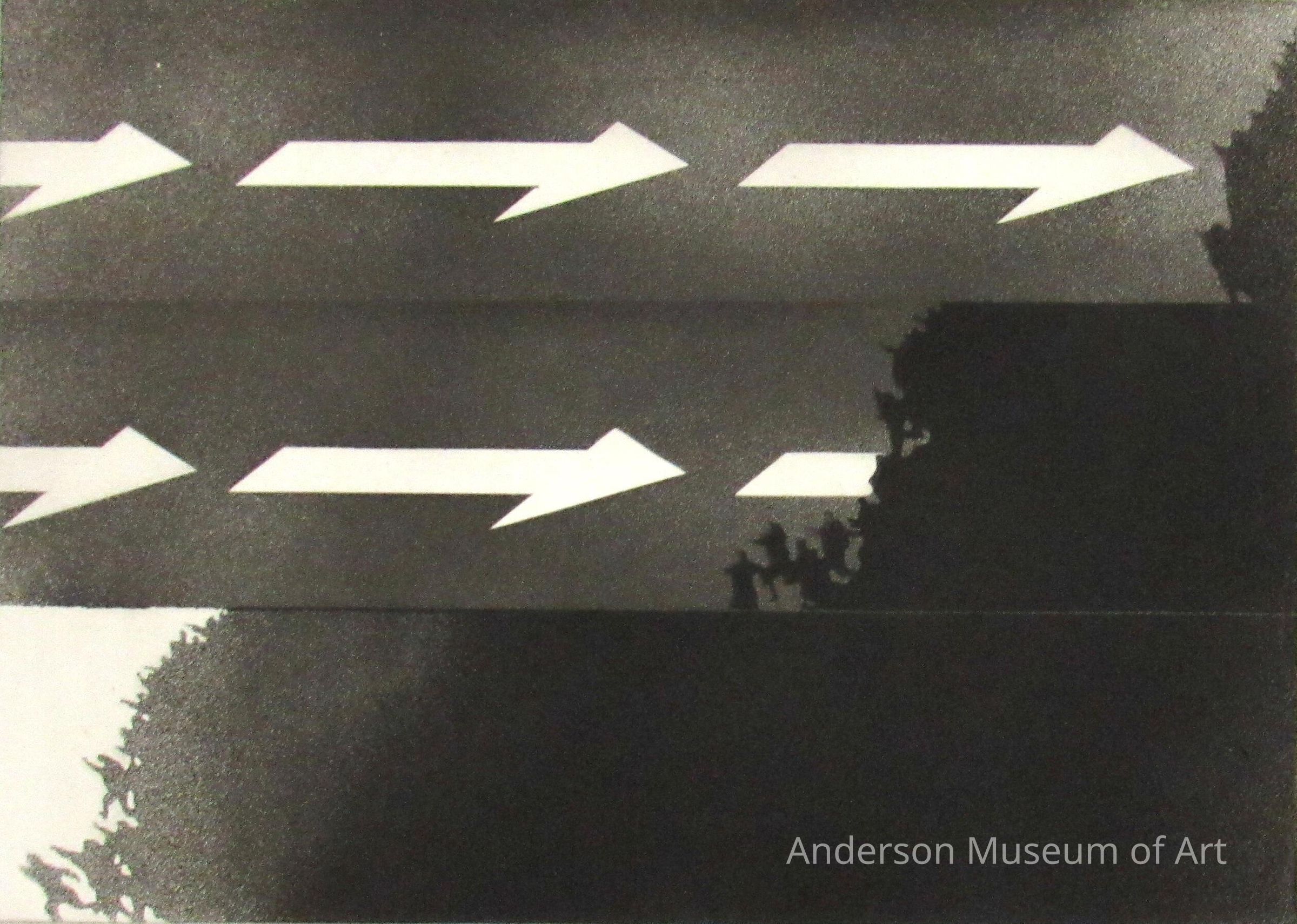 1979.17.1.2 - Black and white print partitioned into three vertical sections. The top vertical rectangle has three white arrows (2 full, 1 partial) pointing right towards a small group of people. The rectangle below still has the three arrows, however the group of people have become a crowd covering most of the right arrow. The bottom rectangle has no visible arrows and is covered almost entirely with the people, creating a mostly solid black rectangle. Same image as 79.13.5.9, but slightly lighter.