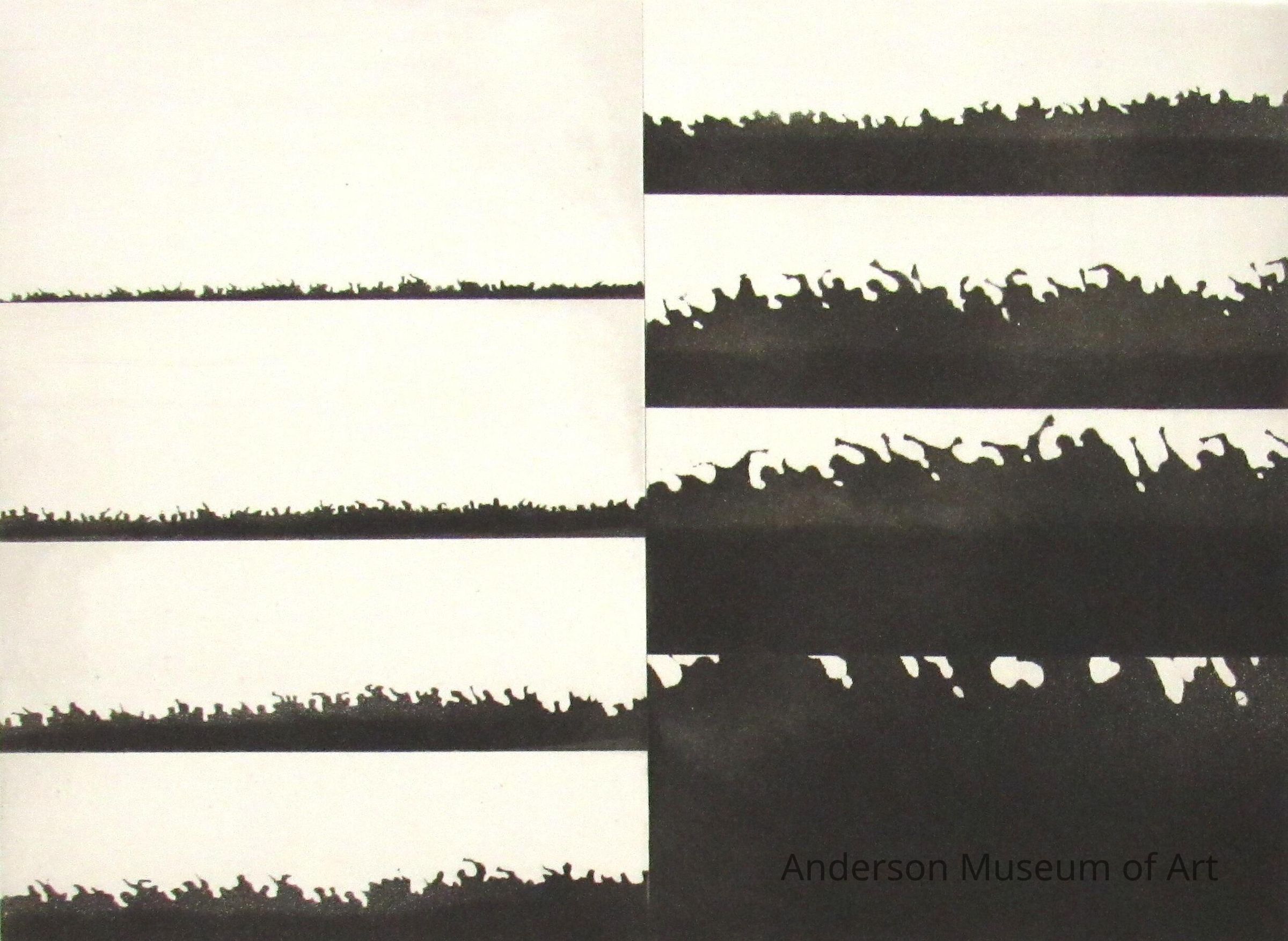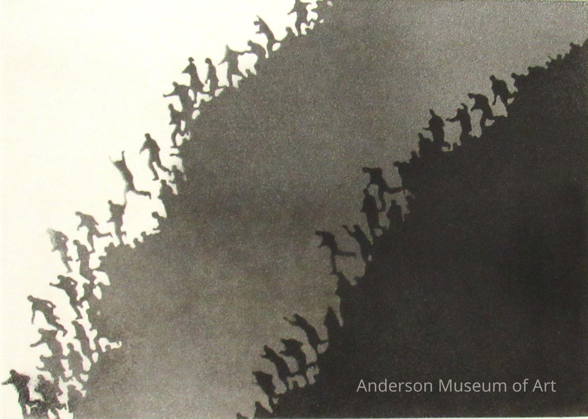 1979.17.1.1 - A third of the image is black with the top of the shape made of figure's heads and arms pointing to the right.