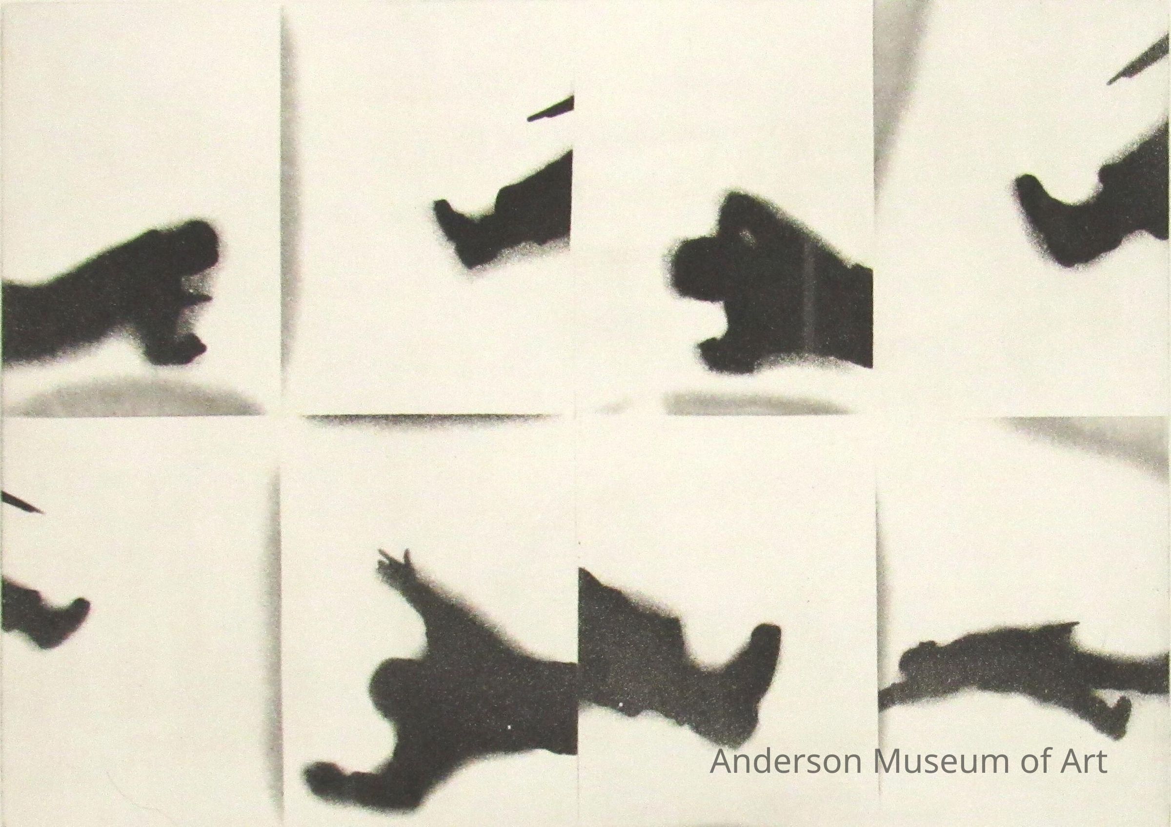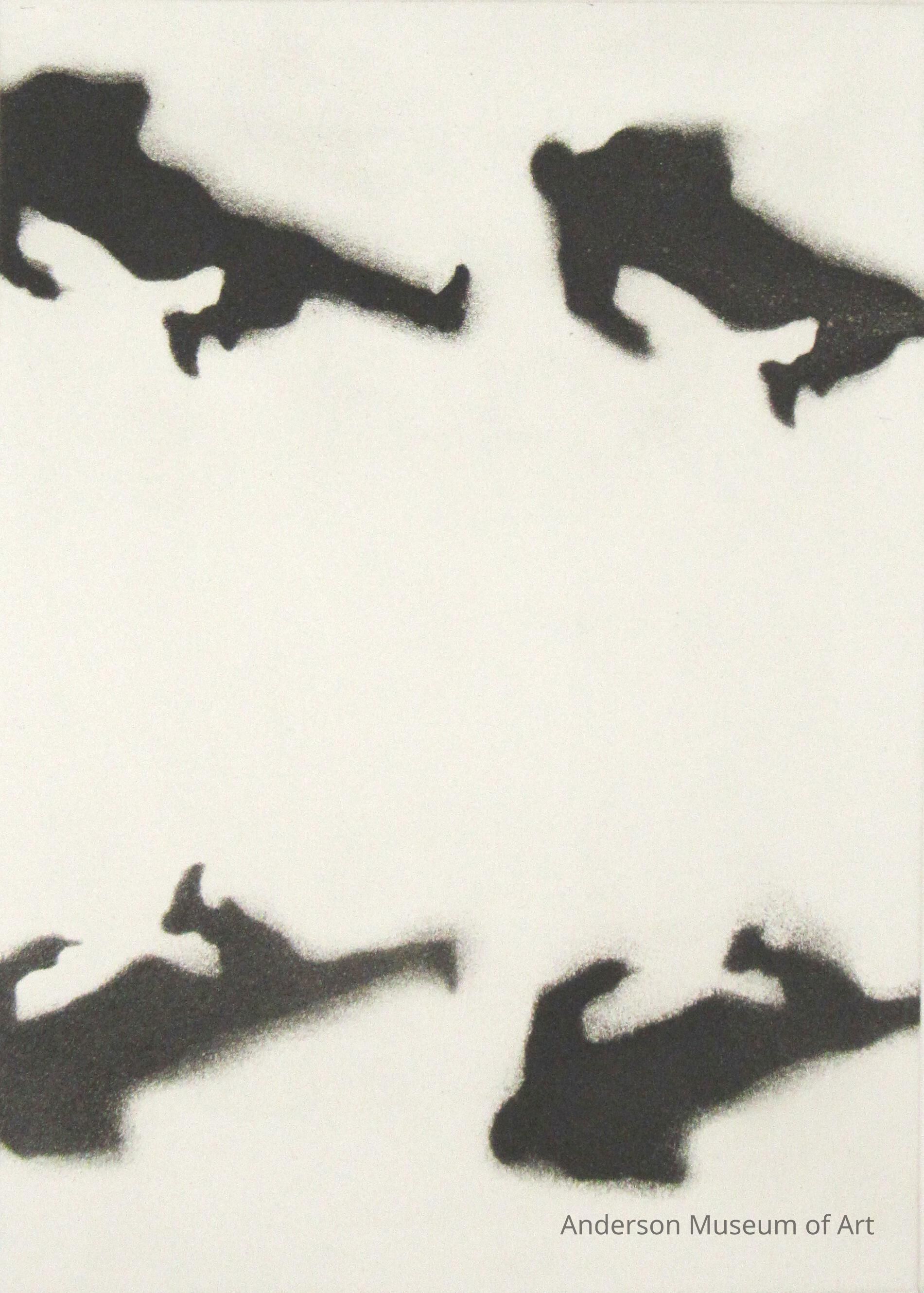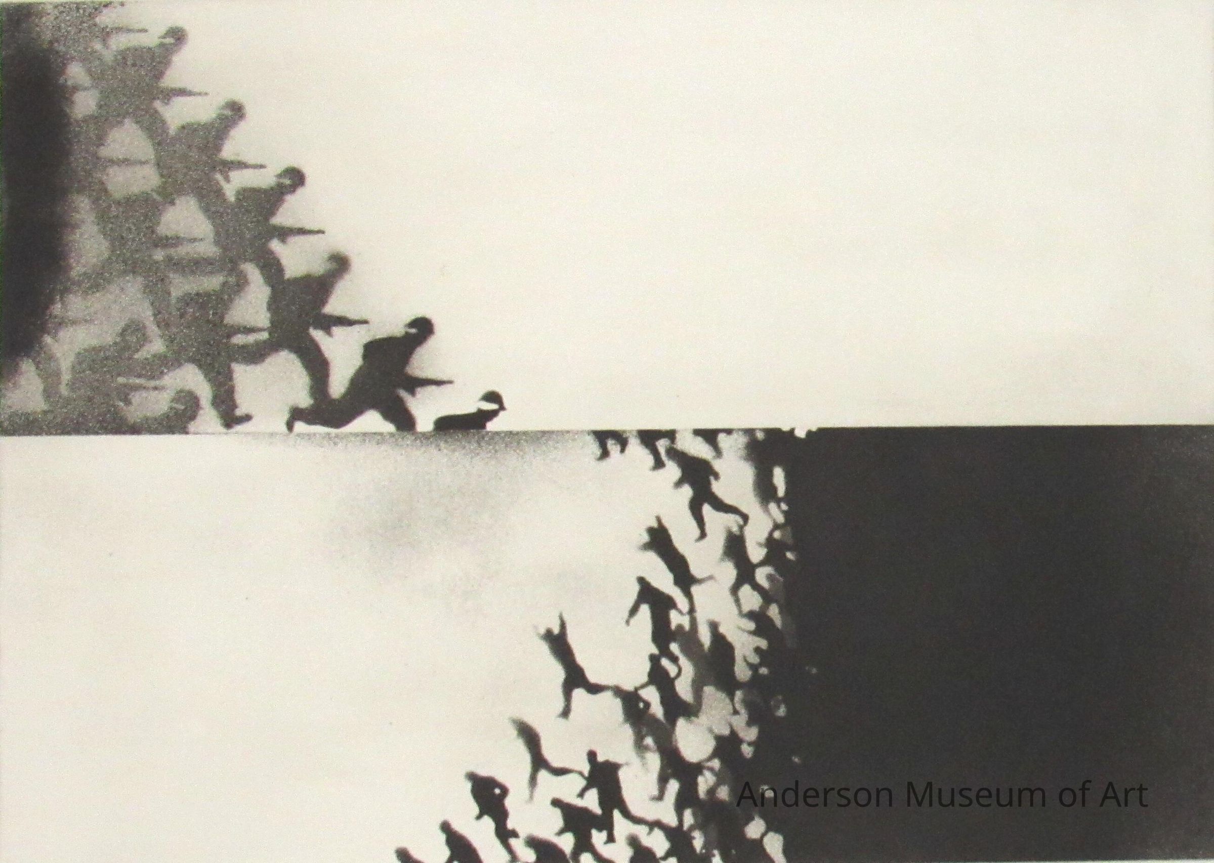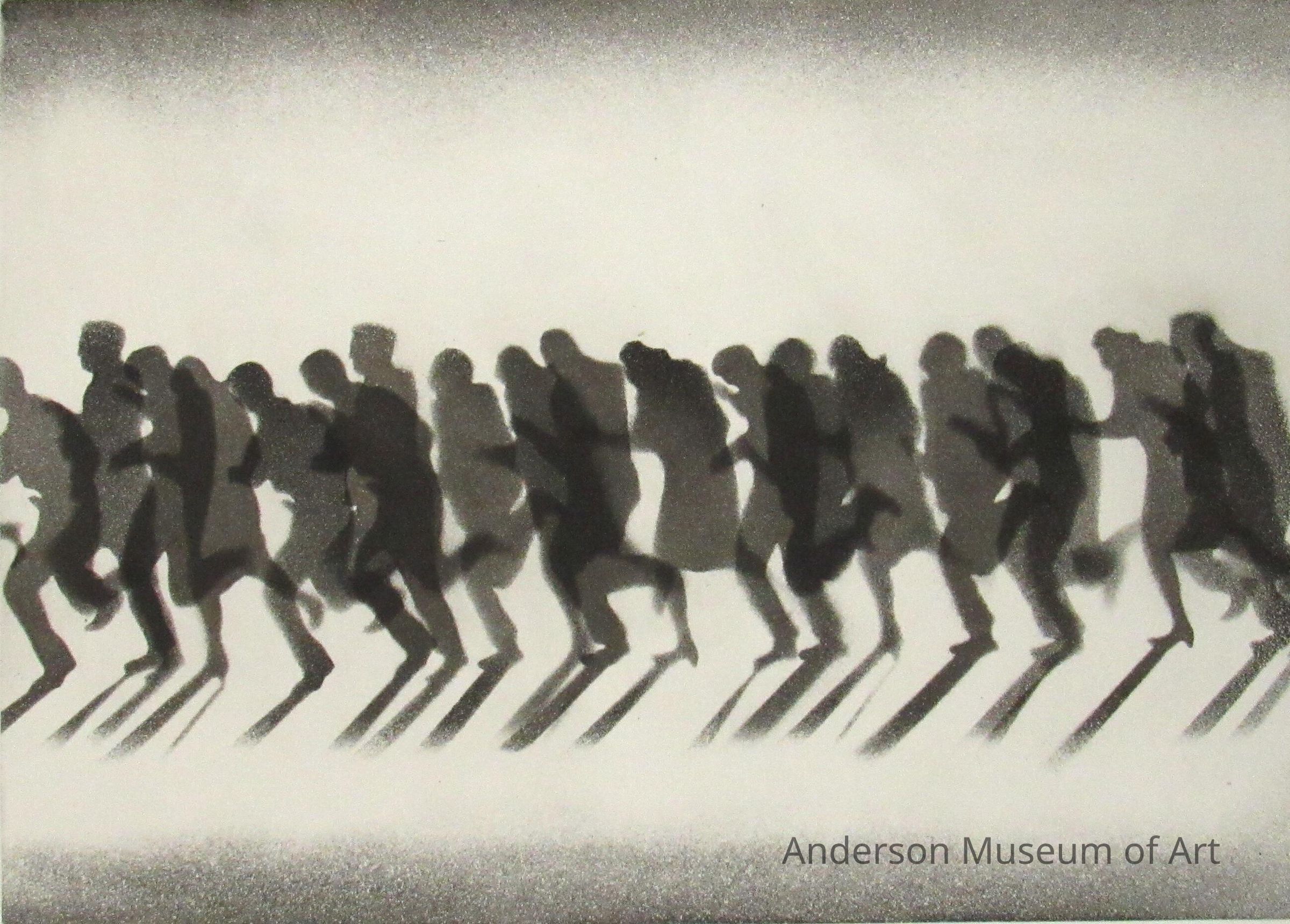 1979.17.1.5 - At least 19 male figures running across the center of the print. All are running left ; some with there heads down; some are overlapping creating a darker space. There are also shadows of their bodies which suggest they are running from the light source. The top and bottom of the printed area are darker and fade to a white center.