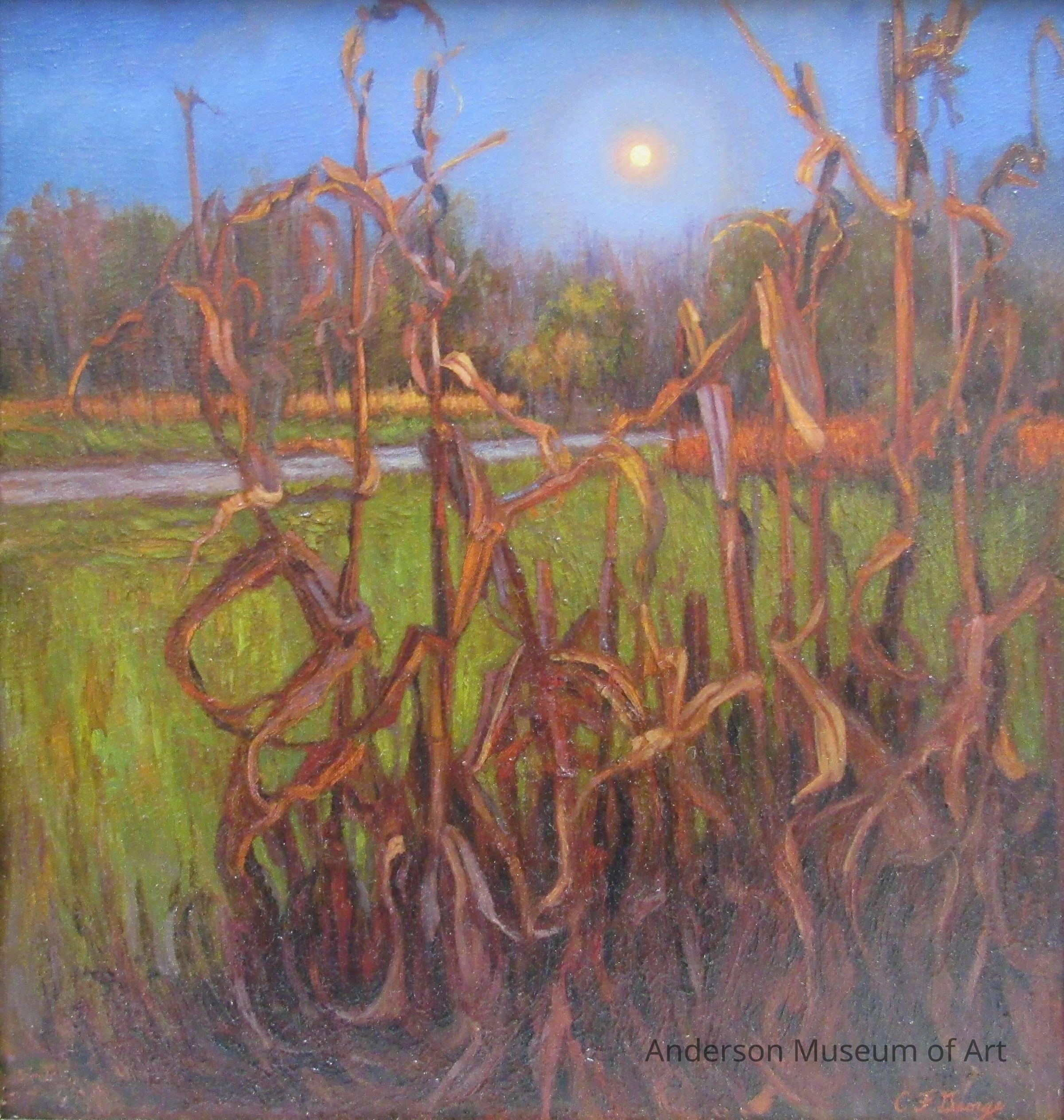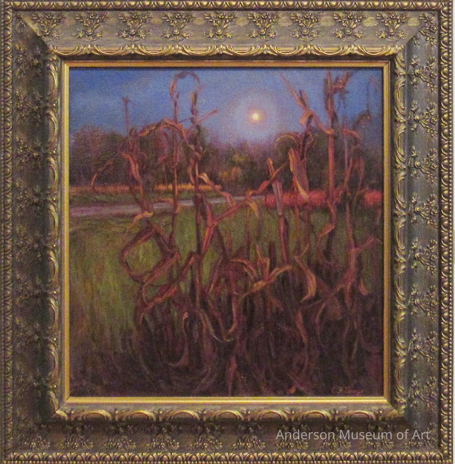 Night scene. There is dried cornstalk in the foreground. The background contains a road that stretches across the painting. There is also a thick tree line behind the road. There is a full moon framed by the corn stalks in the foreground in the top middle right.