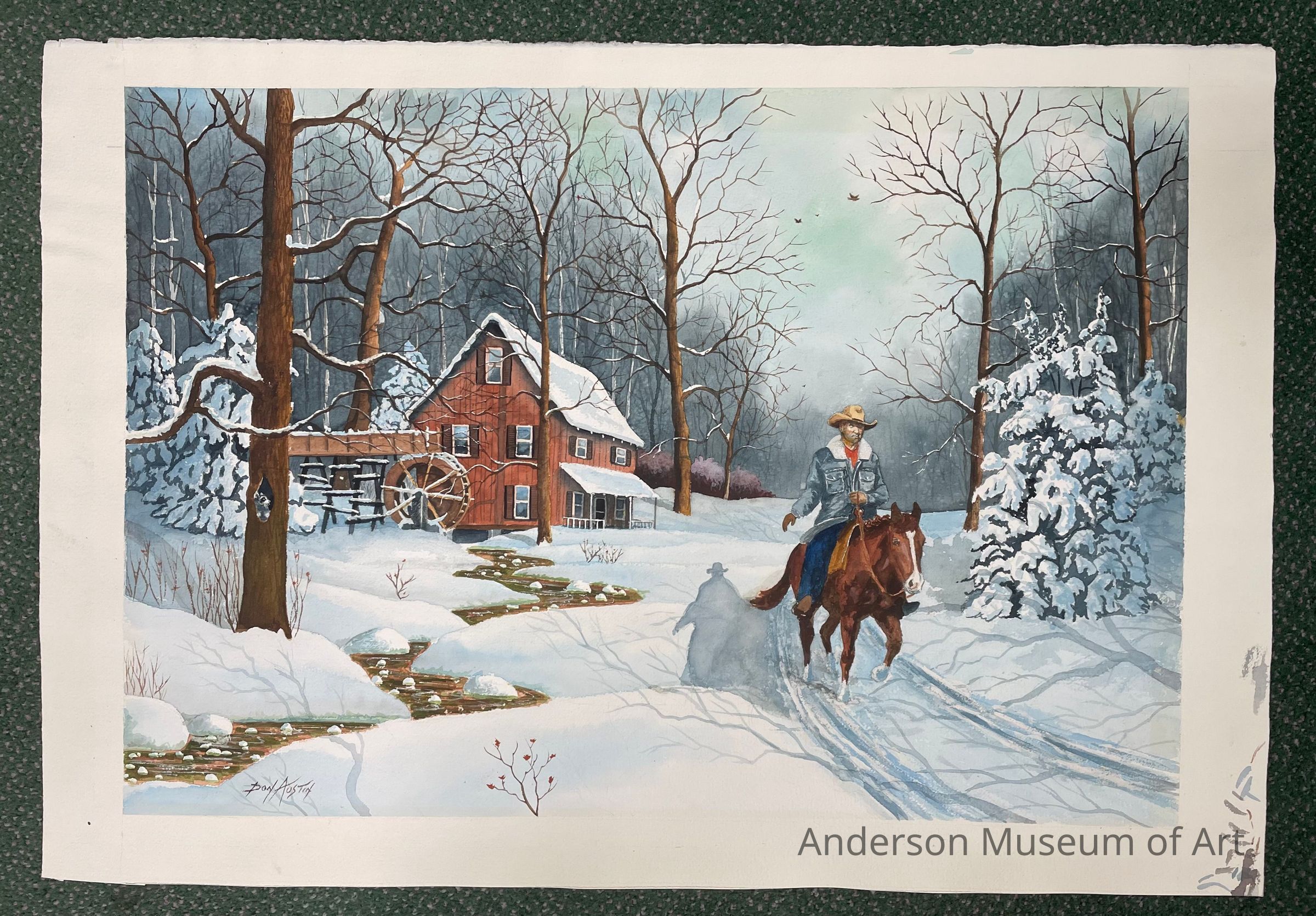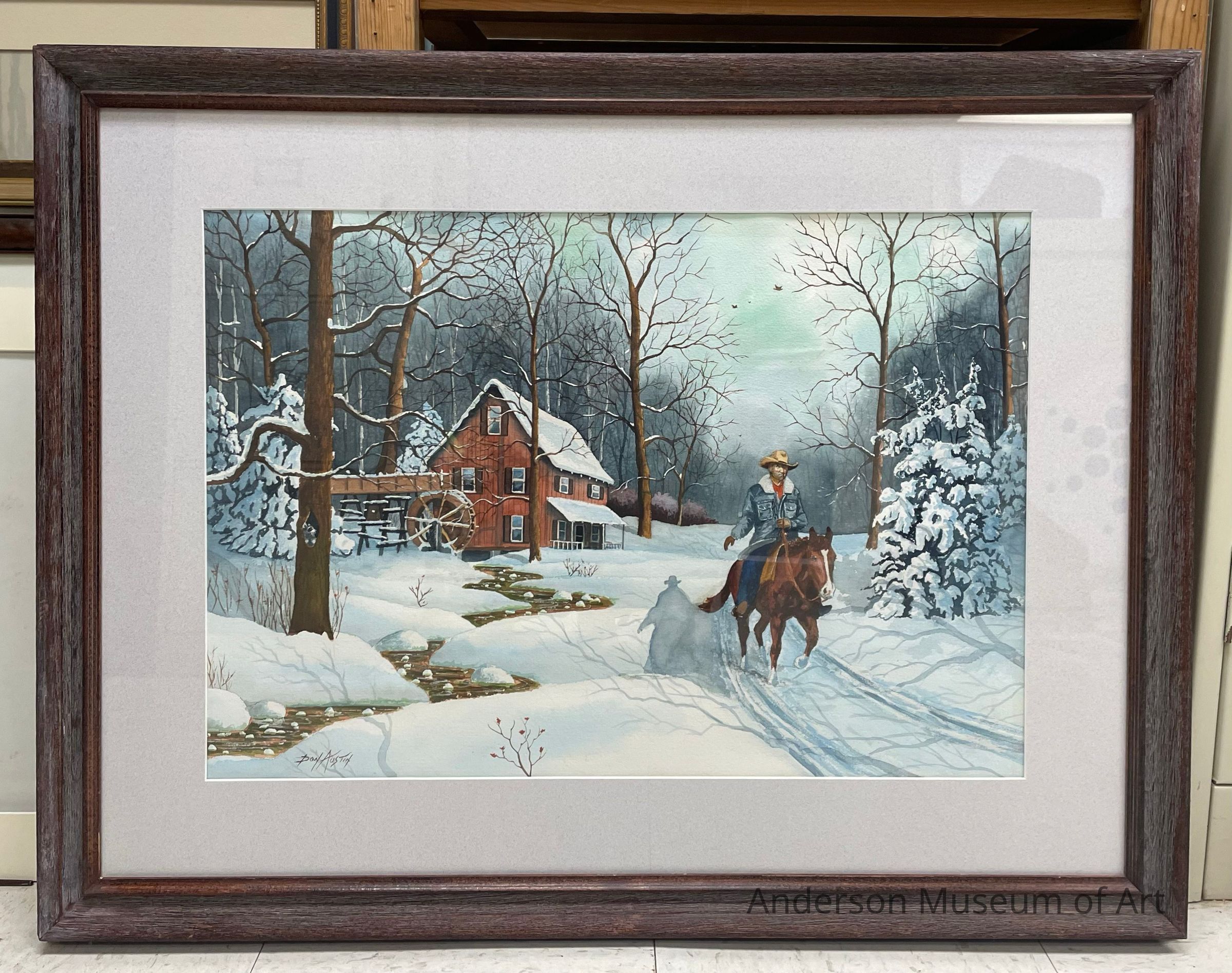 Winter scene of a red house with a waterwheel on the side, six visible windows, and a front porch. There is a white man on a brown horse in the foreground. He is wearing a cowboy hat, a denim jacket with a white collar, a red shirt, and jeans. He is casting a heavy shadow behind him on the snow. There are a mix of bare trees and fir trees throughout the painting. There is a tiny little creek winding up the left side and the sky feels a little overcast. Signed Don Austin in the BLC.