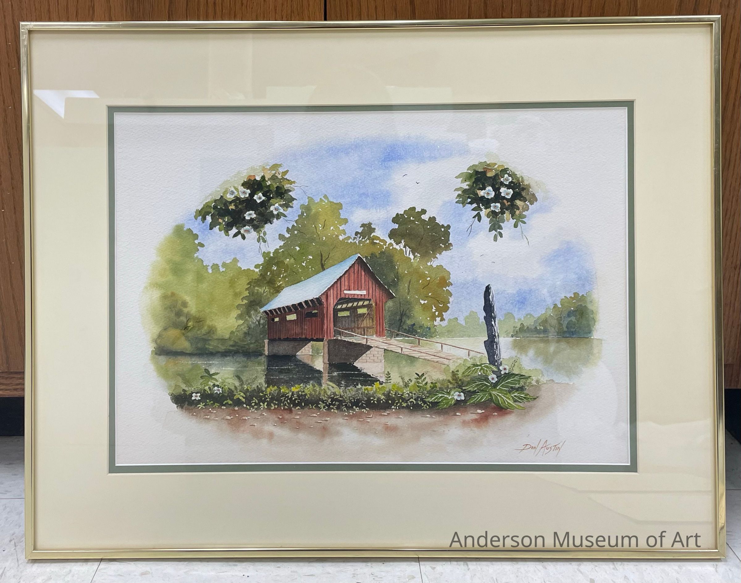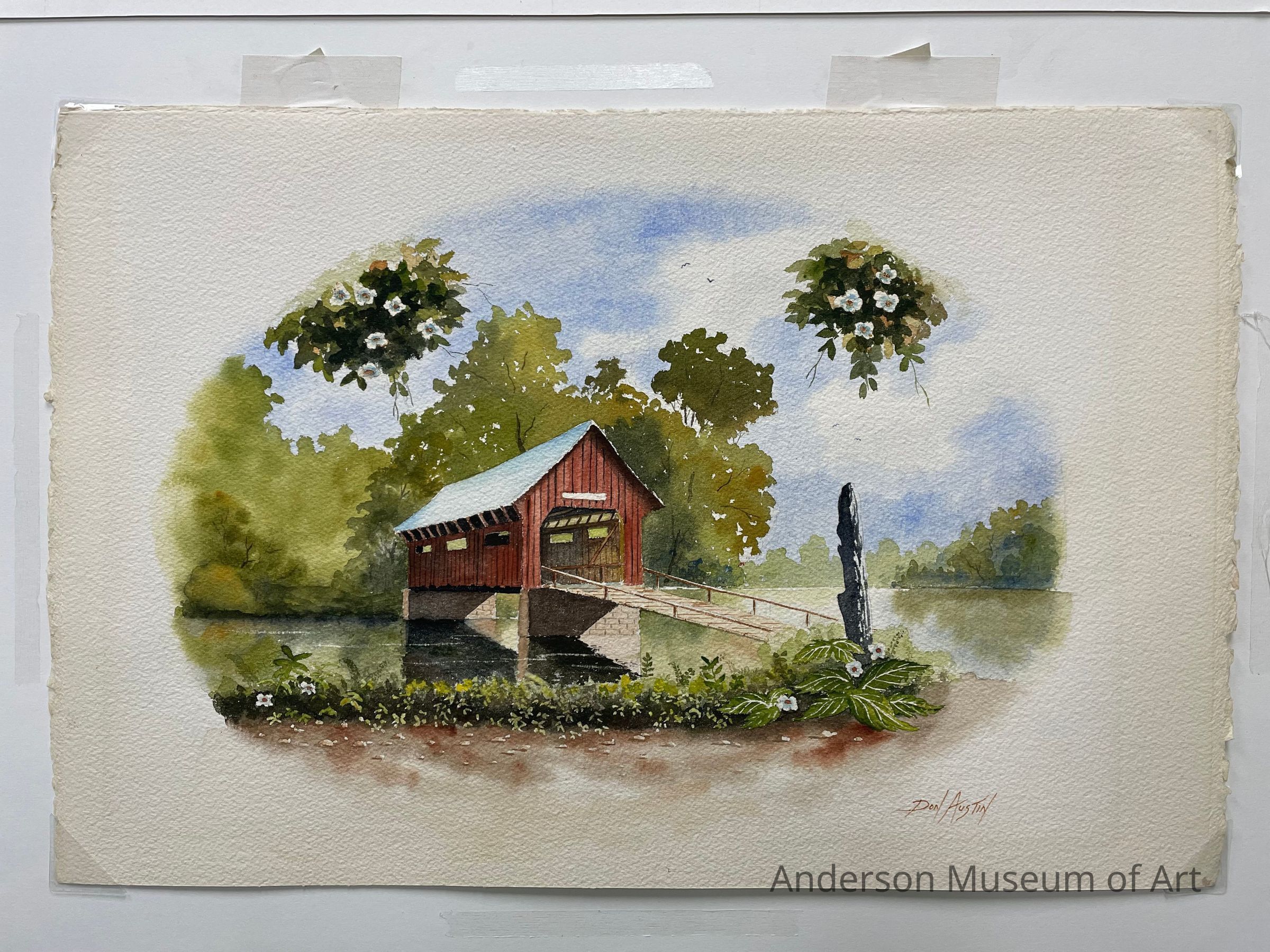 Summer scene of a red covered bridge over a body of water, looks larger than a river. There is a dirt path in the foreground lined with green foliage and five white flowers. There is a grey wood post to the right where the path meets the ramp. The water is painted in shades of green. The trees and the sky are not detailed at all compared to the foliage in the foreground. The viewer seems to be in a wooded/tree area as there are blossoms hanging from the top of the page. It is signed Don Austin in the BRC and the image is painted in an oval shape.