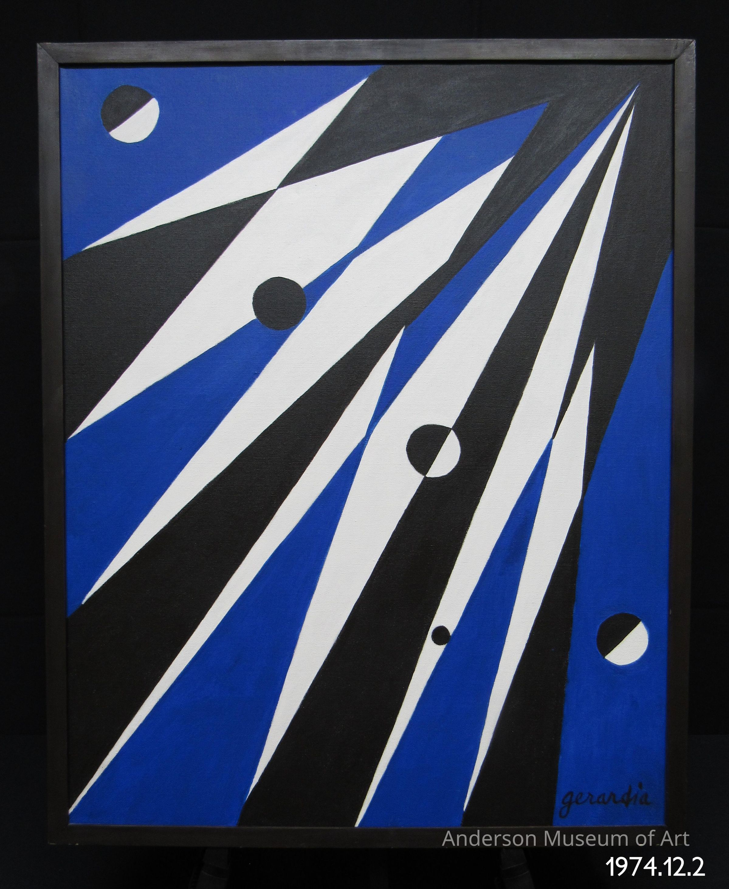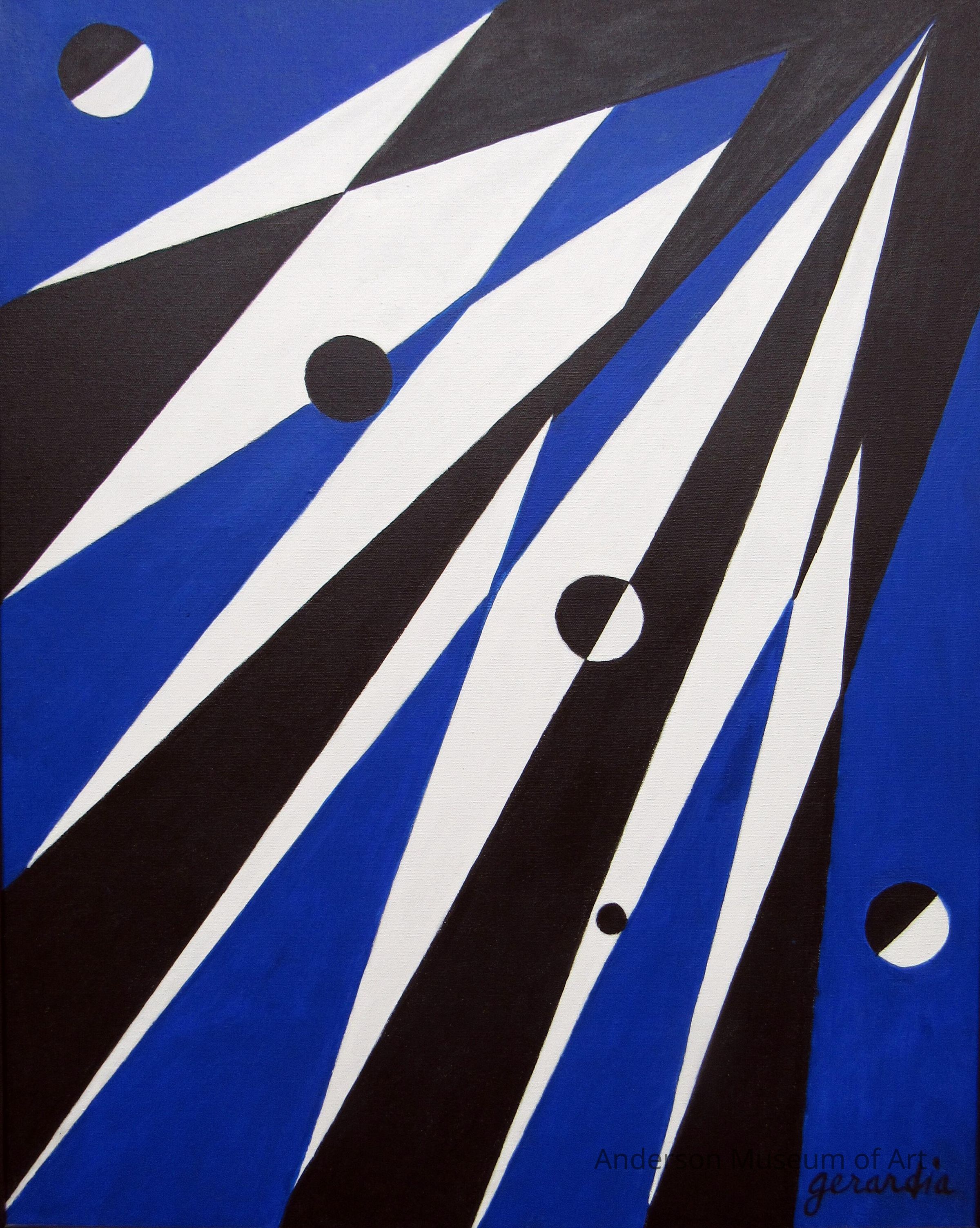 The images are angular, with five small circles. Two of the circles are black while the remaining are divided one side black one side white. The colors used are black, white, and blue, with no color variation, making this a work look flat. The flow of the lines is from the lower right corner to the upper left.
