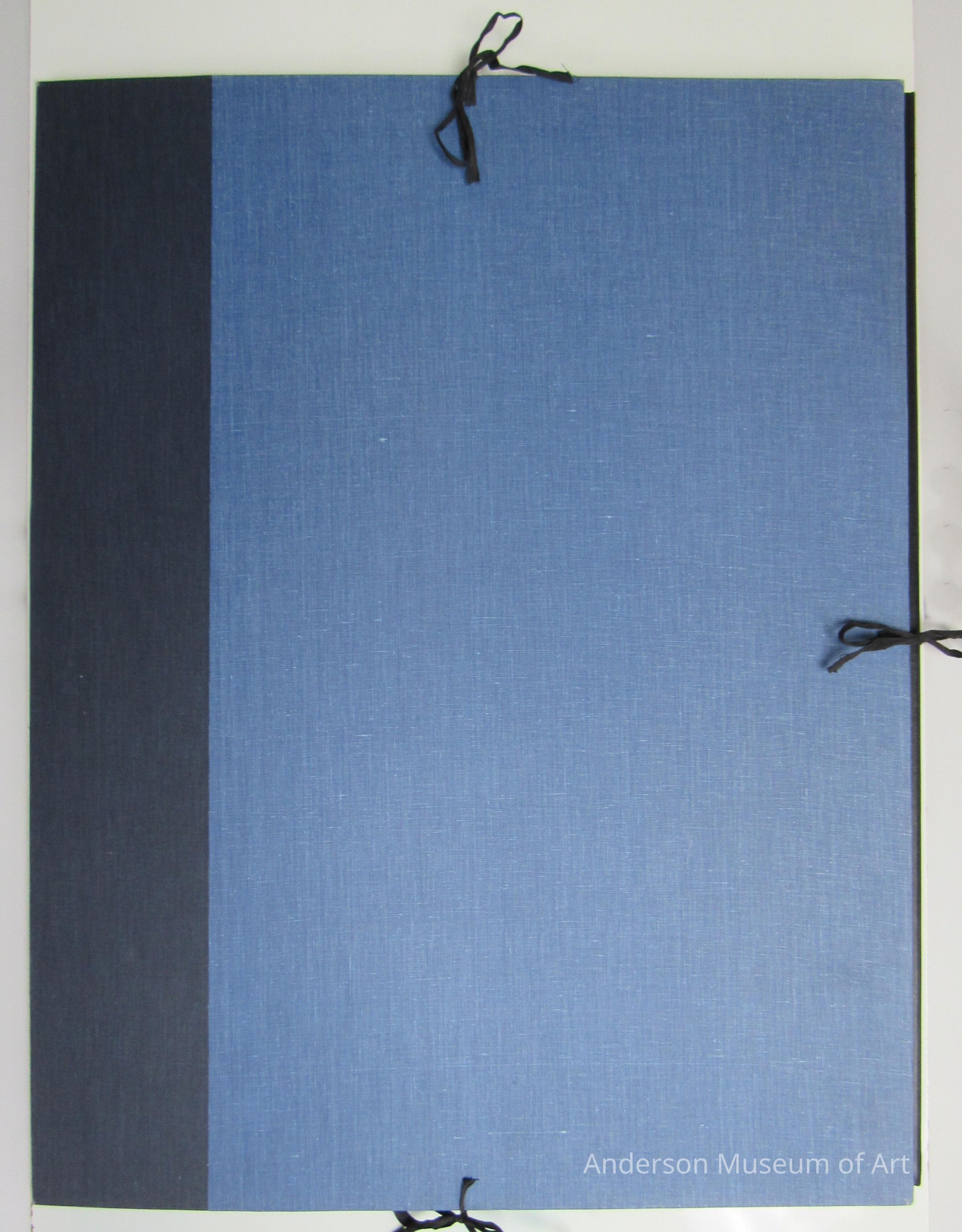 1981.14.2.3 - Grey cover with the title "BLOSSOMS / AND / FLOWERS" written in all caps and in black. The cover is bound with a black material down the spine as well as silver text down the spine which reads "BLOSSOMS AND FLOWERS LEONARD McCOMB CORACLE PRESS". Size: 26.75" x 20.5"