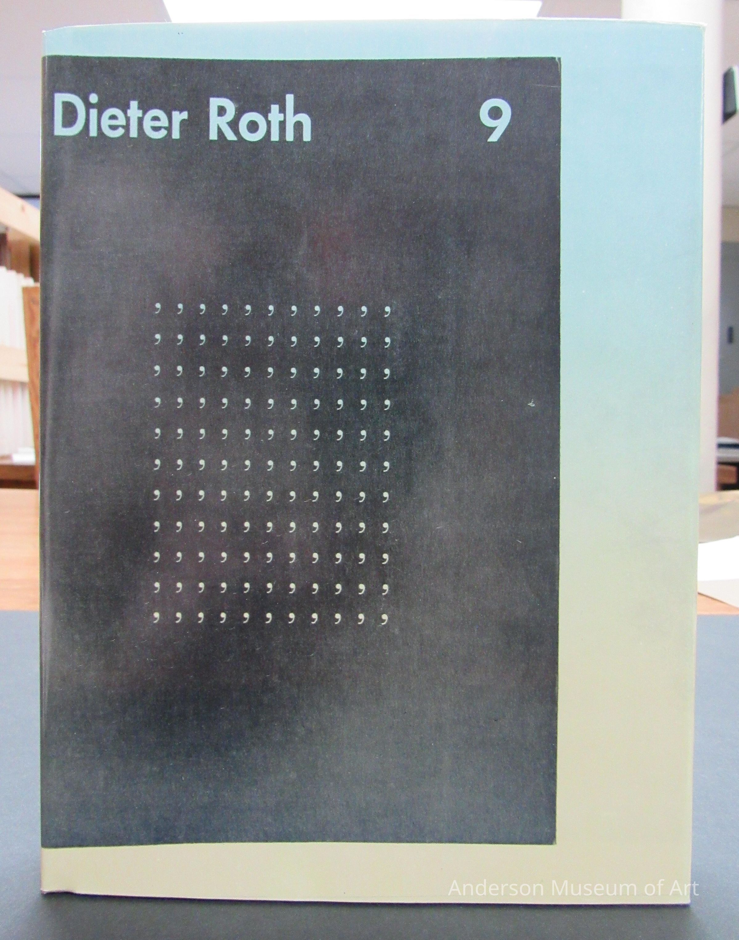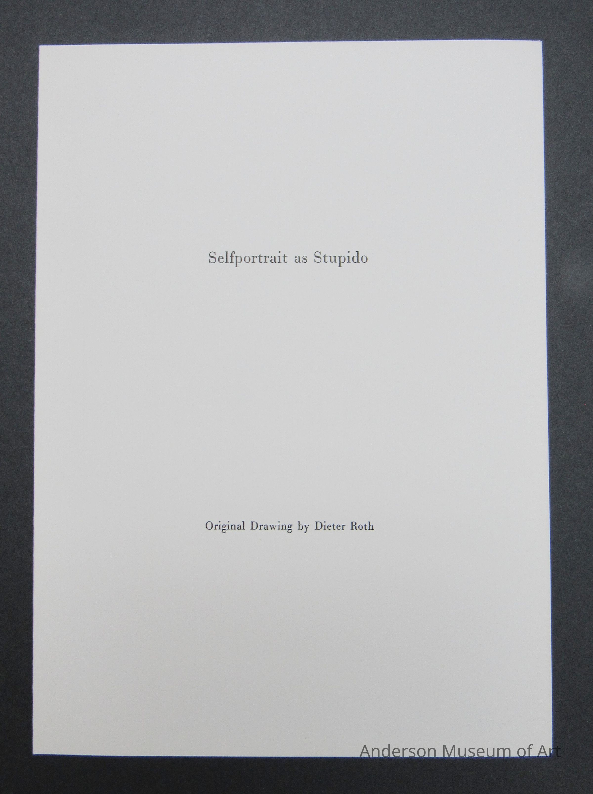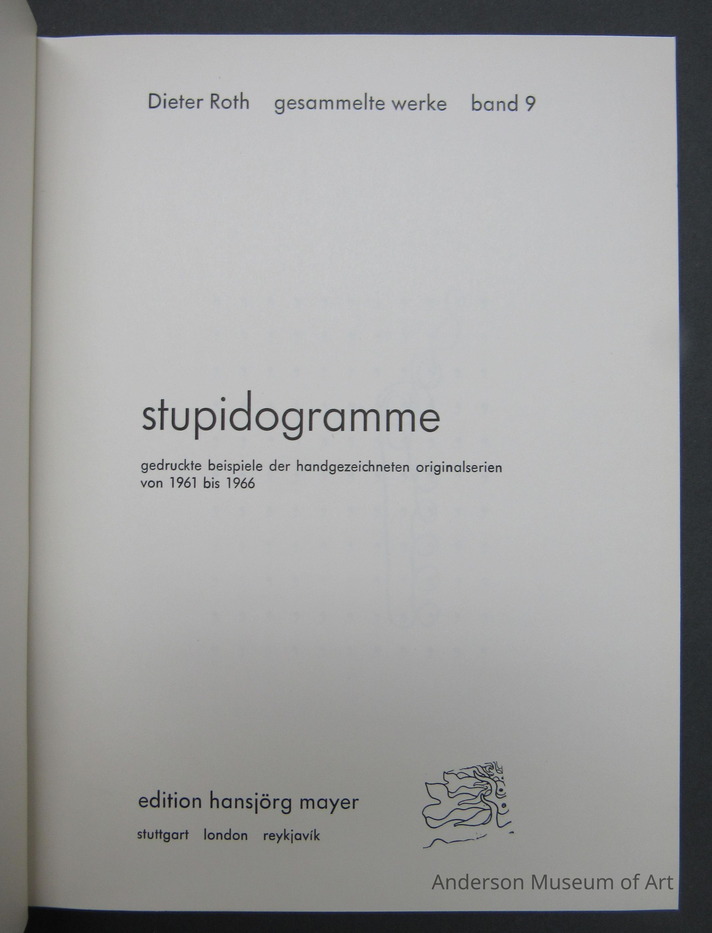 "Dieter Roth gesammelte werke band 9 / stupidogramme / gedruckte beispiele der handgezeichneten originalserien / von 1961 bis 1966" Book with a fading blue to green jacket cover. There is a black area that has a block of 11 x 11 colons. The entire book is pages of these 11 x 11 blocks with different drawings on them. Book comes with an original drawing "Selfportrait as Stupido / Original Drawing by Dieter Roth." The drawing is of the 11 x 11 block with six different colons circled in pencil. Signed and dated '80. Book fits into a brown slipcase. Edition Hansjorg Mayer. Copyright 1975. Printed in Germany.