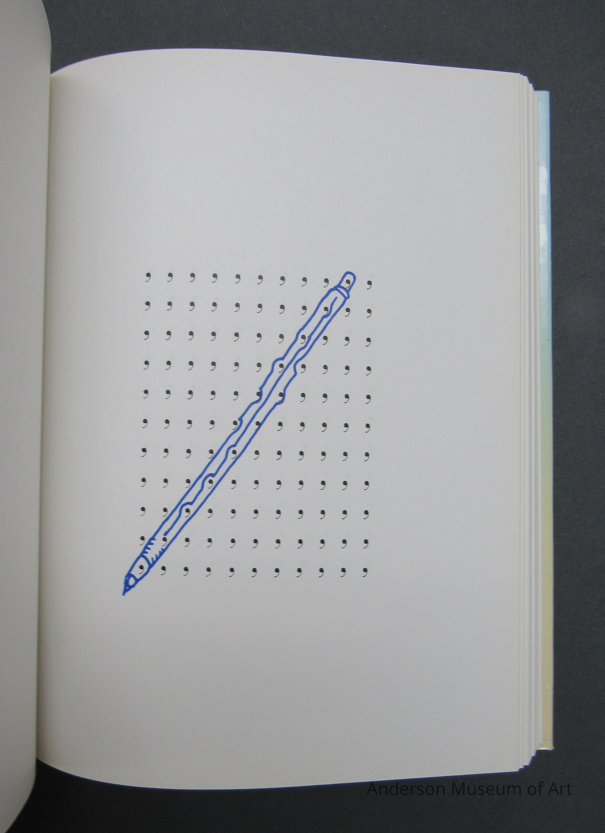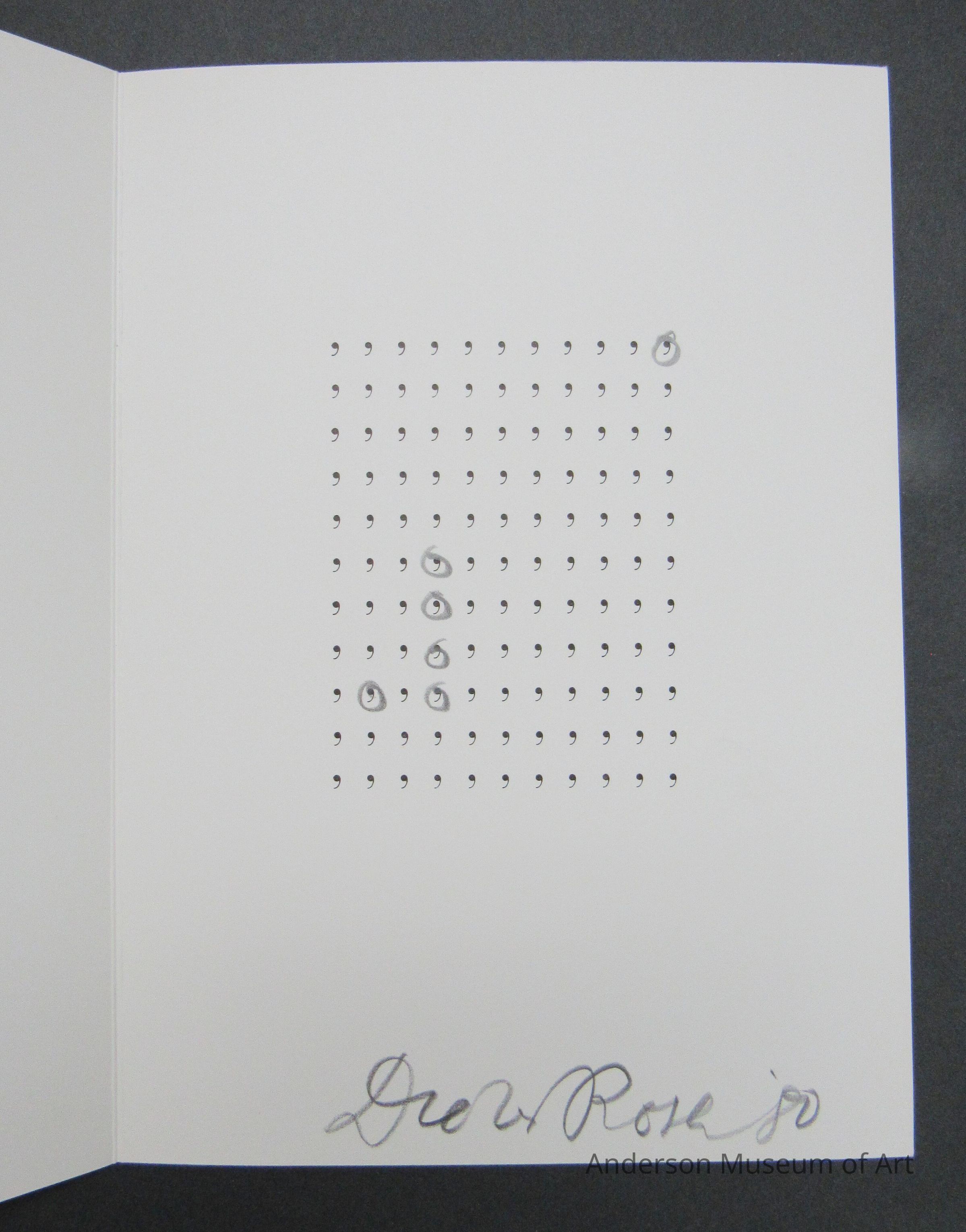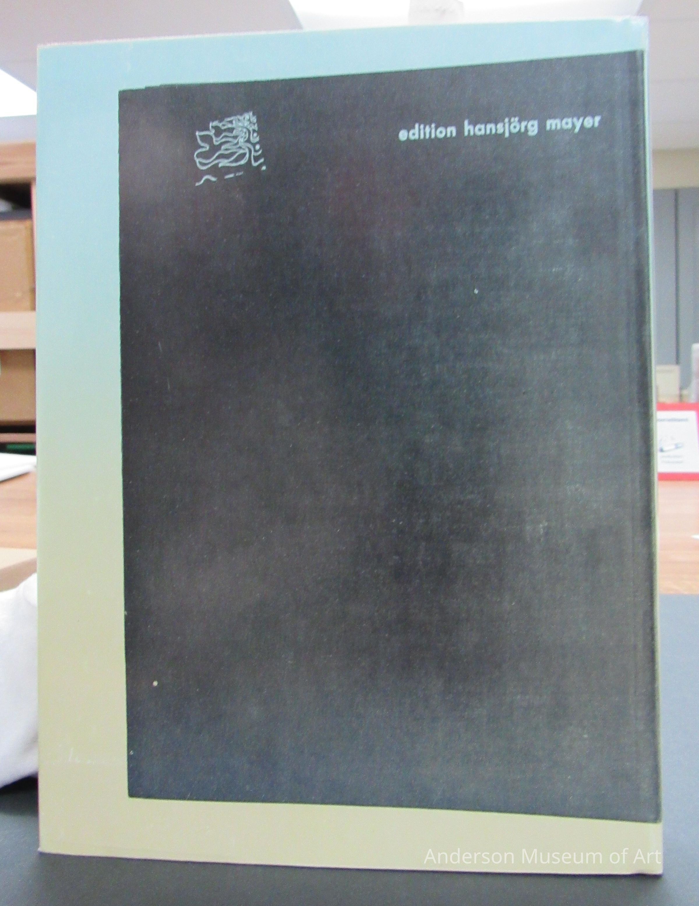 "Dieter Roth gesammelte werke band 9 / stupidogramme / gedruckte beispiele der handgezeichneten originalserien / von 1961 bis 1966" Book with a fading blue to green jacket cover. There is a black area that has a block of 11 x 11 colons. The entire book is pages of these 11 x 11 blocks with different drawings on them. Book comes with an original drawing "Selfportrait as Stupido / Original Drawing by Dieter Roth." The drawing is of the 11 x 11 block with six different colons circled in pencil. Signed and dated '80. Book fits into a brown slipcase. Edition Hansjorg Mayer. Copyright 1975. Printed in Germany.