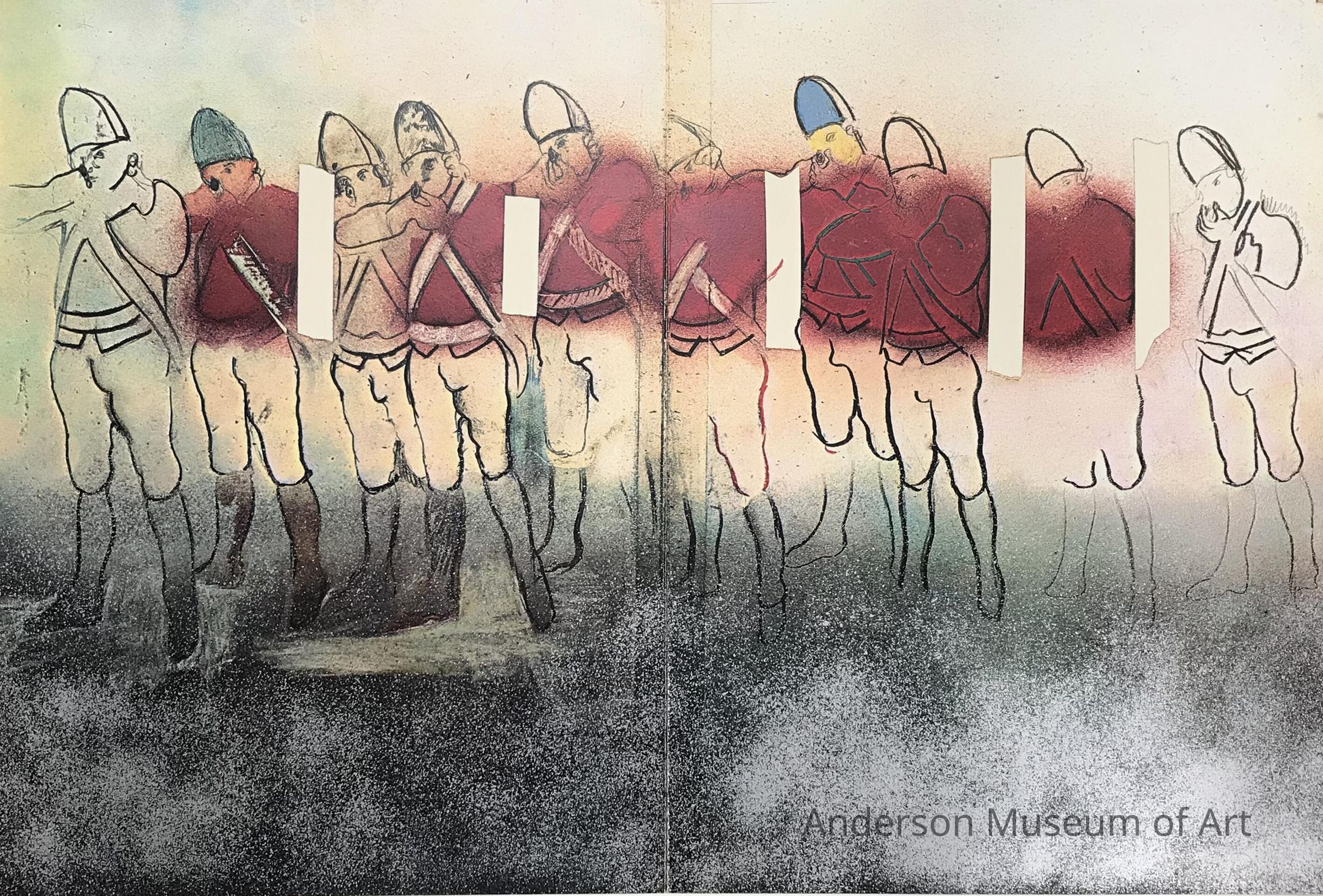 1979.14.1.9 - Those Who Fire, Those Who Run - Silver background with pink and blue highlights. At the top is a row of red coat soldiers. Below is a single soldier with two outlines to his left. At the bottom left corner is a raised image of a man hugging/holding another. They are outlined to the right. At the bottom right corner there is a soldier dragging a boy and their outline is to the left. Print 124/150 Rivers.